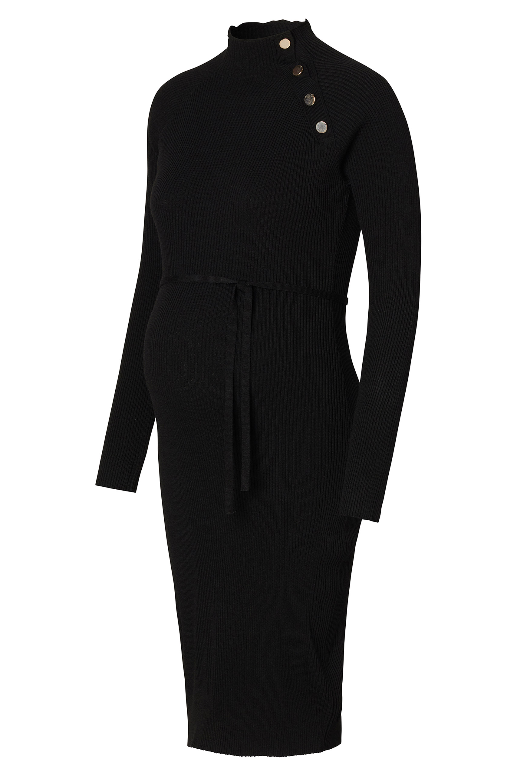 Geripptes Strick-Umstandskleid mit kurzem Stehkragen, dekorativer Knopfleiste und schmalen Bindeband. Dein Bauch wird in dem körpernah geschnittenen Kleid wunderbar betont und hat bis zur Geburt Platz zum Wachsen. Farbe: schwarz