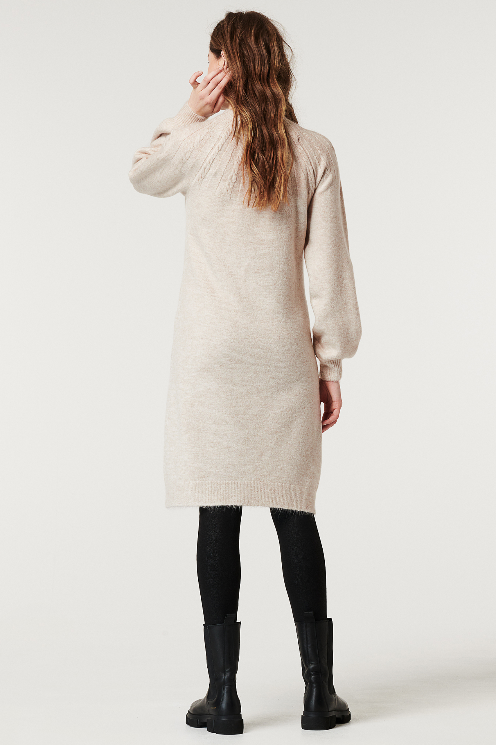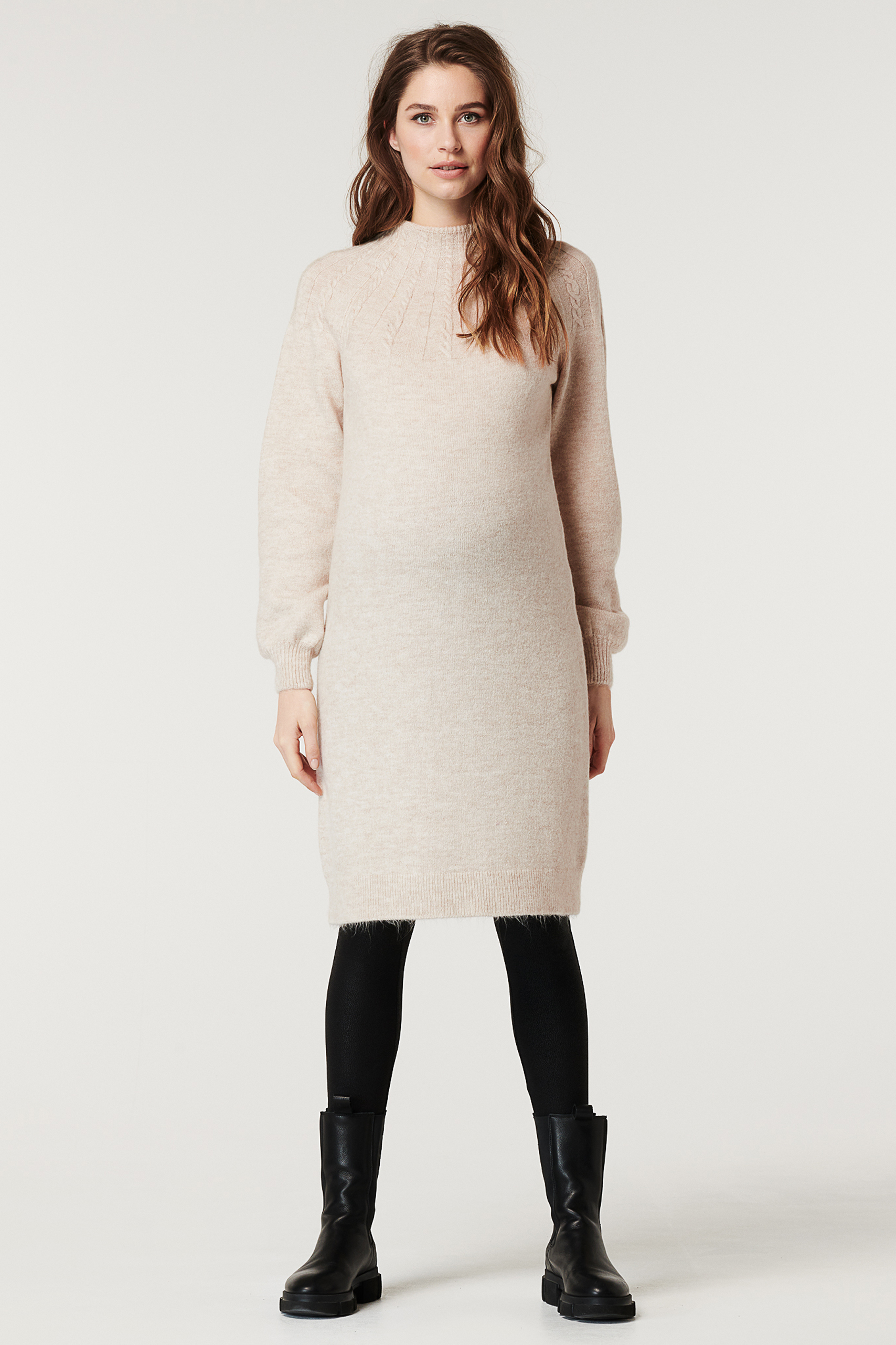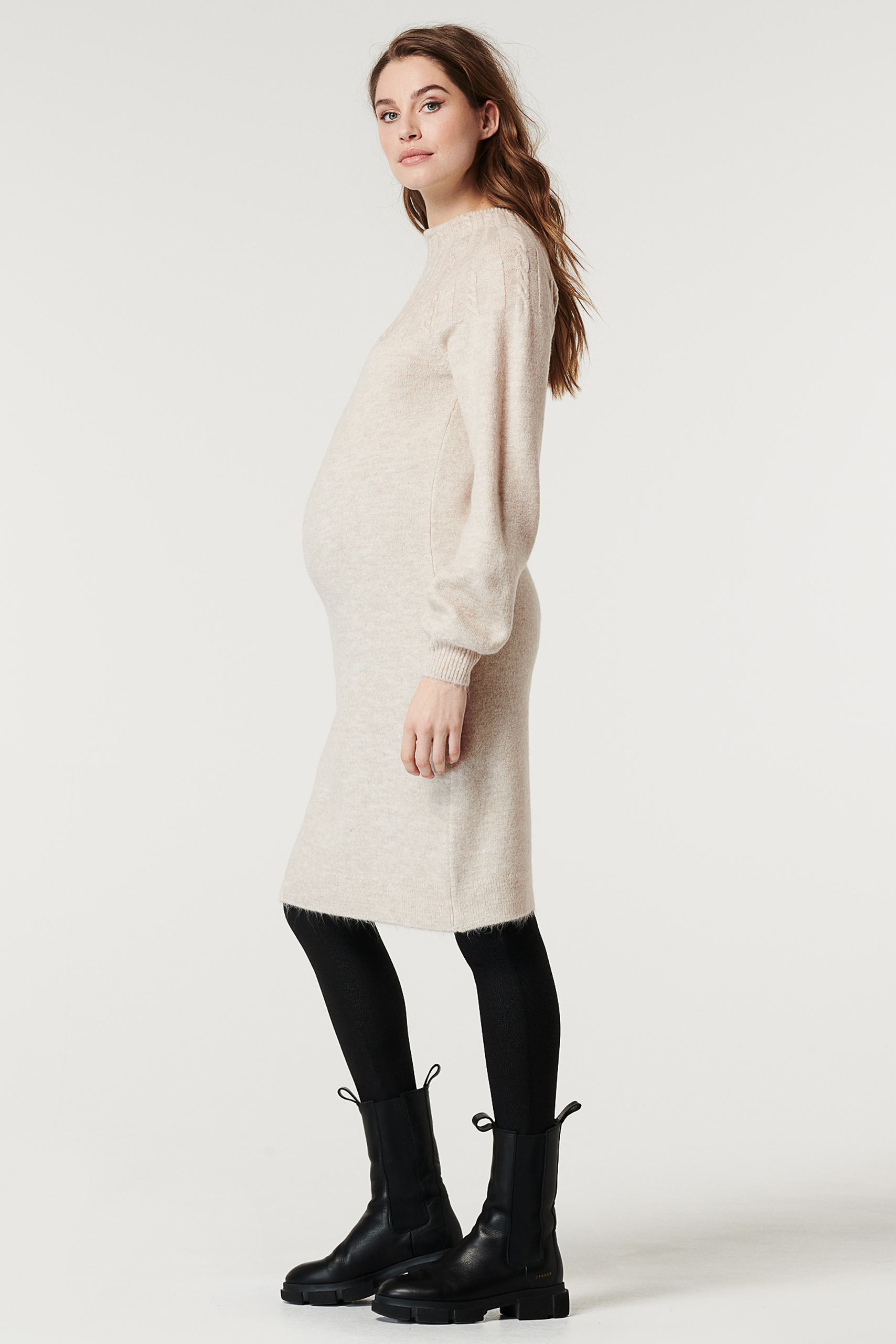 Strick-Umstandskleid mit Ballonärmeln und feinen Zopfstrick-Details am Oberteil. Dein Bauch wird in dem Kleid wunderbar betont und hat bis zur Geburt genügend Spielraum. Farbe: creme
