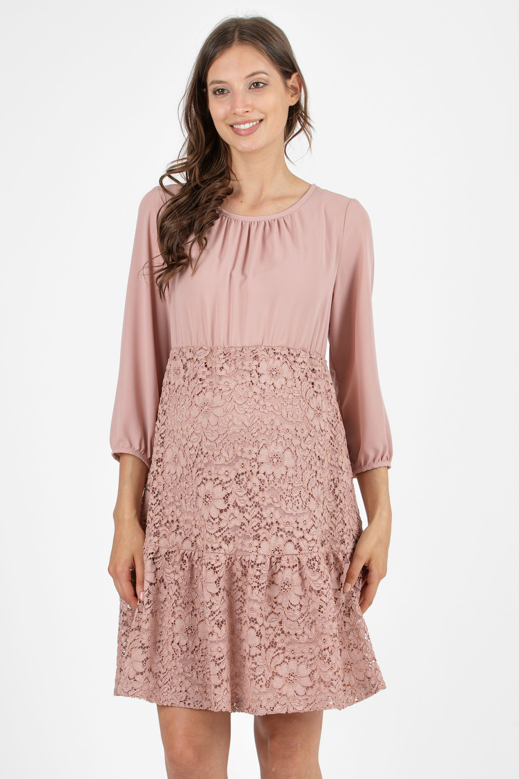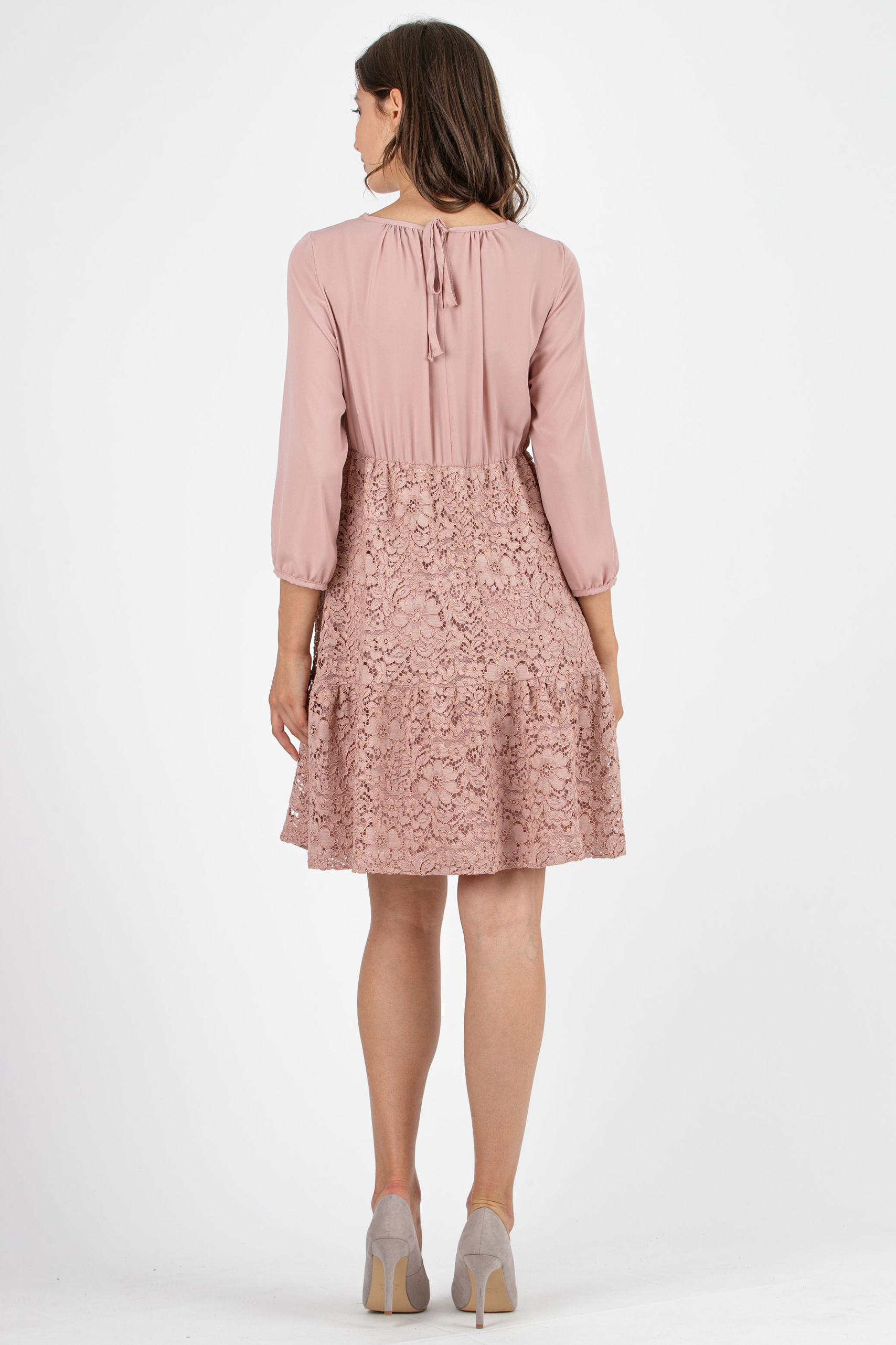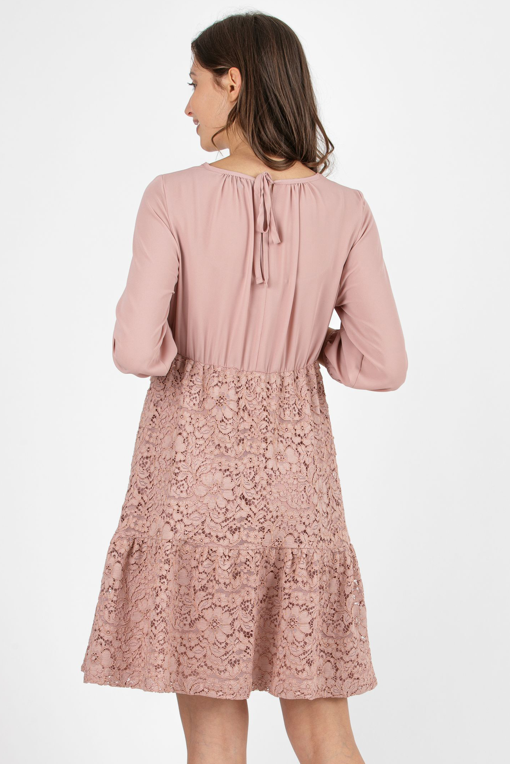 Umstandskleid mit 3/4 Ballonärmeln und Stufenrock aus floraler Spitze. Das Kleid aus einem softem Materialmix aus Viskose und Baumwolle wird im Nacken mit einer Schleife geschlossen. Der Schnitt lässt deinem Babybauch viel Platz zum Wachsen. Farbe: rosa