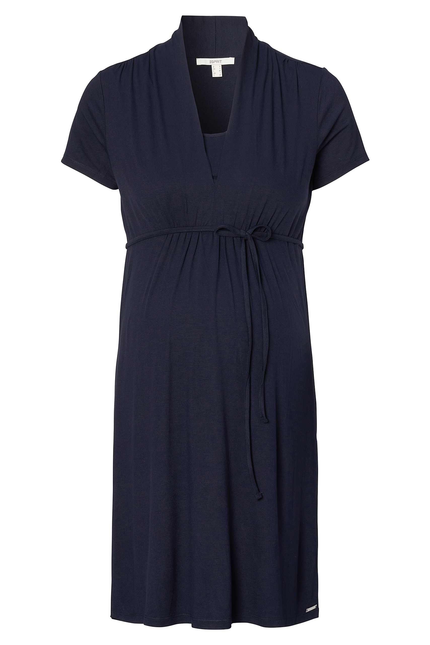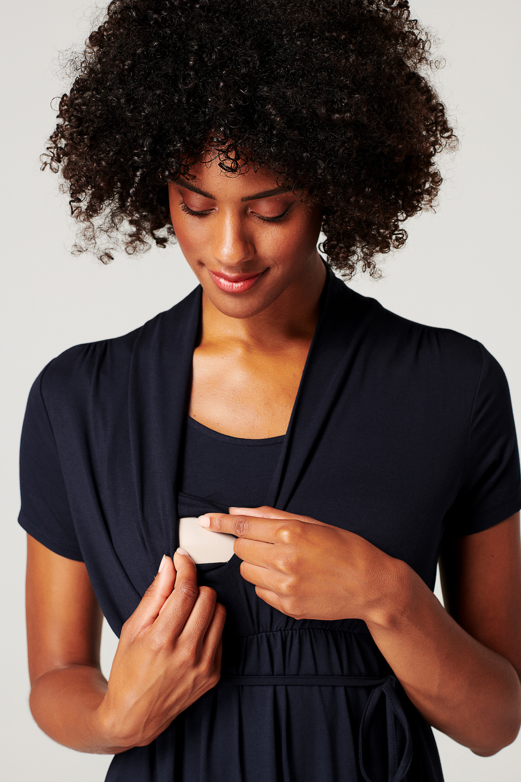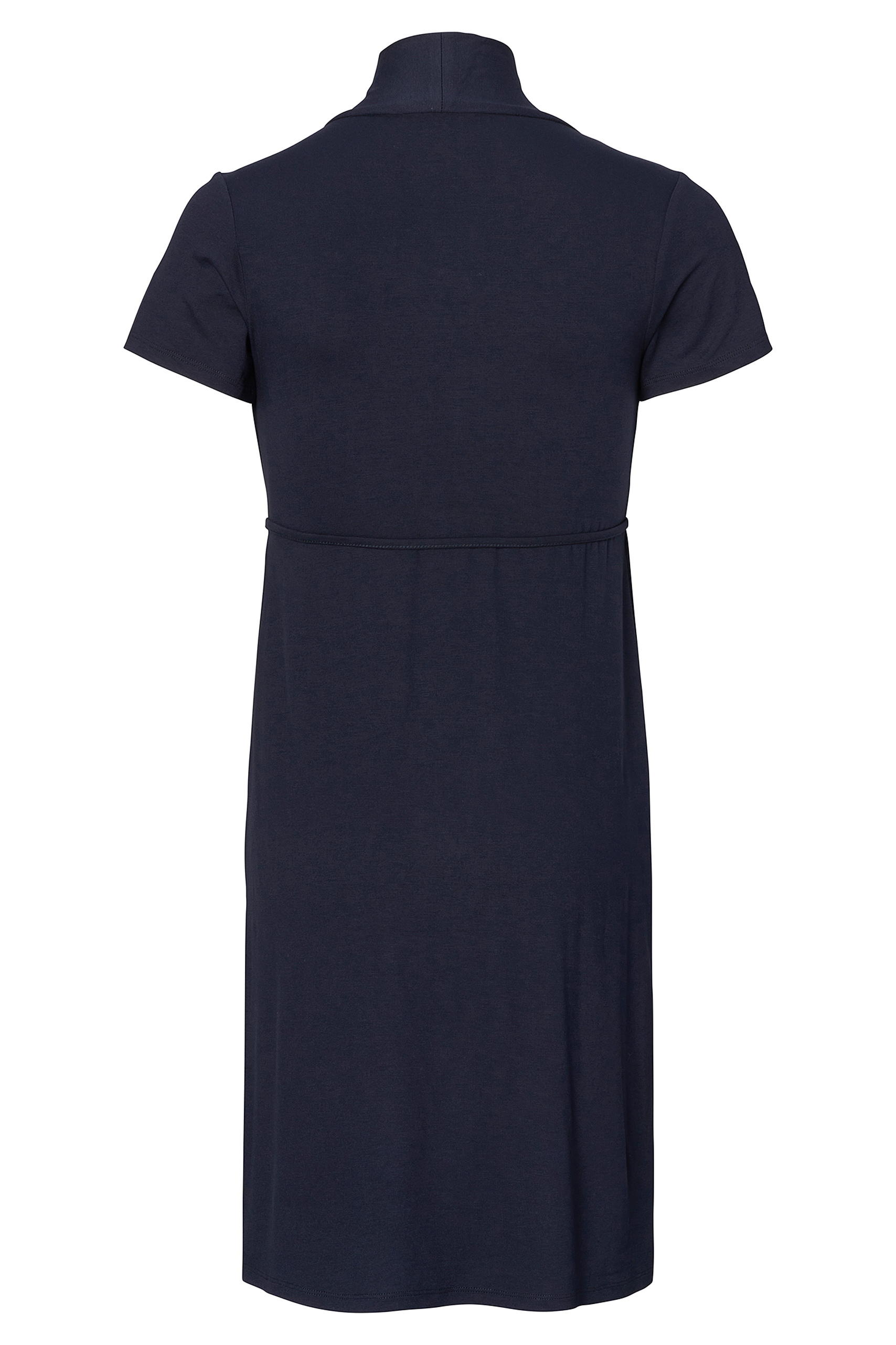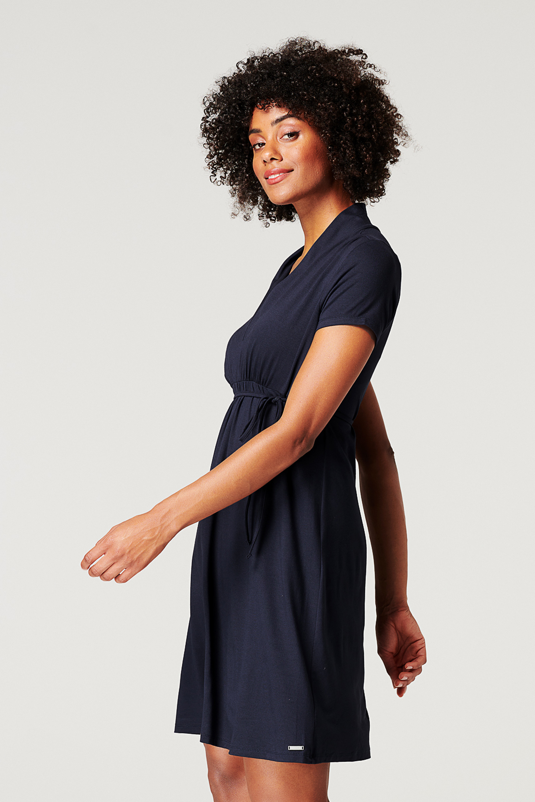 Umstands- und Stillkleid mit V-Ausschnitt und kurzen Ärmeln aus weicher Viskose. Das elastische Material und der Schnitt in A-Linie bieten deinem Babybauch genügend Platz, um darin bequem zu wachsen. Ein praktischer Kordelzug in der Taille betont die Körpermitte und sorgt dafür, dass du das Kleid perfekt an deine Figur anpassen kannst. Stille dein Baby nach der Geburt einfach und bequem darin, indem du die Stofflagen des Oberteils auseinander schiebst. Farbe: navy