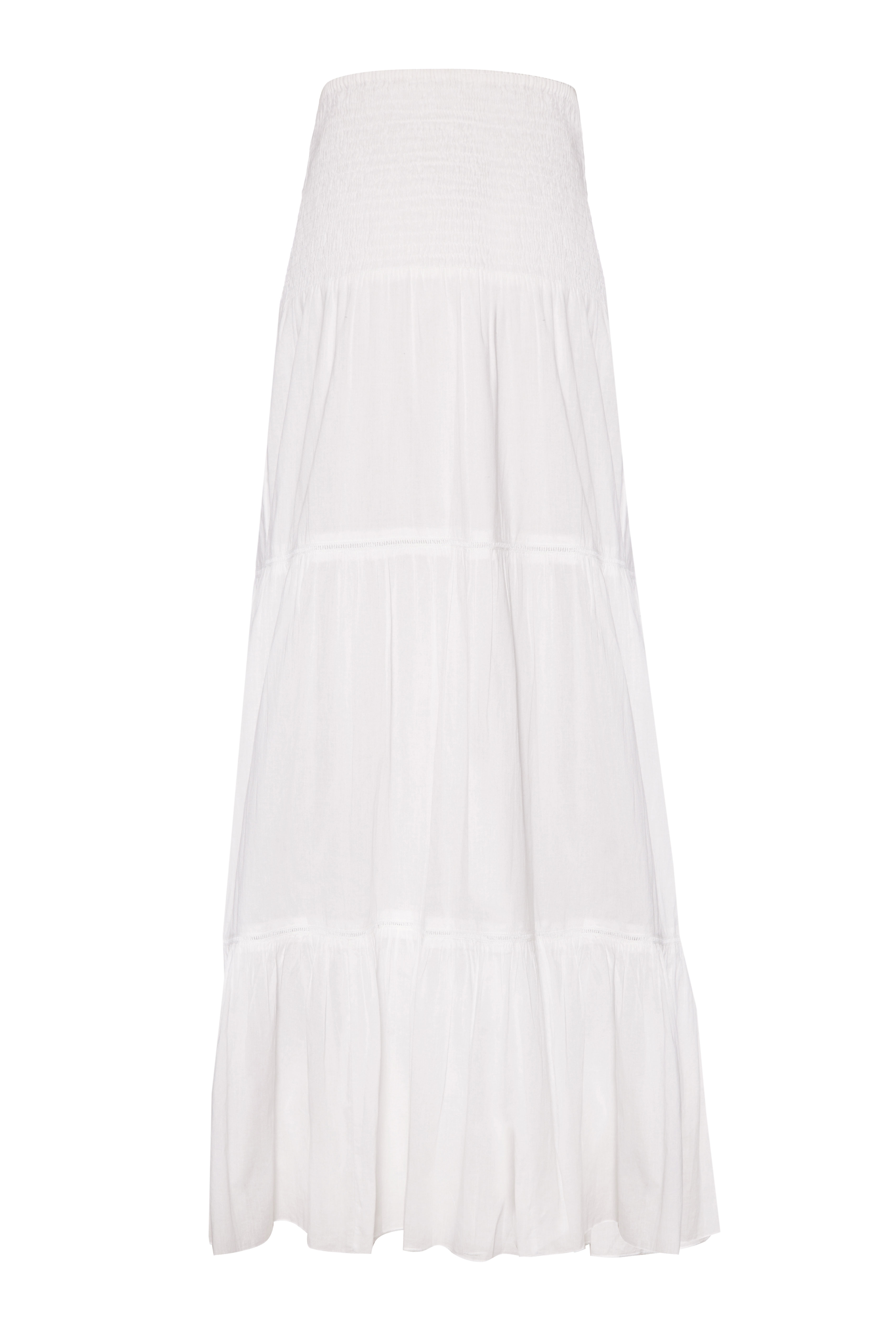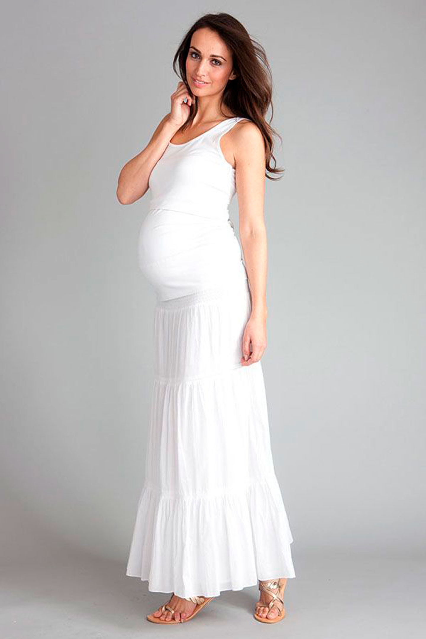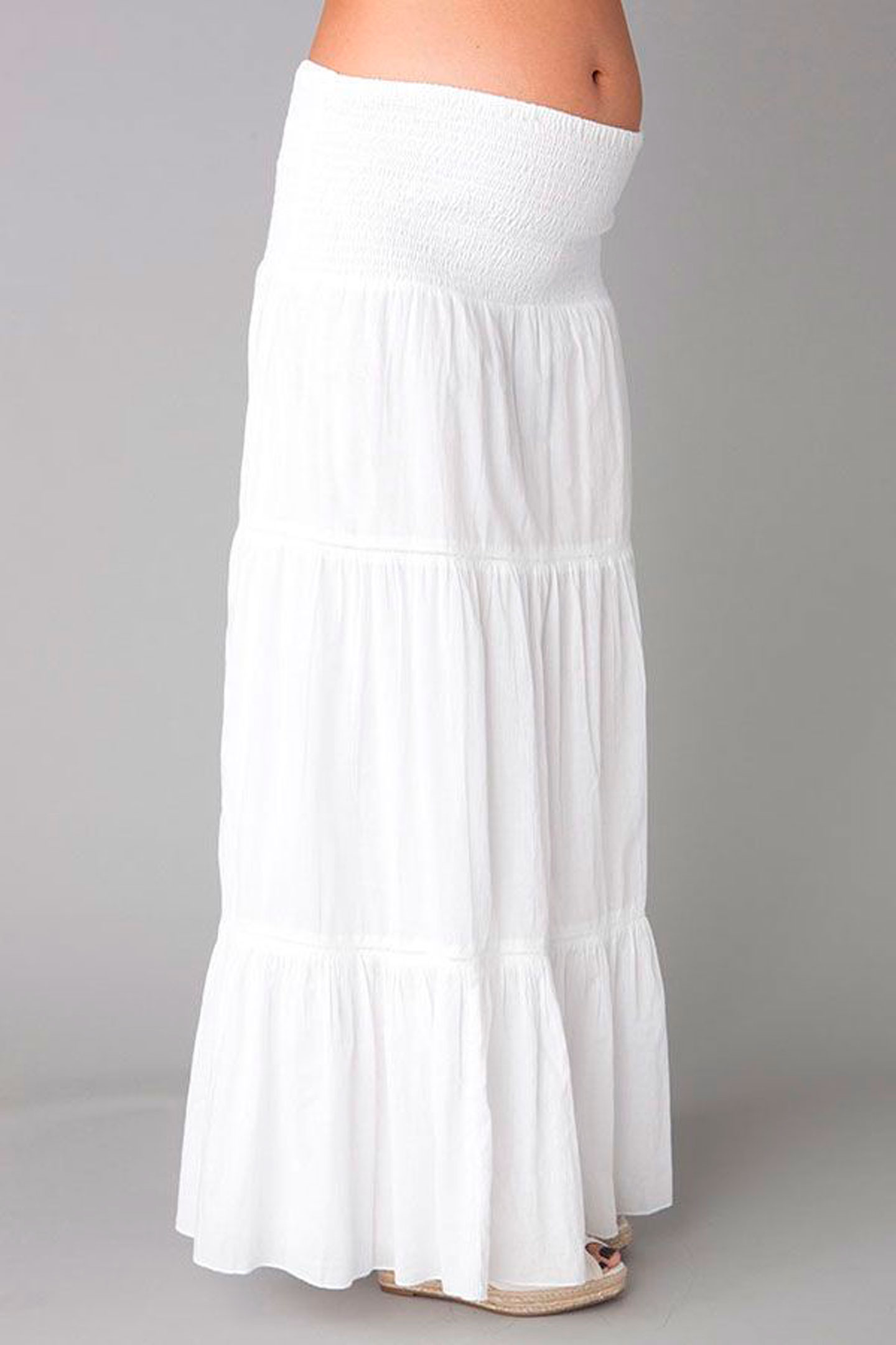 Volant Umstandsrock in trendiger Maxi-Länge, der auch als Bandeau-Kleid getragen werden kann. Mit gesmoktem, elastischem Bund, der sich deinem Babybauch besonders gut anpasst. Farbe: weiß