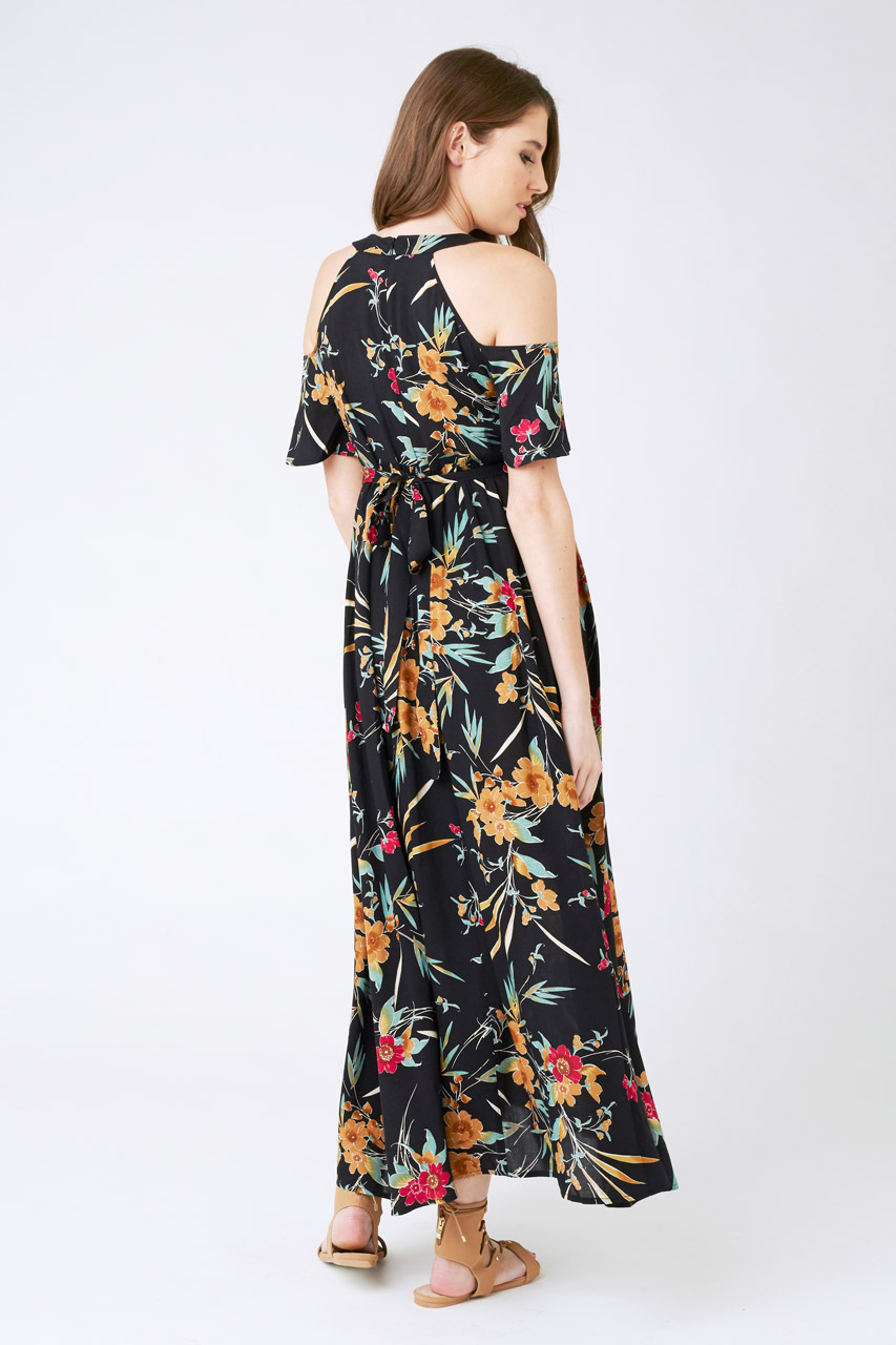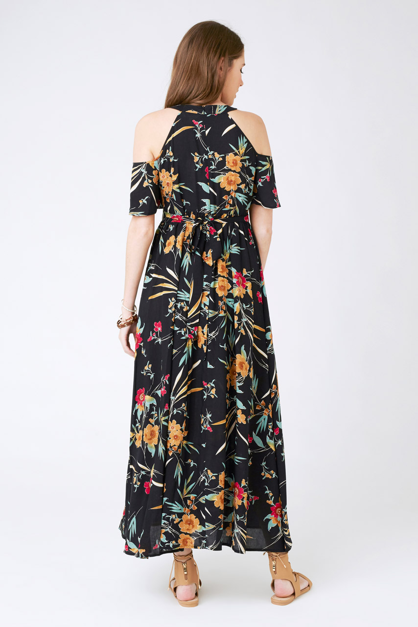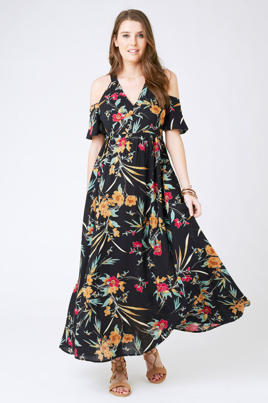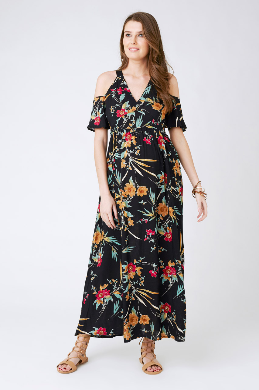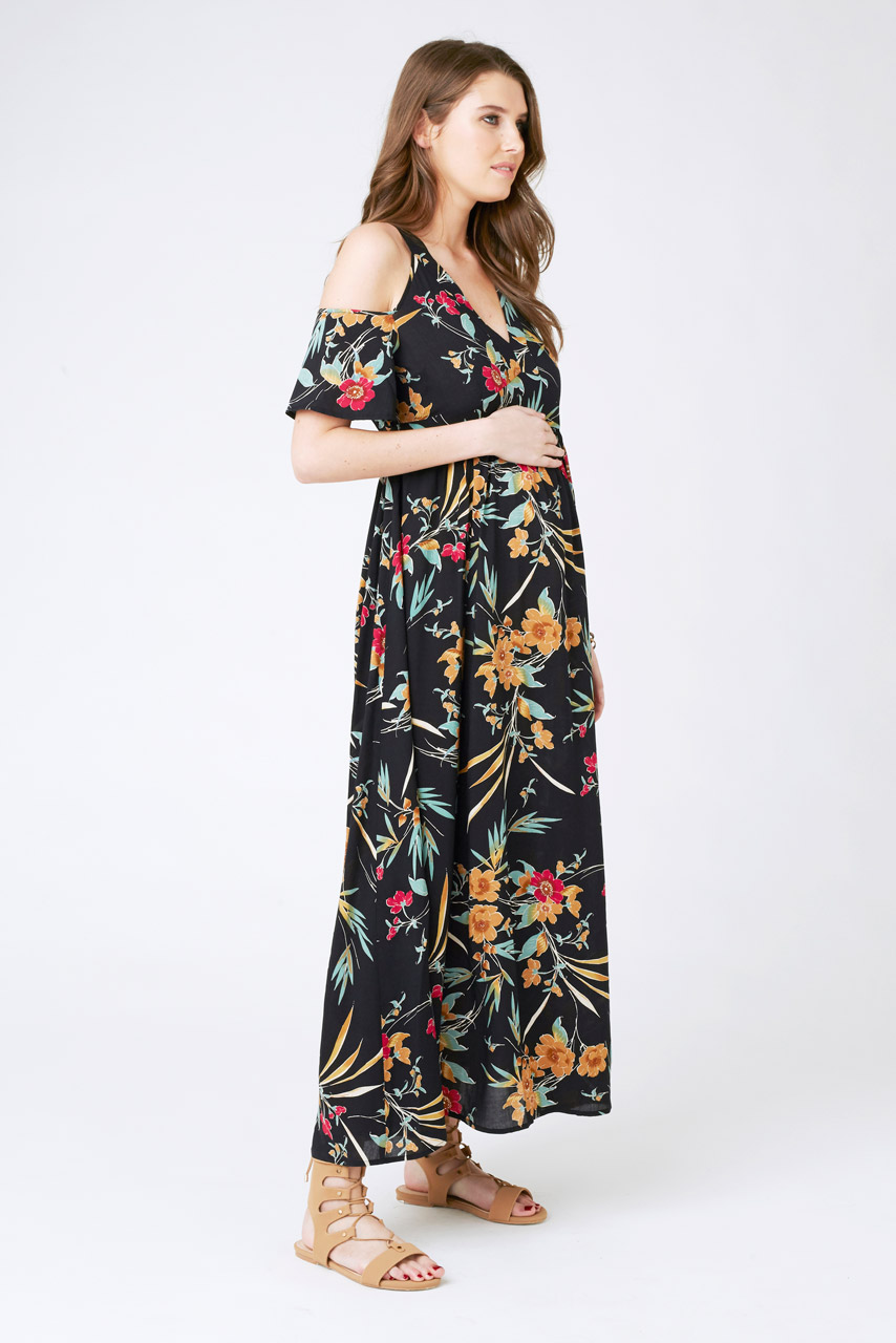 Maxi Umstandskleid mit angesagten Cut-Outs an der Schulter, floralem Print und V-Ausschnitt. Das Kleid wird am Rücken mit einem Reißverschluss geschlossen.
