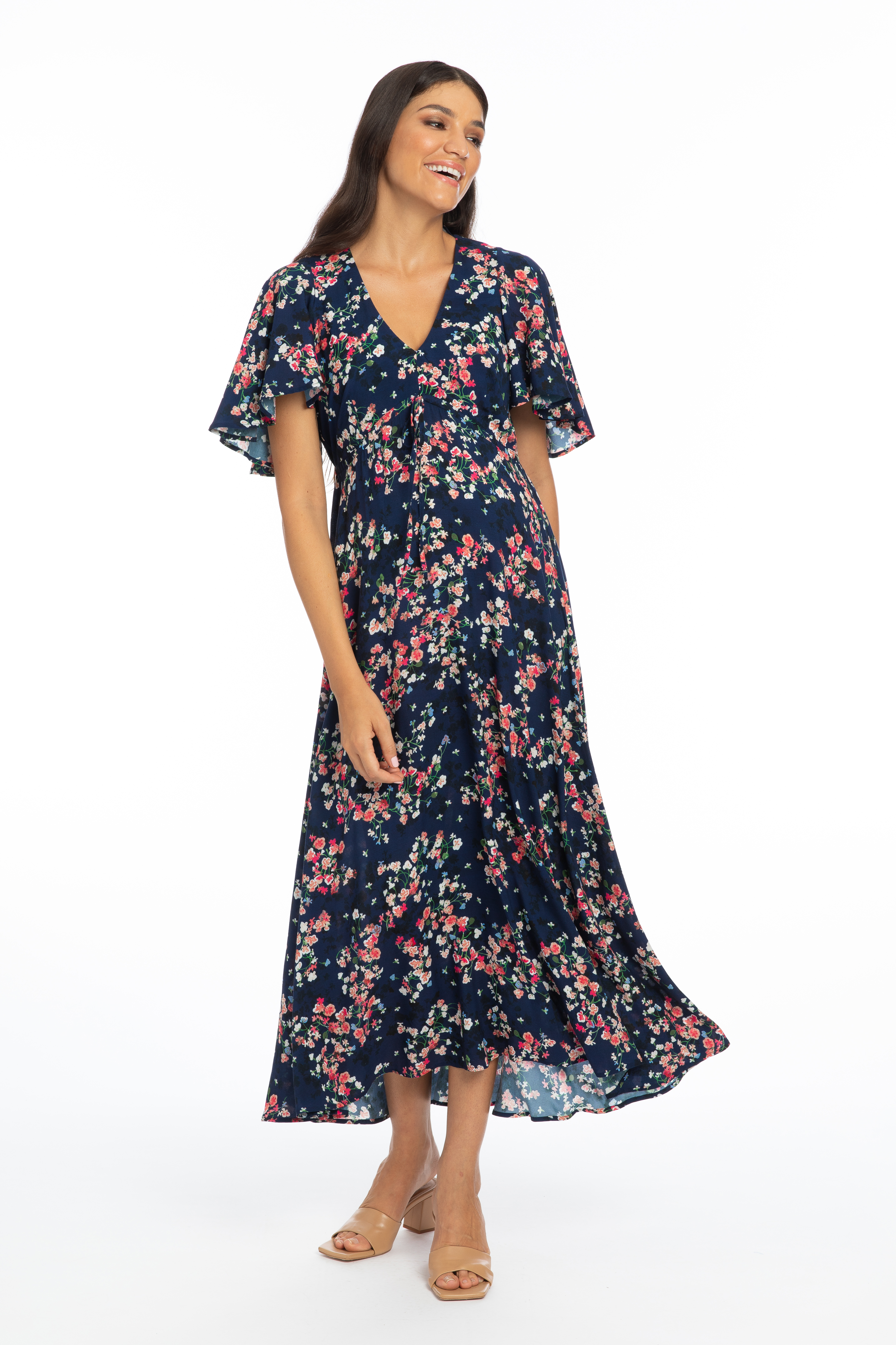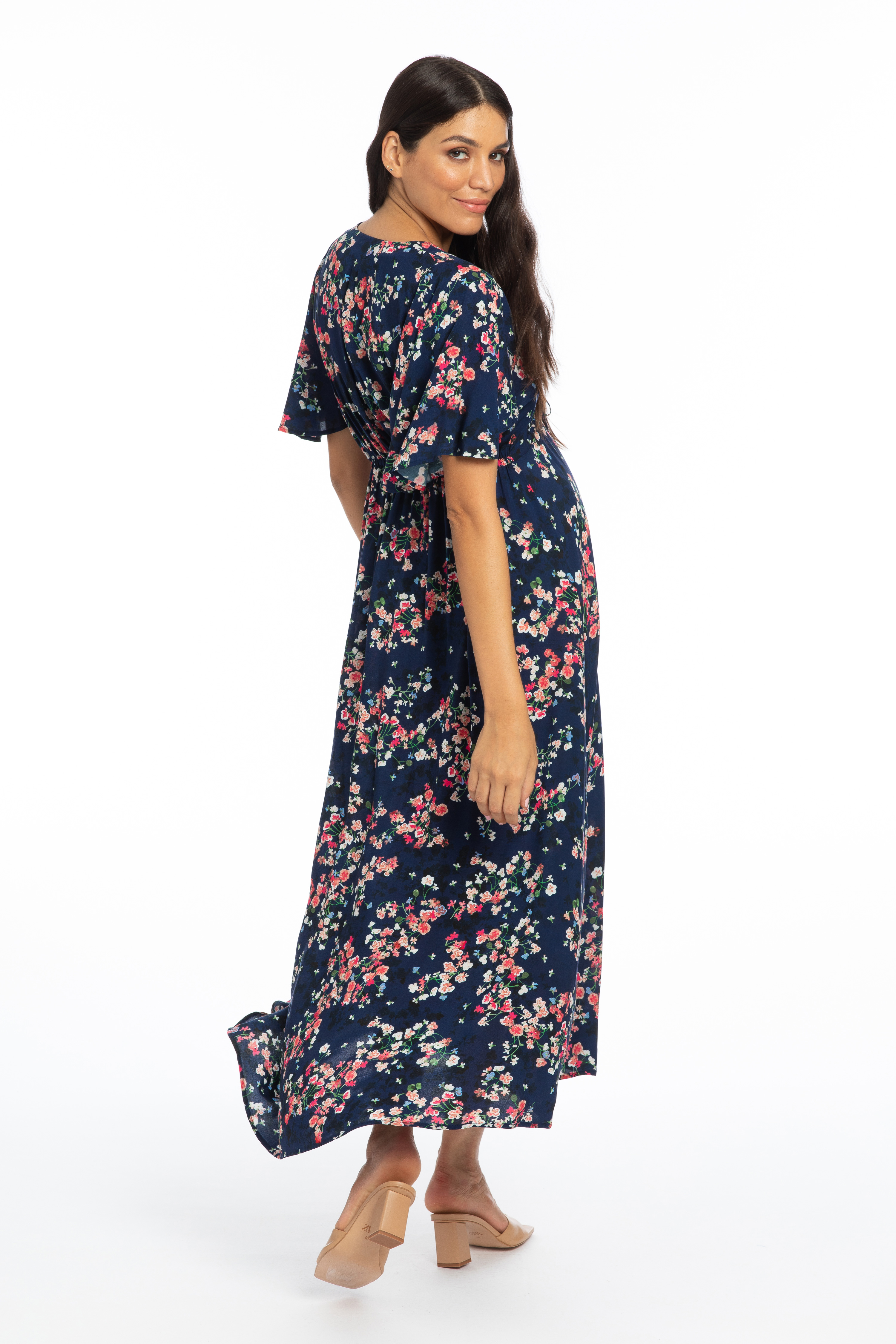 Langes Umstandskleid aus weicher Viskose mit wunderschönen Flügelärmeln, die dem Kleid einen besonders femininen Look verleihen. Über eine Bindung unter der Brust kannst du das Kleid individuell an deine sich verändernde Figur anpassen. Der lange Rock schwingt beim Gehen wunderbar mit. Auch ohne Babybauch sieht das Kleid toll aus, sodass du es auch nach der Schwangerschaft noch bequem weitertragen kannst. Länge: ca. 135cm. Farbe: dunkelblau/print