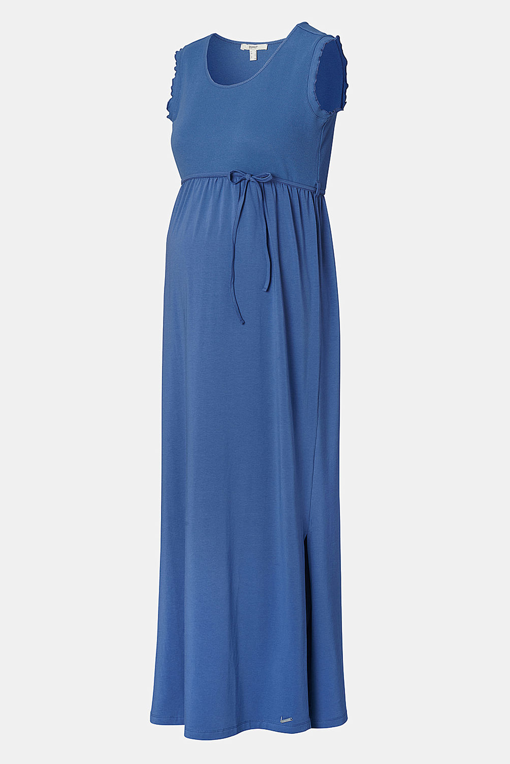 Organic Maxi Umstandskleid mit integriertem Taillengürtel, Beinschlitz und kleinen Rüschen an den Schultern. Der weiche Jersey-Stoff aus Bio-Baumwolle fällt locker über deinen wachsenden Babybauch. Durch den Taillengürtel lässt sich das Kleid ideal an deine Silhouette anpassen, egal ob mit oder ohne Babybauch. Farbe: blau