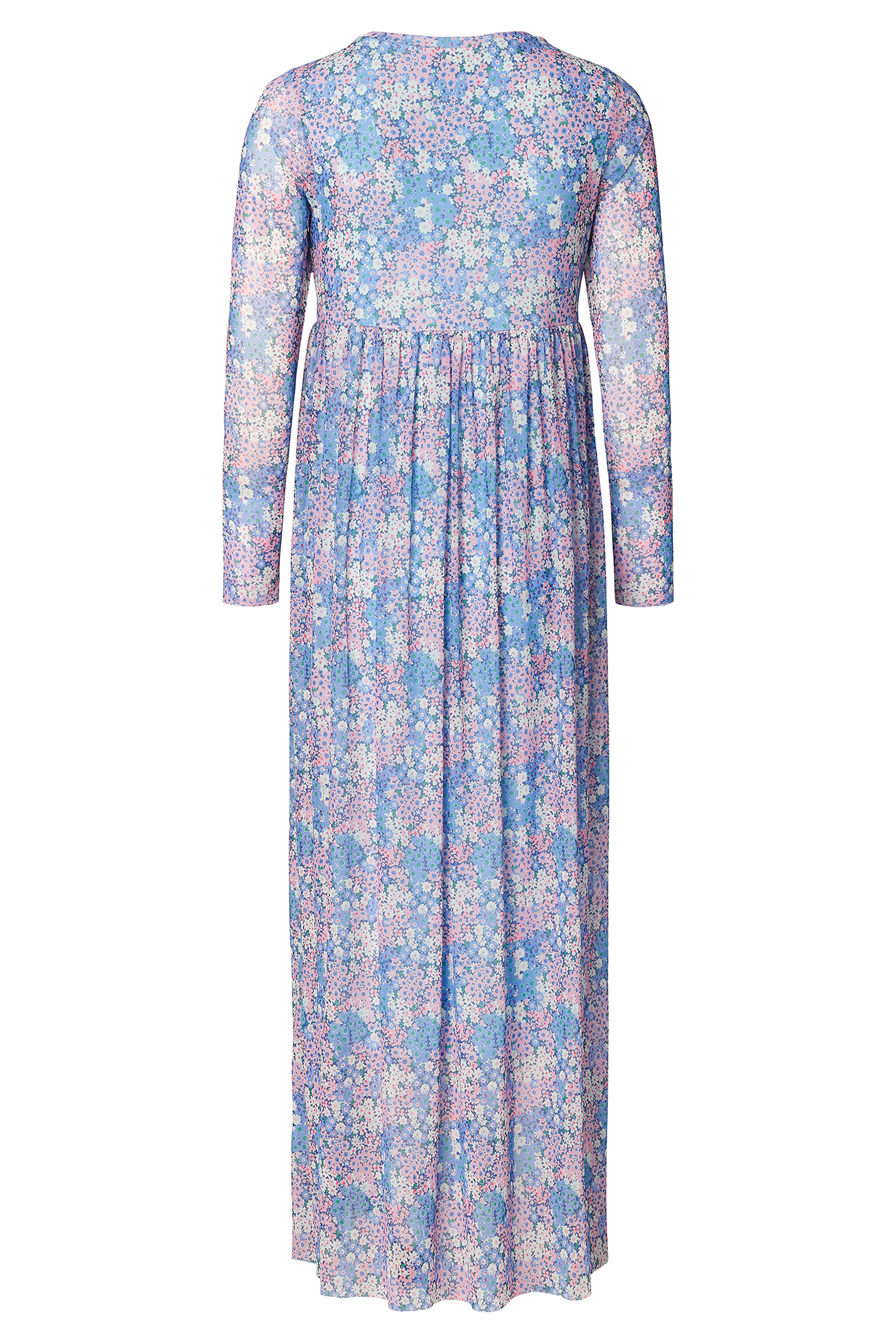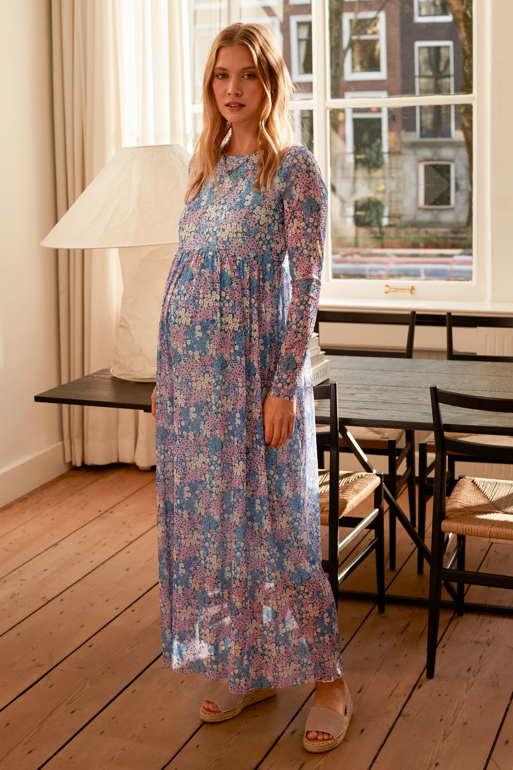 Maxi Umstandskleid mit transparenten Ärmeln und Überkleid mit Blumenprint. Die elastische Taille betont sehr schön deine Empire Linie und der transparente Stoff an den Ärmeln macht das Kleid zu einem Highlight. Farbe: hellblau
