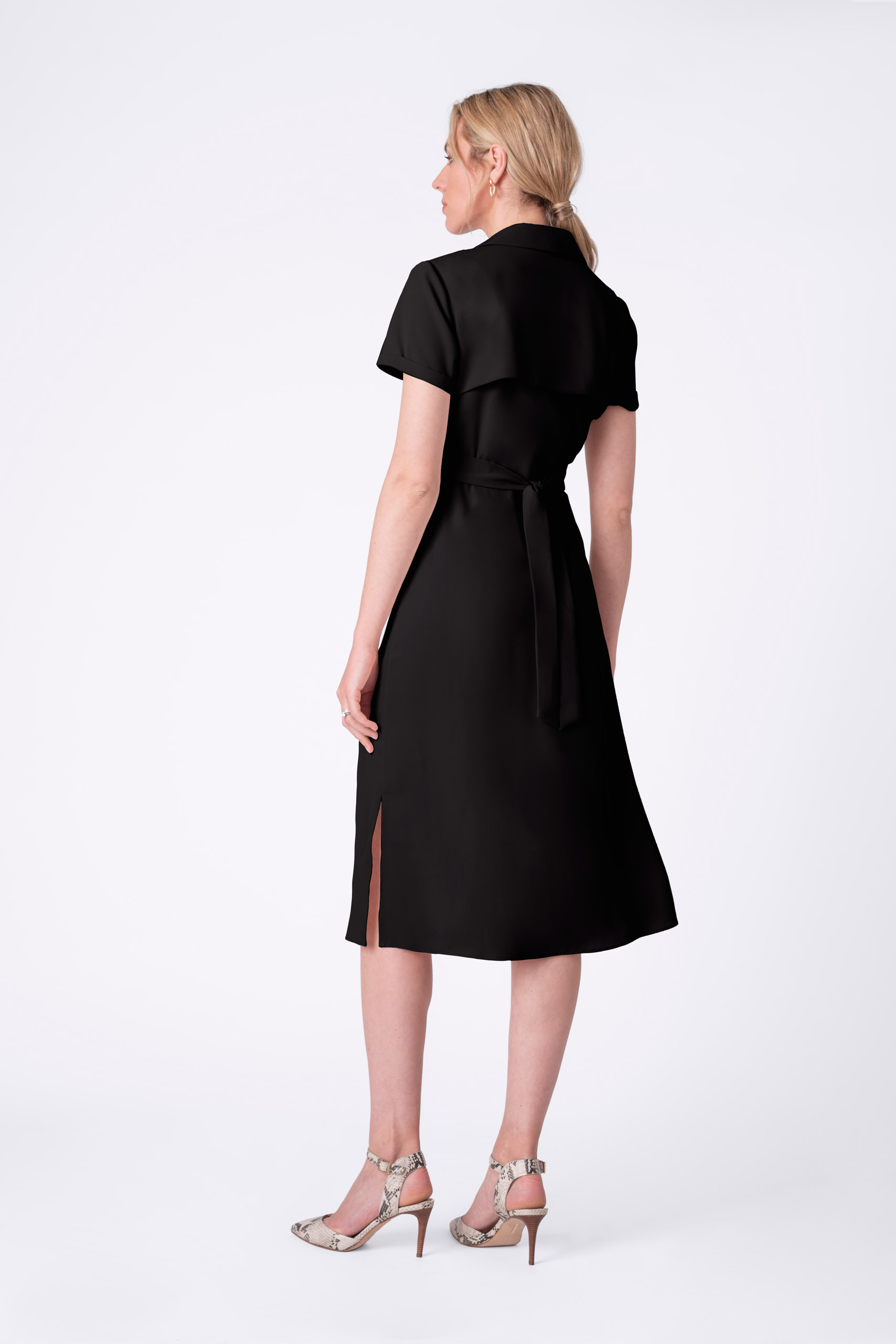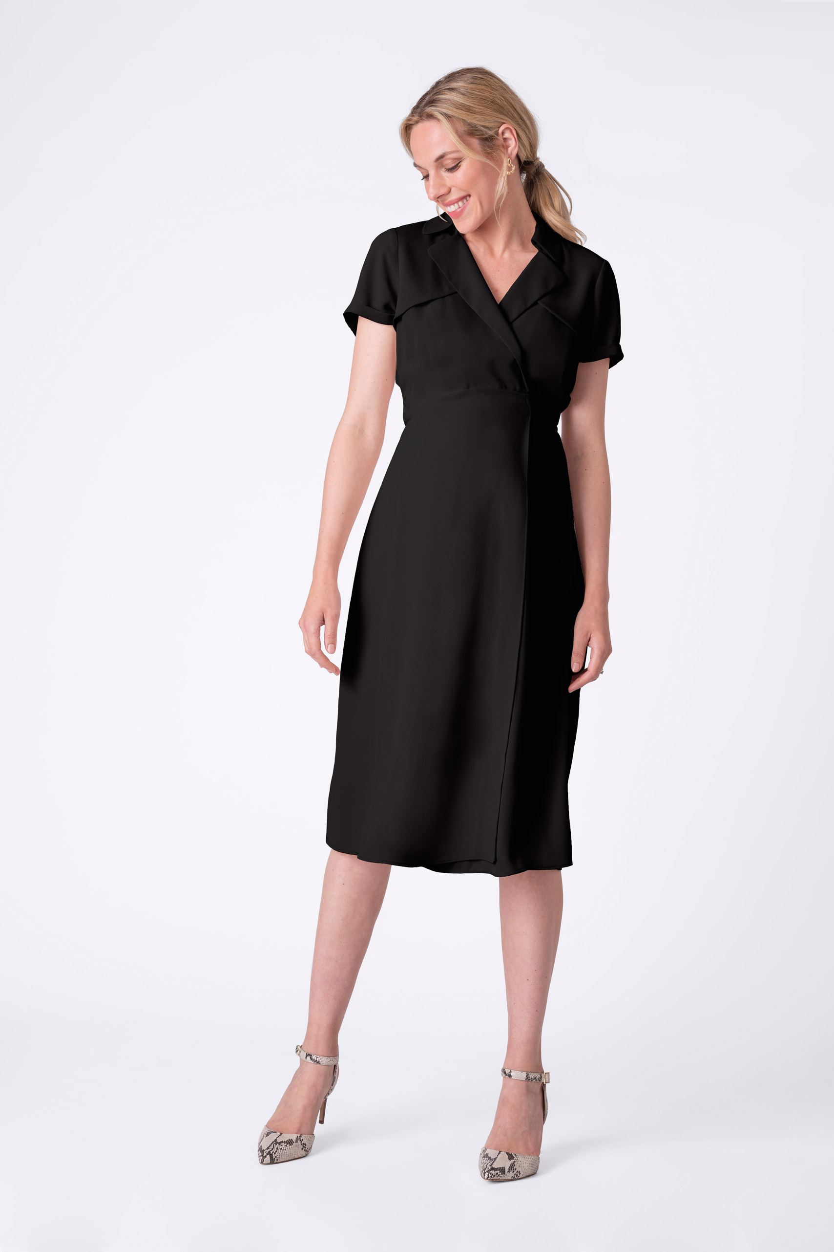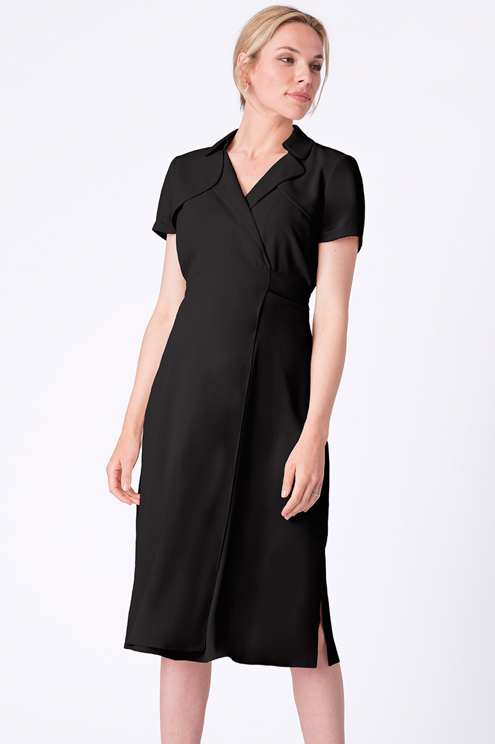 Umstands- und Stillkleid aus fließendem und leichtem Stoff mit schönem Reverskragen und kurzen Ärmeln mit Umschlag. Der schwingende Rock mit seitlichen Schlitzen lässt deinen Bauch in der gesamten Schwangerschaft bequem mitwachsen und wird elegant betont. Farbe: schwarz