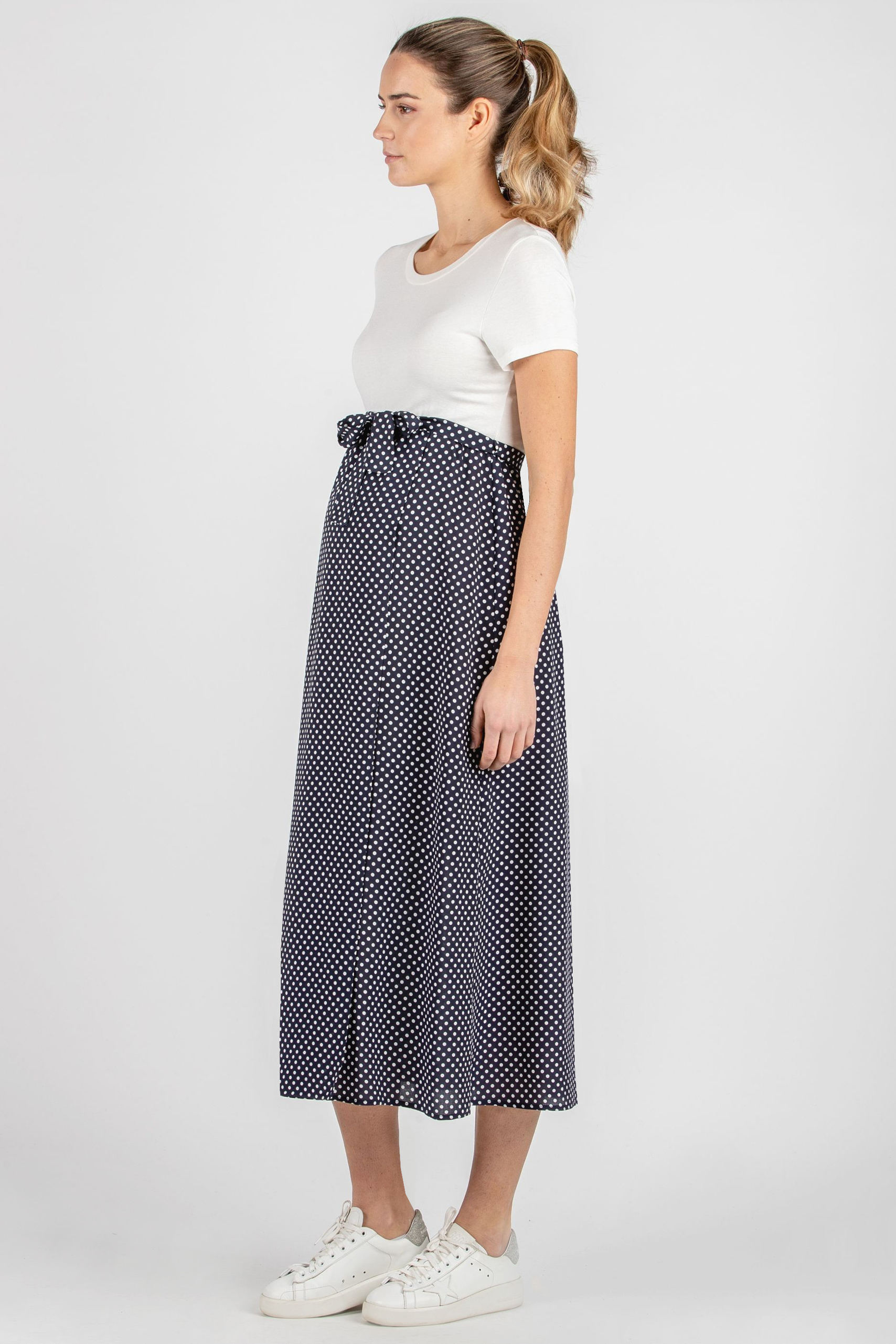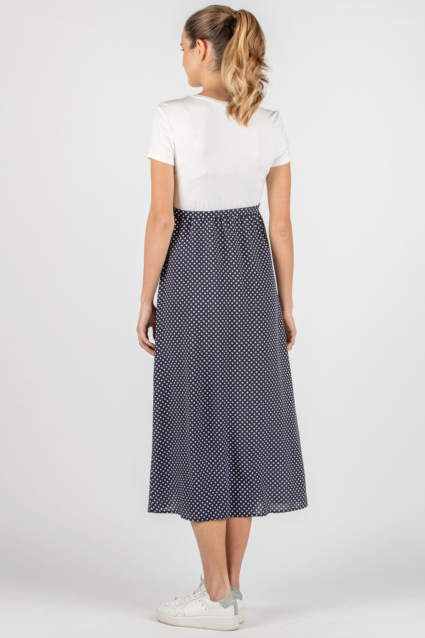 Umstandskleid mit Jerseytop und einem leichten Rockteil mit Punkte Print. Der clevere Schnitt und fließende Stoff aus leichter Viskose sorgen für reichlich Platz für deinen wachsenden Babybauch. Farbe: weiß/navy print
