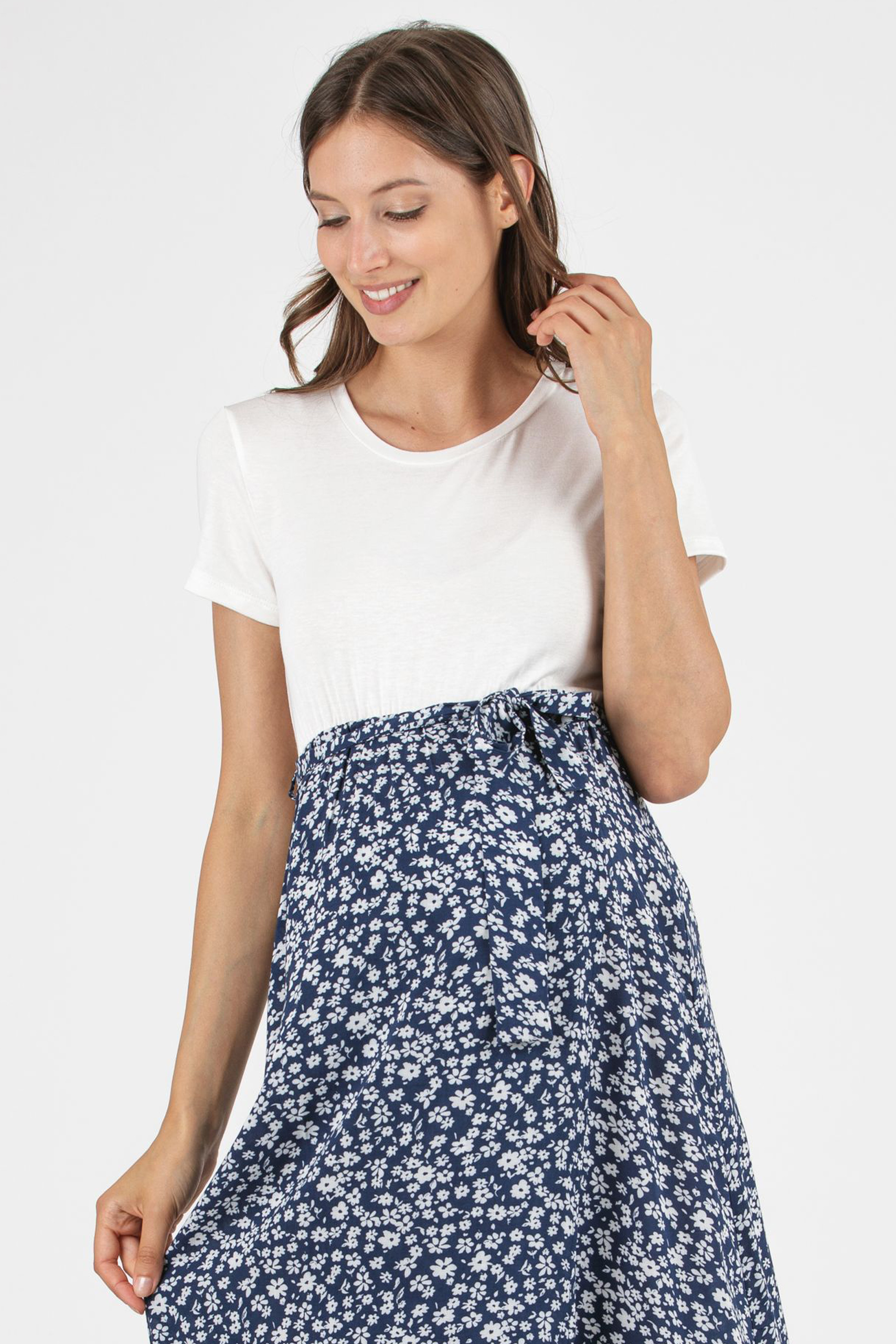 Umstandskleid mit Jerseytop und einem leichten Rockteil mit Blumen Print. Der clevere Schnitt und fließende Stoff aus leichter Viskose sorgen für reichlich Platz für deinen wachsenden Babybauch. Farbe: weiß/navy print