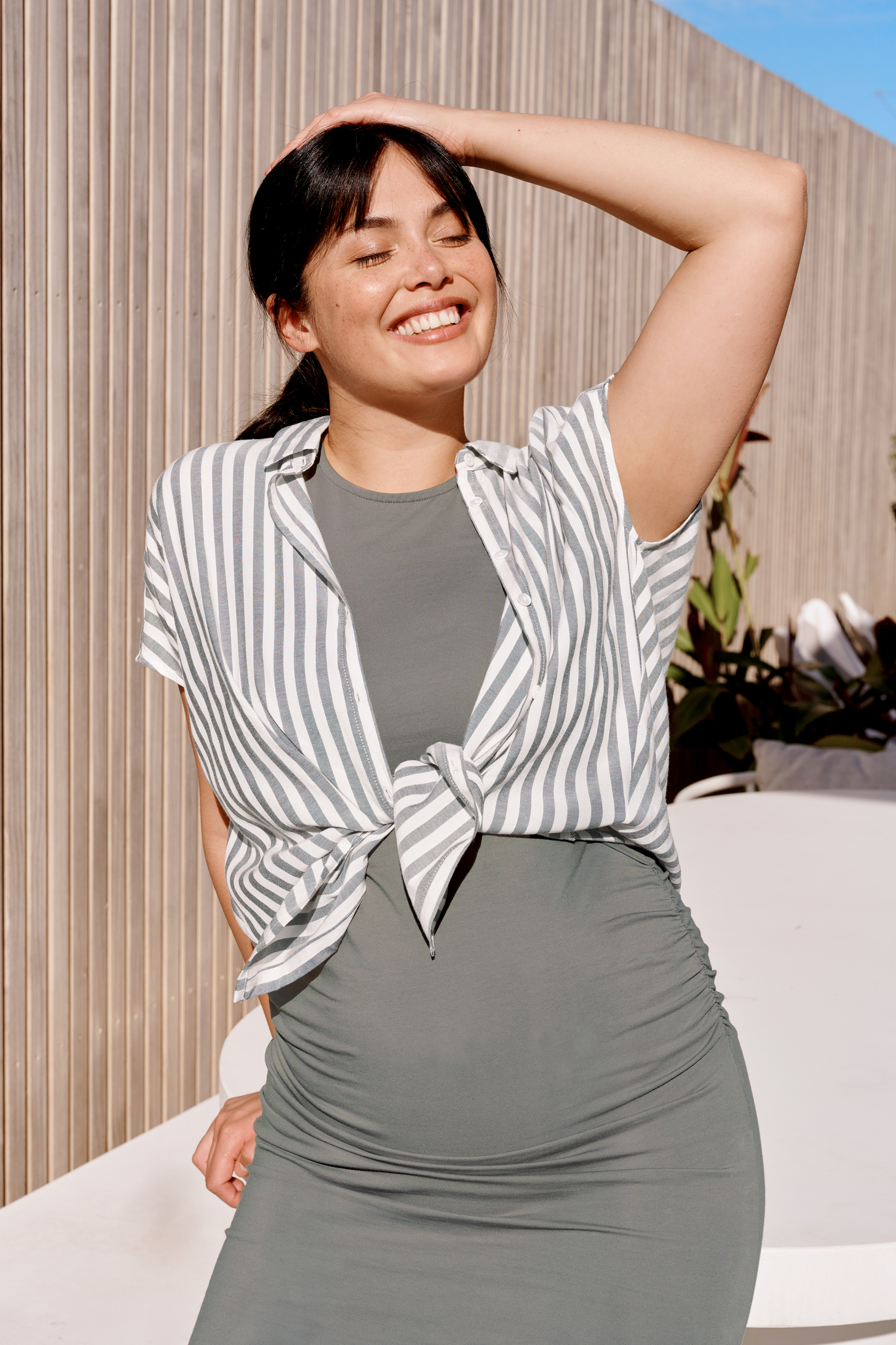 Organic Umstands-und Stillkleid aus weicher Bio-Baumwolle mit versteckter Stillöffnung. Durch die Raffung an den Hüften und dem taillierten Schnitt des Kleides, passt es sich perfekt an deine Silhouette an. Über das doppellagige Oberteil erhältst du einen schnellen und einfachen Zugang, um dein Baby jederzeit stillen zu können. Farbe: khaki