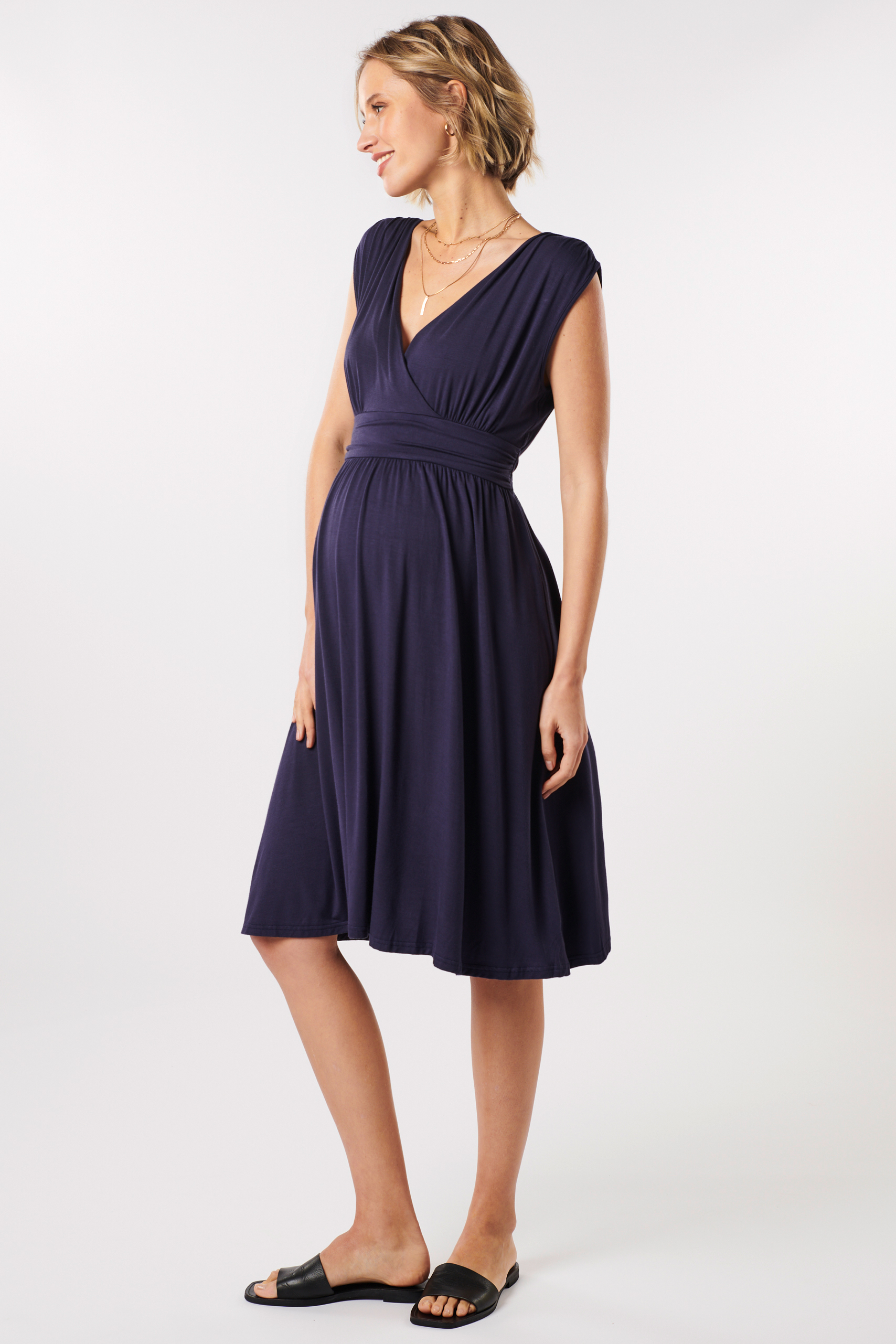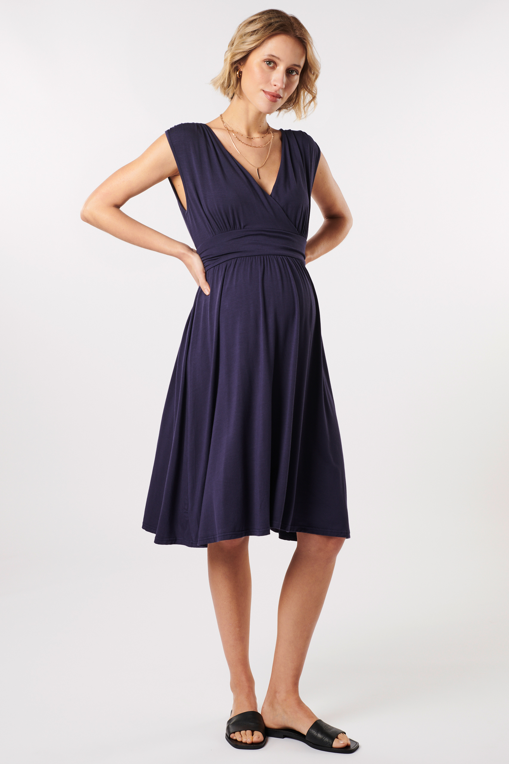 Ärmelloses Umstands- und Stillkleid aus weicher und elastischer Viskose, mit V-Ausschnitt und integriertem Bindegürtel. Durch diesen kannst du das Kleid flexibel an deine Silhouette anpassen, egal mit oder auch ohne Babybauch. Der schwingende Rockteil und der tiefe Rückenausschnitt machen das Kleid zu einem absolutem Sommer Favorite. Nach der Geburt erhältst du dank dem praktischen Cache-Coeur Ausschnitt einen schnellen und einfachen Stillzugang indem du die überlappenden Stofflagen beiseite schiebst. Farbe: navy