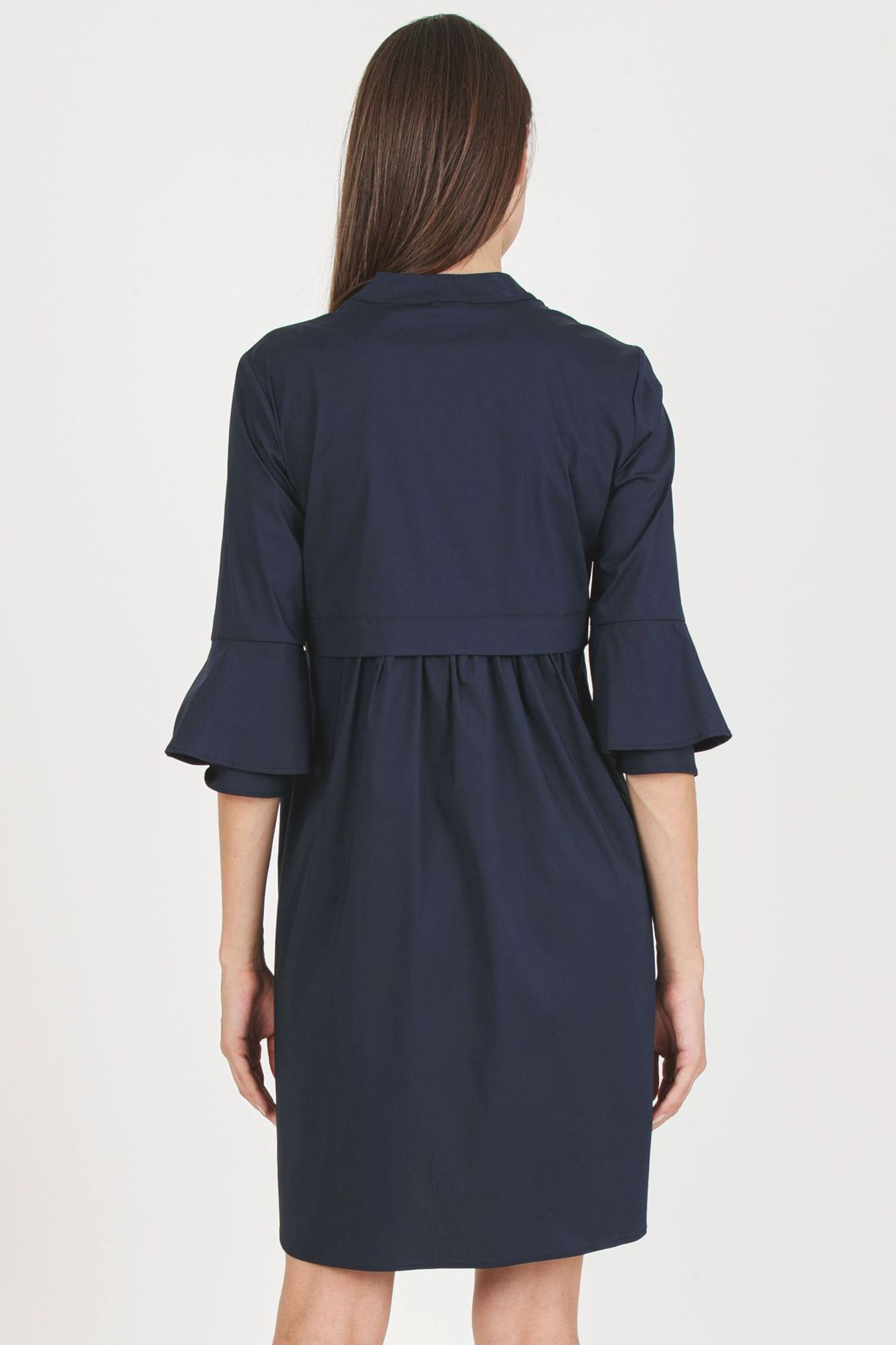 Umstands- und Stillkleid im layered Look mit Stehkragen, Knopfleiste im Ausschnitt und 3/4 Trompetenärmeln. Das geraffte Rockteil schafft eine schöne Silhouette und betont deinen Babybauch. Die Knopfleiste am Oberteil des Kleides erleichtert dir später das diskrete Stillen deines Babys. Farbe: navy