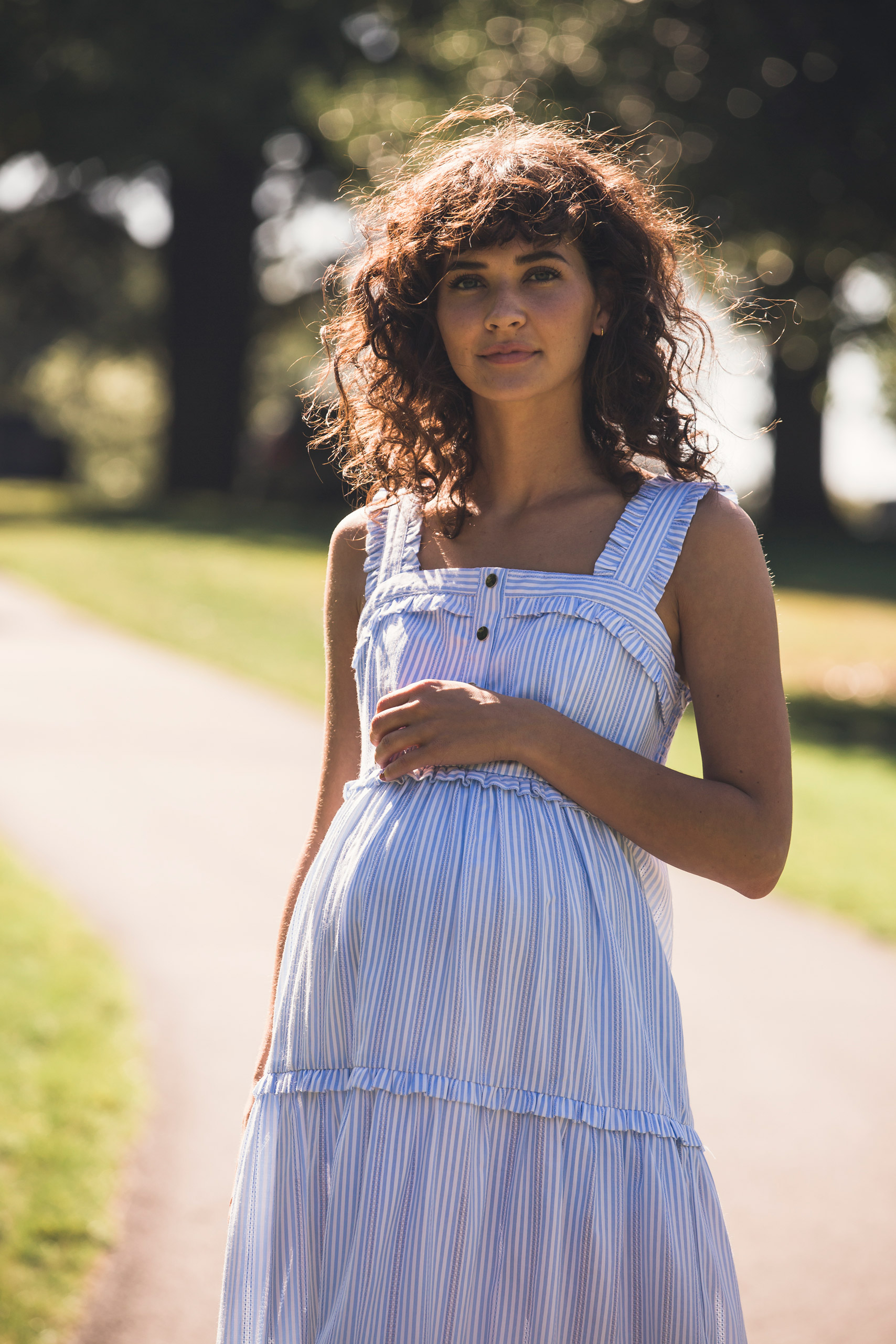 Dieses luftige Umstands- und Stillkleid mit Streifenmuster kannst du in bequemer Midi-Länge in der Schwangerschaft und danach tragen. Das gesmokte Rückenteil mit Stretch gibt deiner Brust zusätzlichen Spielraum. Über die verdeckte Knopfleiste am Ausschnitt erhältst du einen schnellen Stillzugang. Der abgestufte Saum mit Rüschen am Rock, an den Trägern und Bustier machen das Kleid zu einem echten Highlight. Farbe: blau/weiß