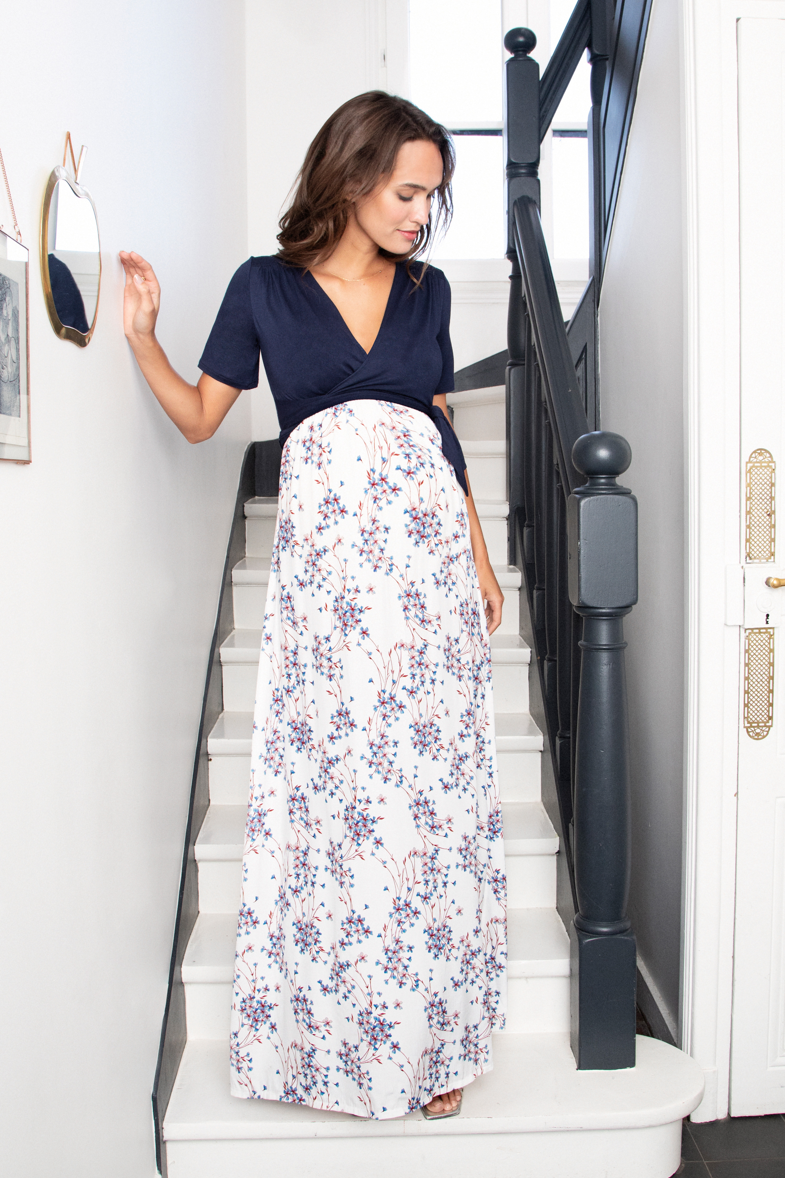 Maxi Umstands- und Stillkleid mit langem, floral gemustertem Rock und Wickeloberteil. Das softe Viskosekleid fällt in allen Phasen der Schwangerschaft wunderbar fließend über deinen Babybauch. Nach der Geburt erhältst du dank des gewickelten Oberteils einen schnellen Zugang zur Brust, um dein Baby zu stillen. Das perfekte Kleid für festliche Anlässe oder Dinner bei Sonnenuntergang. Länge: ca. 148cm. Farbe: dunkelblau/weiß