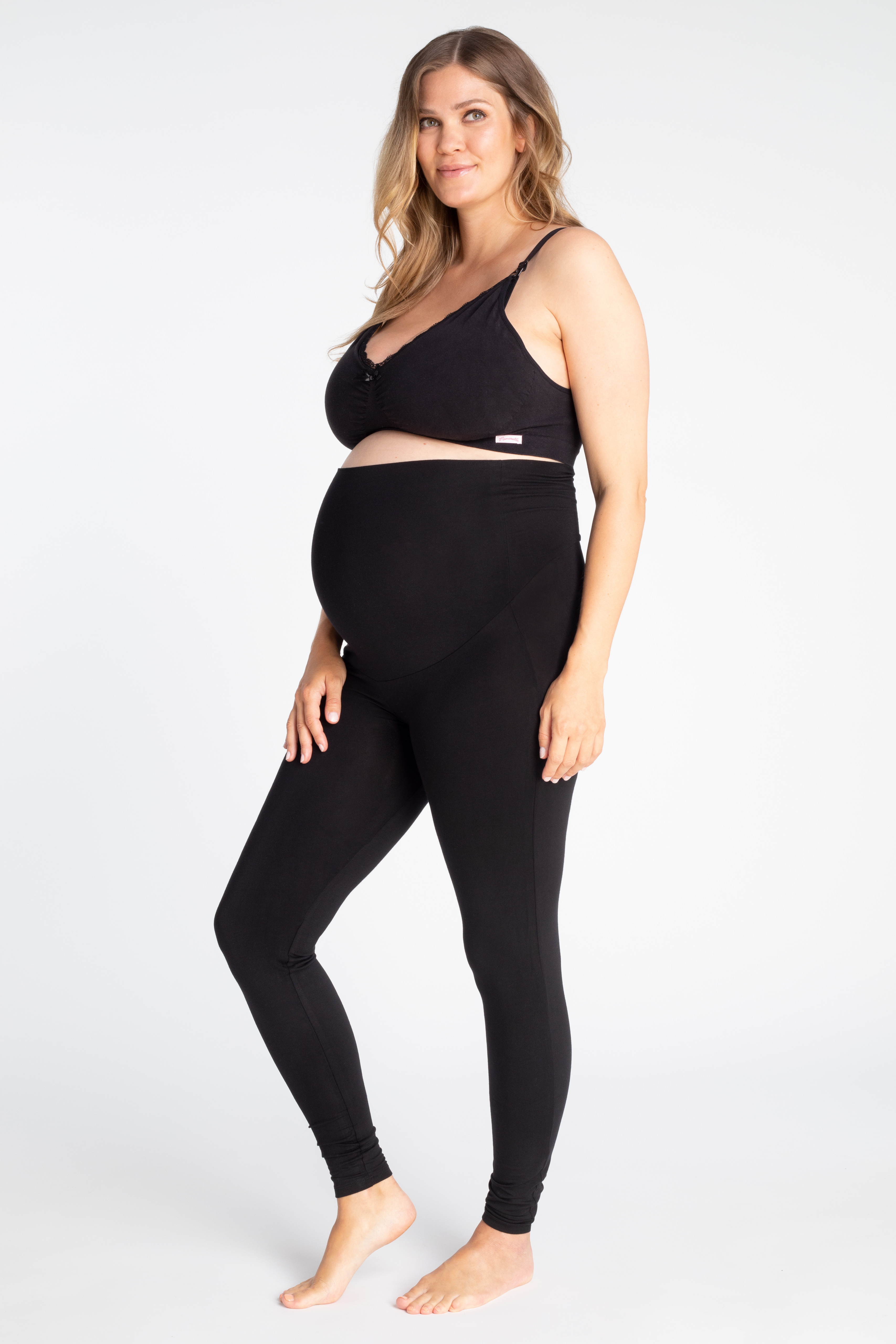 Unser Curvy Model Hannah ist 176cm groß und auf den Fotos in der 31. SSW. Sie trägt die Leggings in der L/XL und dazu unseren Organic Schwangerschafts- und Still BH Seamless schwarz >> in Gr. XL.