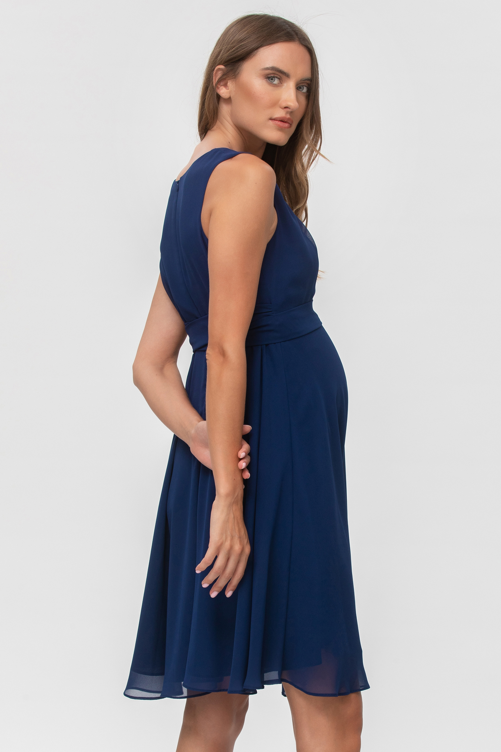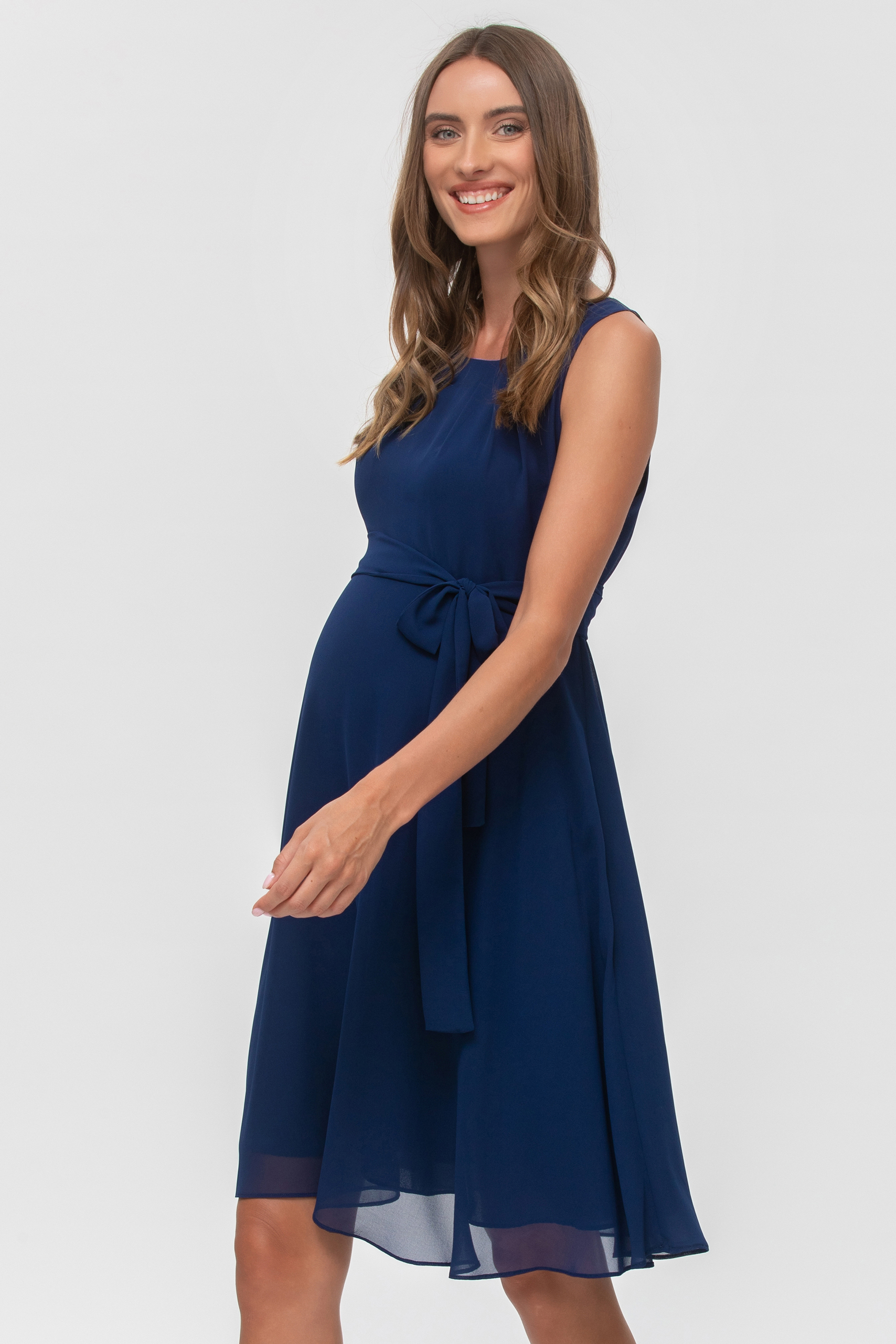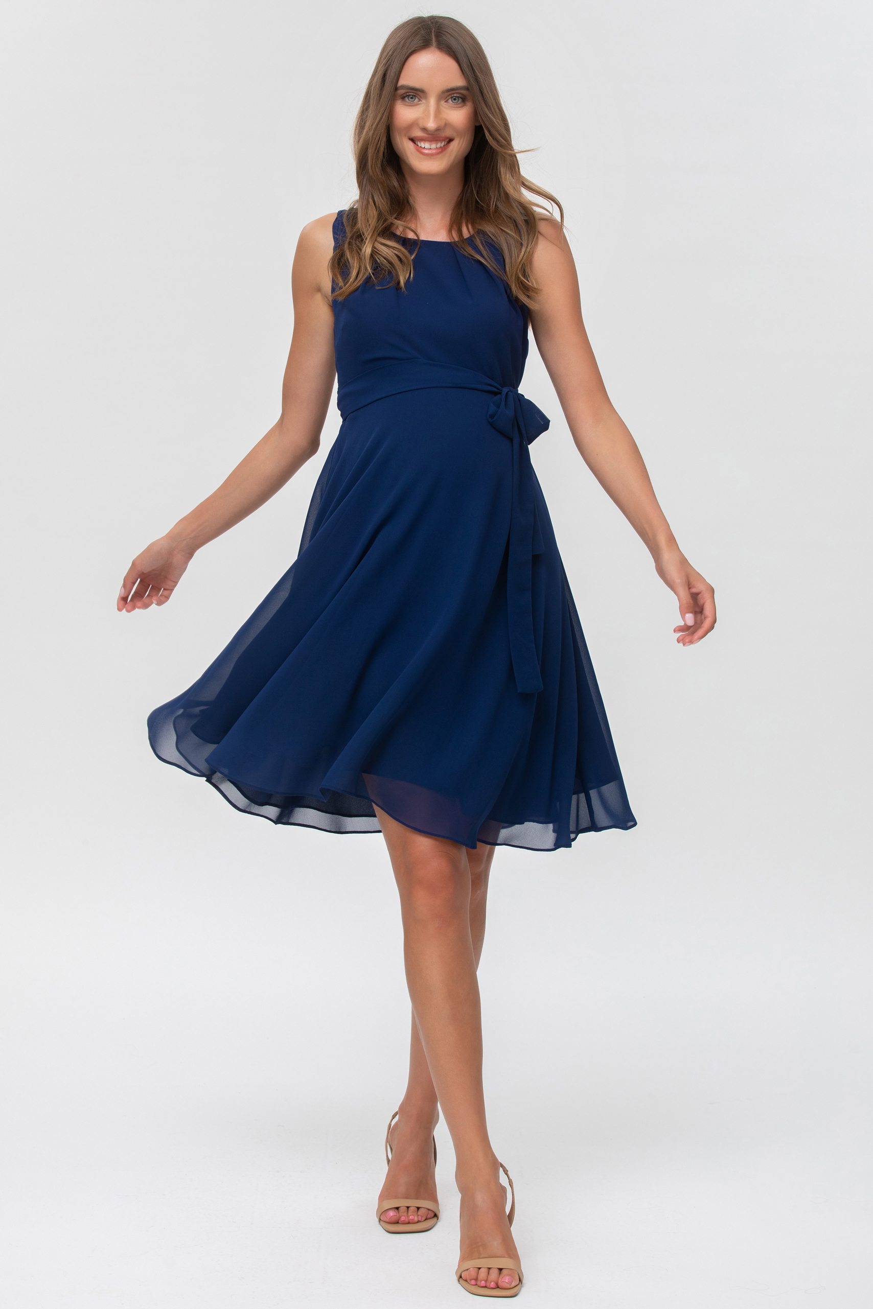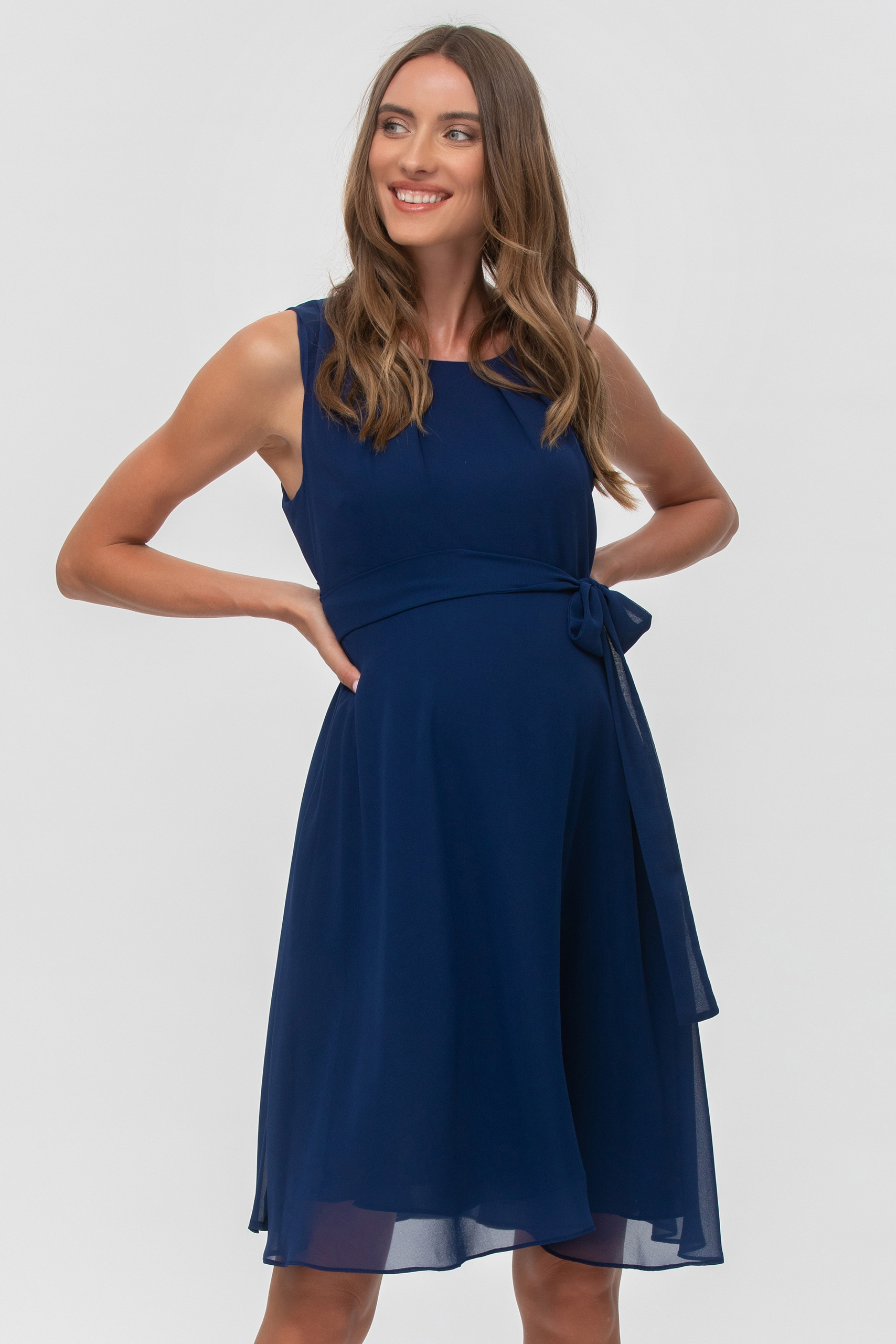 Georgette Umstandskleid aus weichem Material und Bindedetail an der Taille. Durch die doppelte Lage erhält das Kleid einen schönen Schwung. Dank dem integrierten Bindegürtel, kannst du die Taille perfekt an deine sich verändernde Silhouette anpassen. Farbe: dunkelblau
