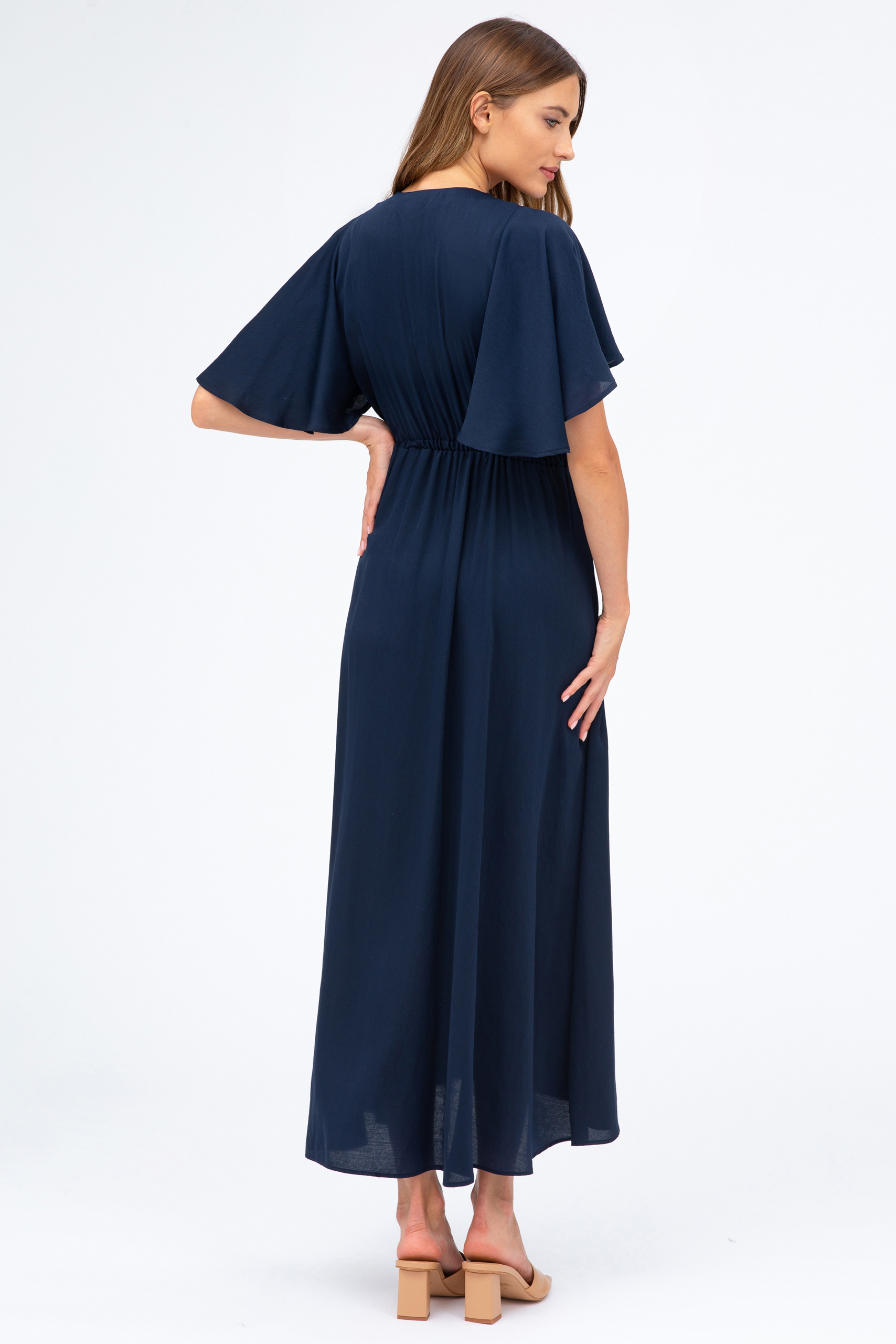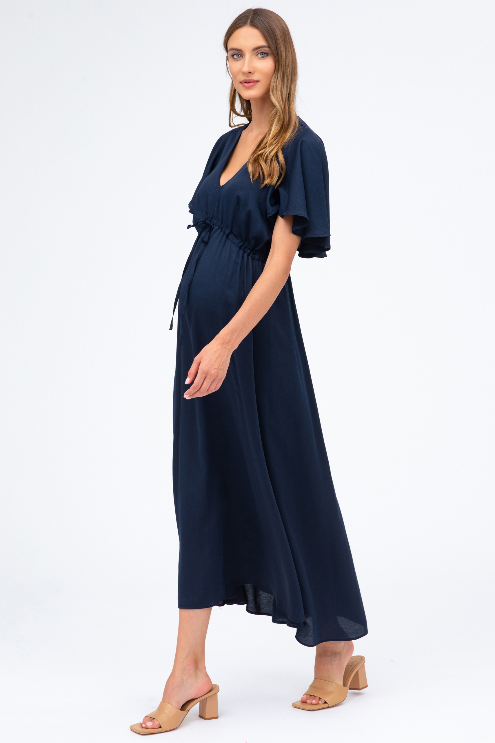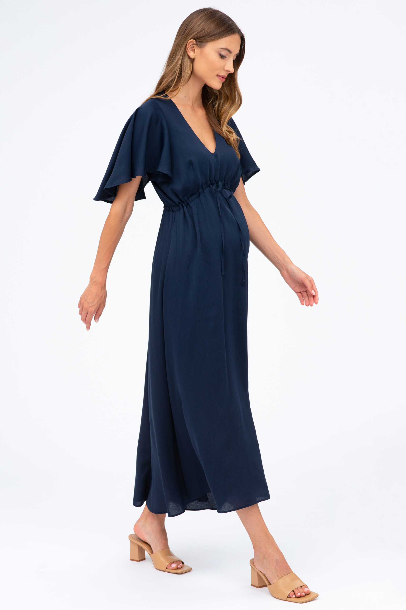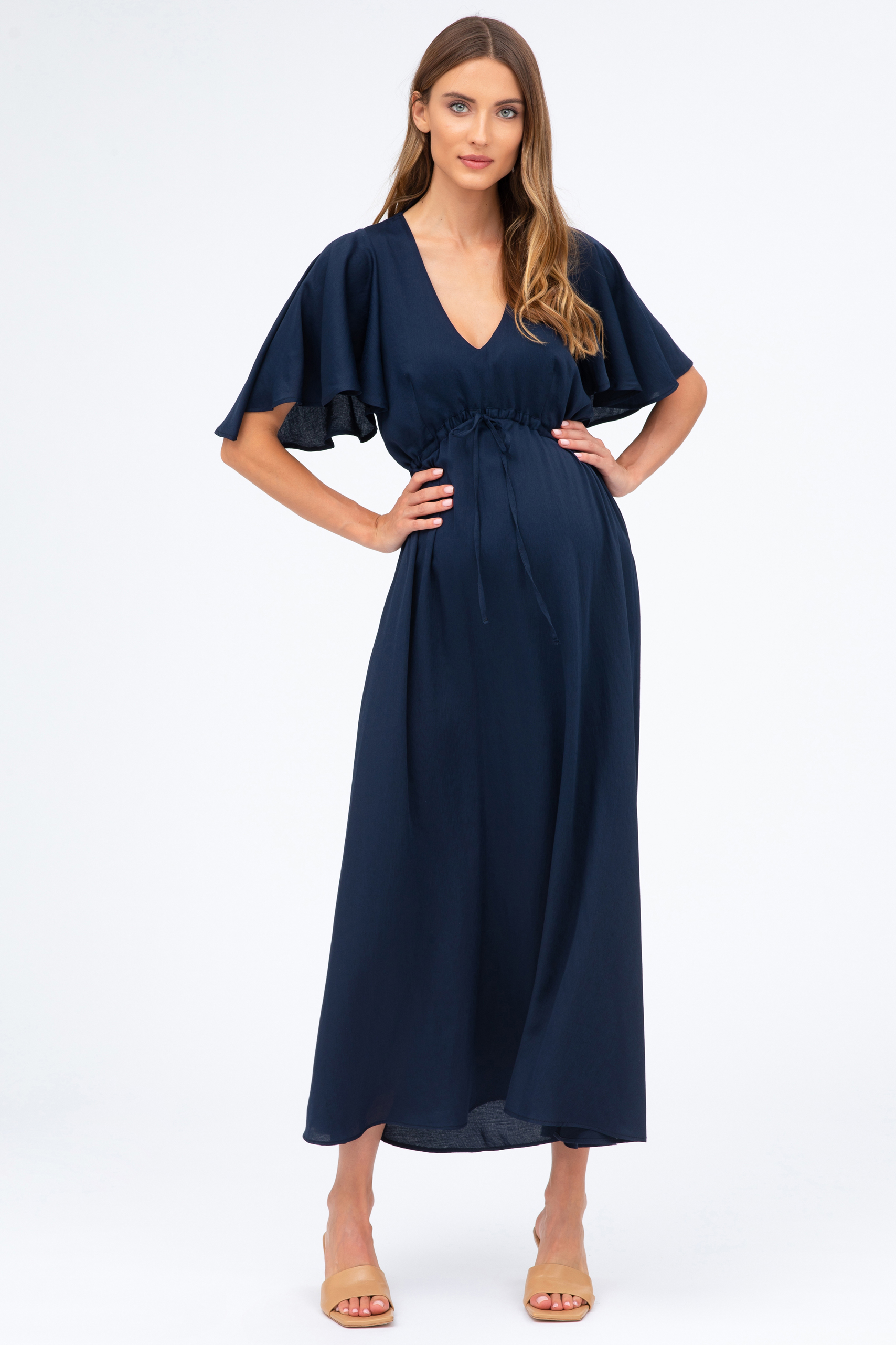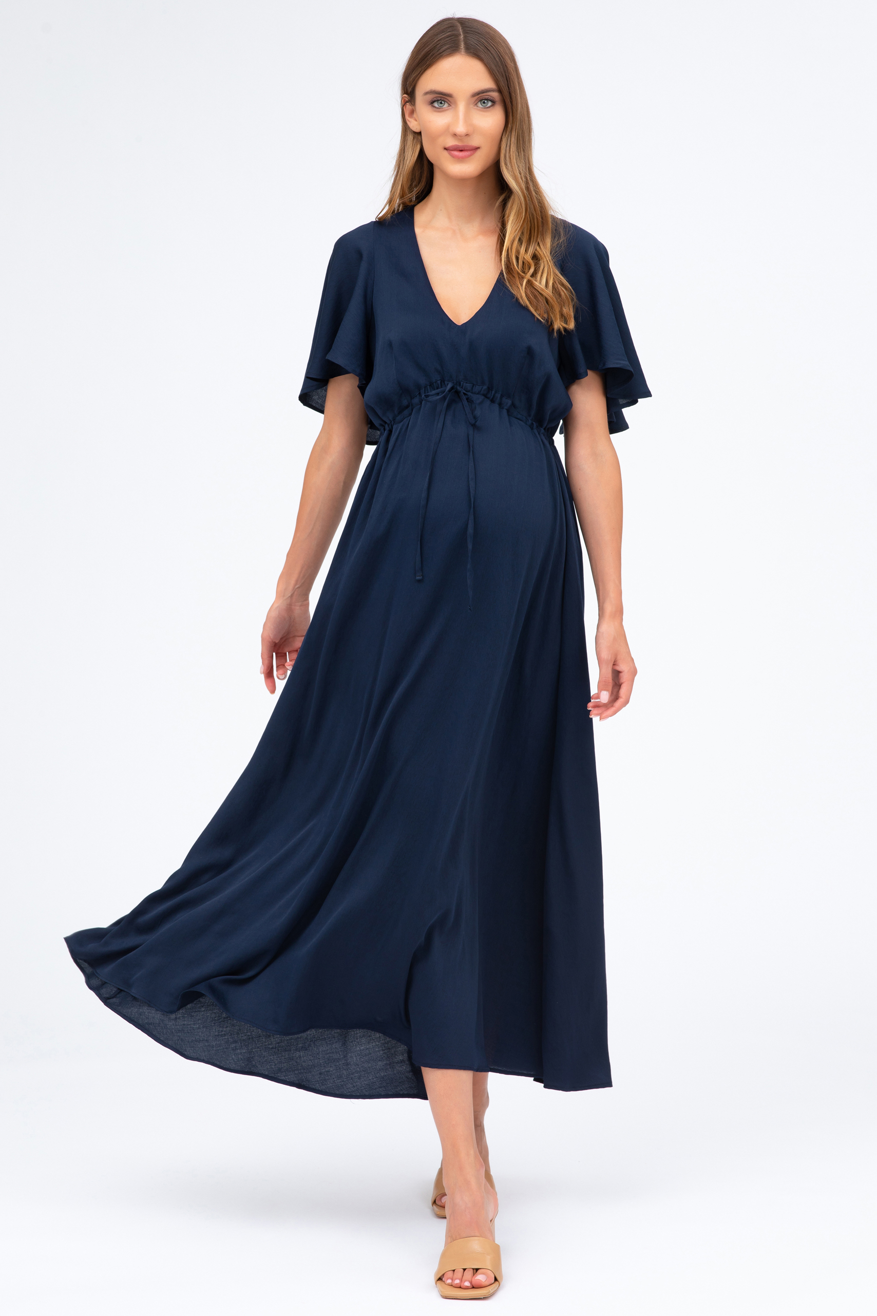 Langes Umstandskleid aus weicher Viskose mit wunderschönen Flügelärmeln, die dem Kleid einen besonders femininen Look verleihen. Durch eine festellbare Schnürung unter der Brust kannst du das Kleid individuell an deine sich verändernde Figur anpassen. Der lange Rock schwingt beim Gehen wunderbar mit. Auch ohne Babybauch sieht das Kleid toll aus, sodass du es auch nach der Schwangerschaft noch bequem weitertragen kannst. Wurde nach dem Oeko-Tex® Standard 100 getestet und zertifiziert. Länge: ca. 135cm. Farbe: navy
