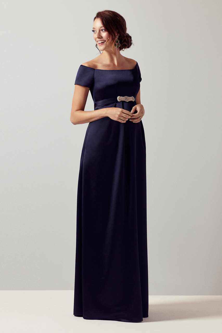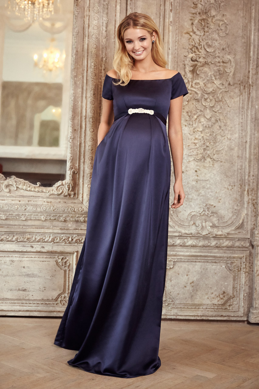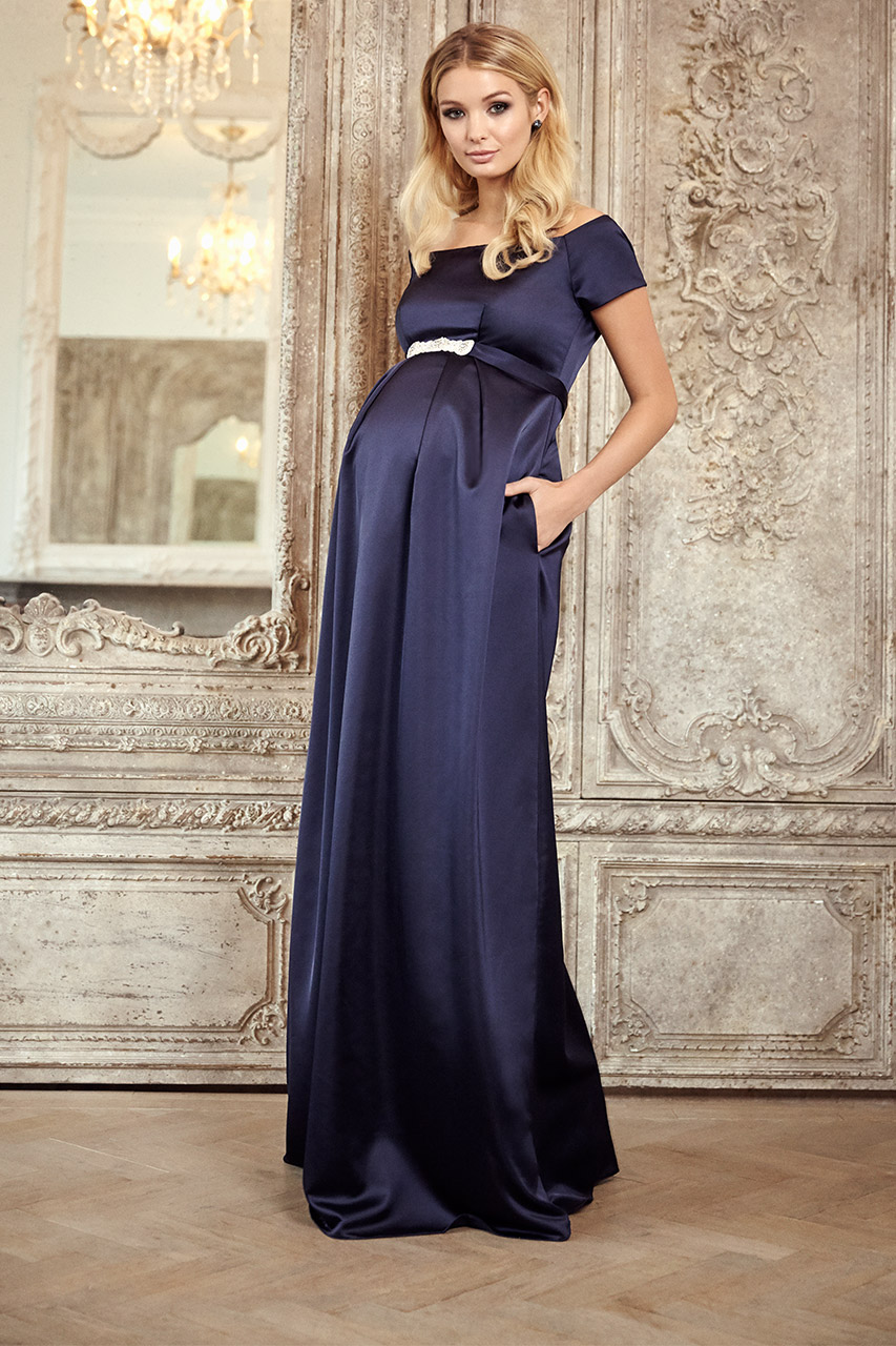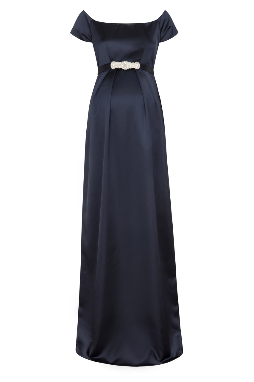 Umstandsrobe aus Satin mit weitem U-Boot-Ausschnitt, fließendem Rock und diskretem Reißverschluss am Rücken. Am Ausschnitt sorgen Silikoneinsätze dafür, dass das Kleid nicht verrutscht. Die Schärpe ist nicht im Lieferumfang enthalten und kann separat bestellt werden. Farbe: navy