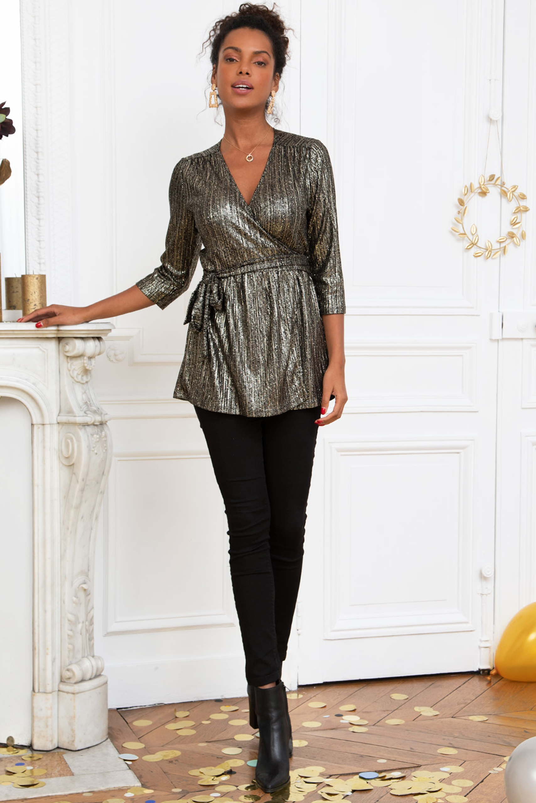 Festliches Umstands- und Stillshirt in Wickeloptik aus selber-glänzender und weicher Viskose. Das Shirt sorgt durch das besondere Lurex-Material für einen echten Hingucker und eignet sich dadurch perfekt für festliche Anlässe. Der Cache-Coeur Ausschnitt zaubert dir nicht nur einen vorteilhaften Ausschnitt, sondern bietet dir auch einen schnellen und einfachen Stillzugang. Farbe: silber