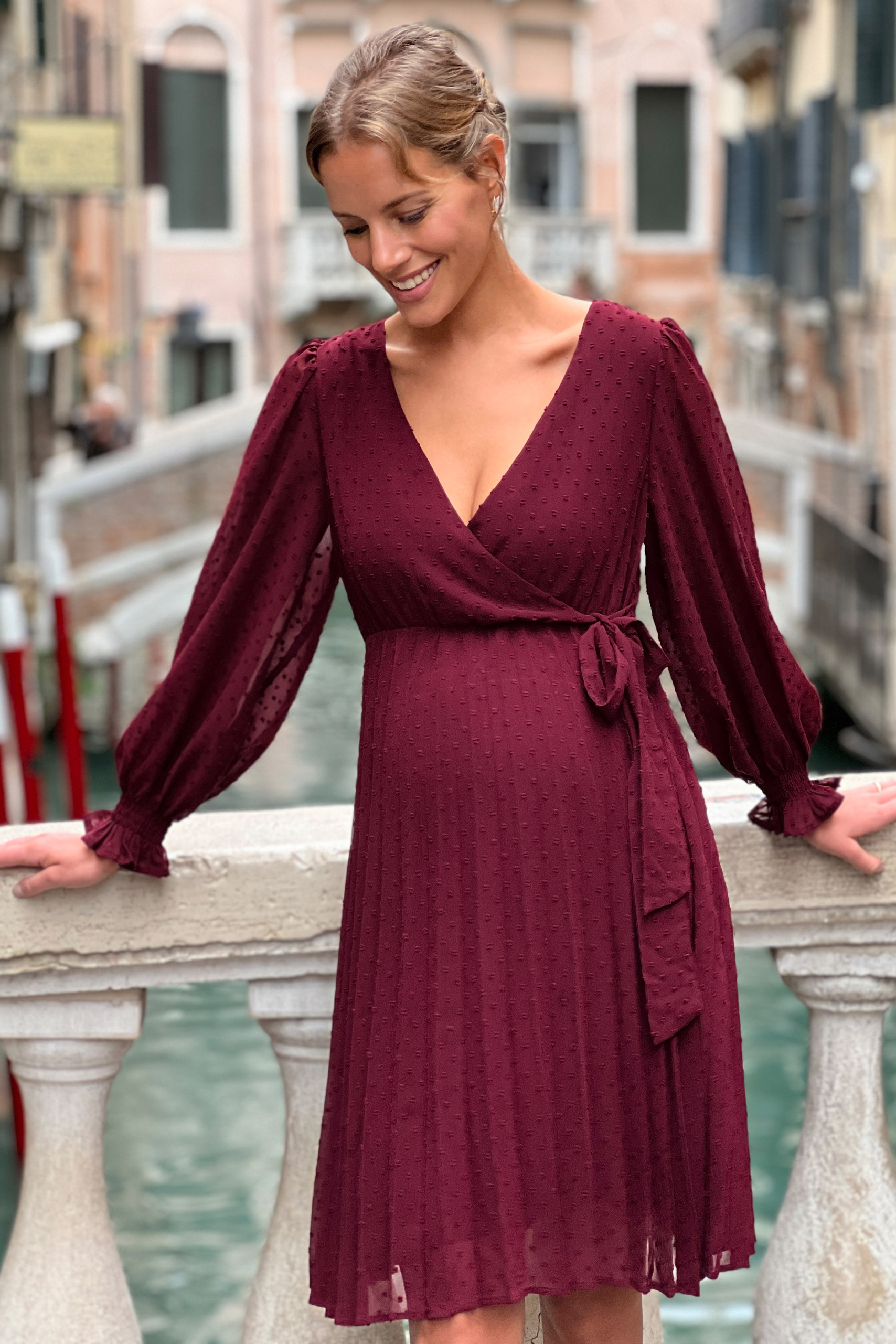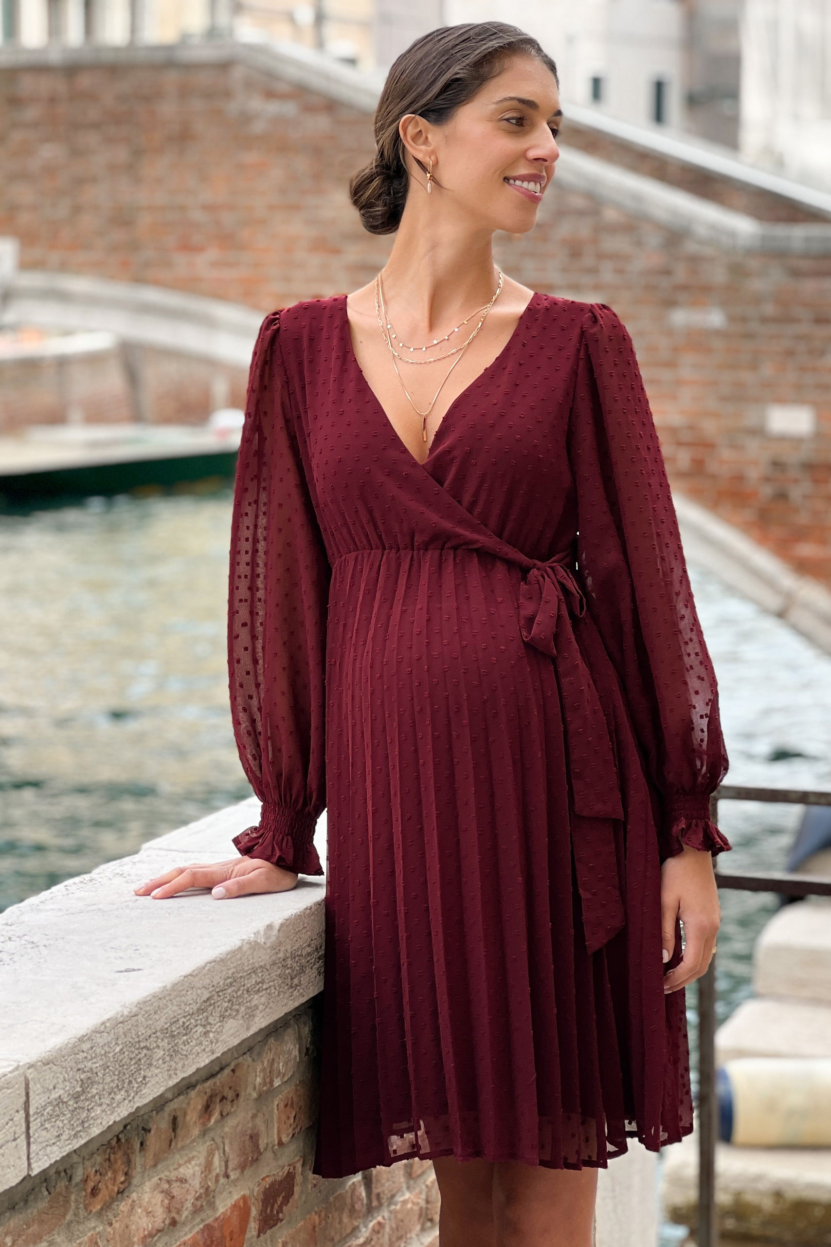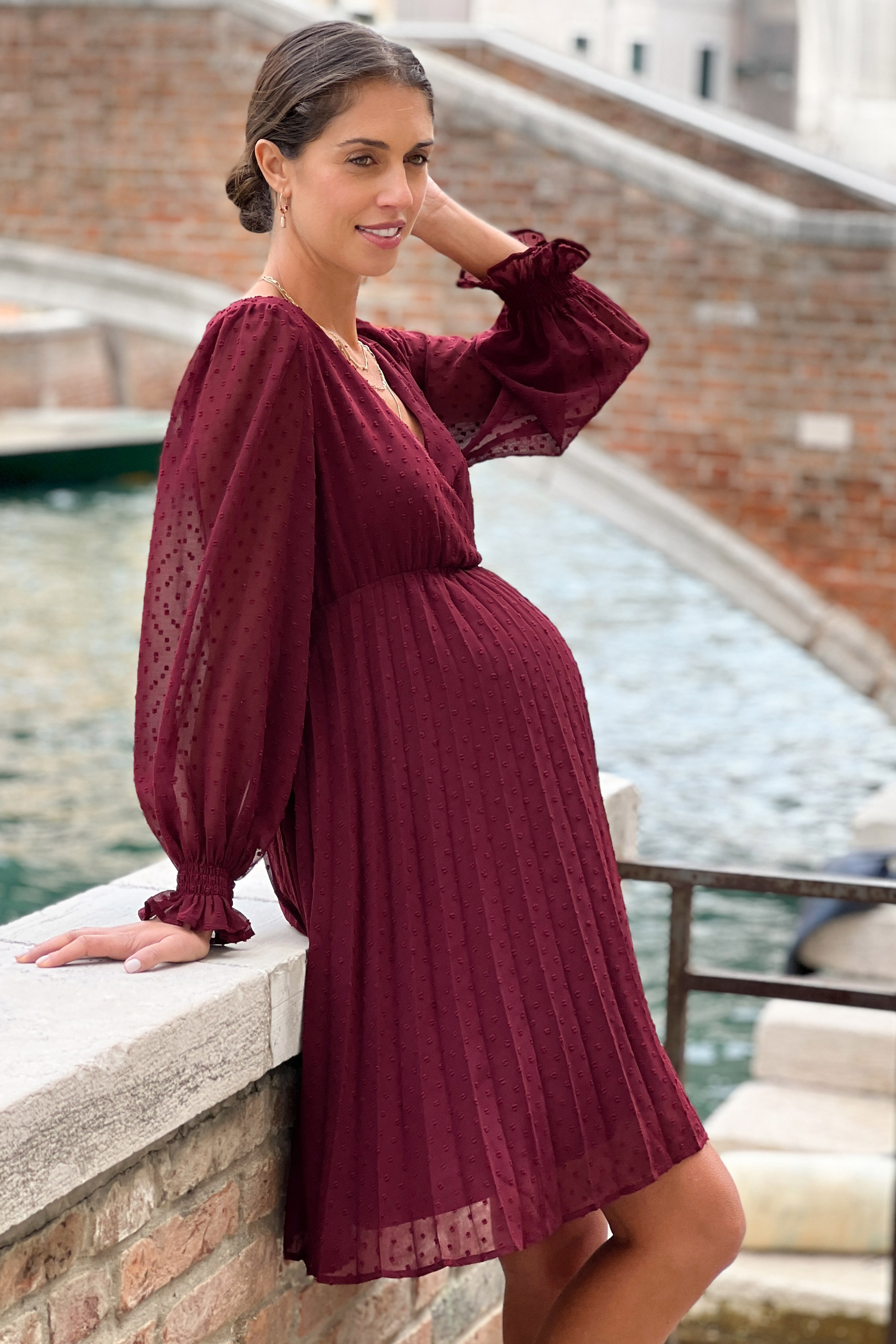 Festliches Umstandskleid in Wickeloptik und Plisseerock. Der einfarbig gepunktete Stoff kommt an den transparenten Puffärmeln besonders gut zur Geltung und unterstreicht den femininen Look. Unter dem Cache-Coeur Ausschnitt kannst du den integrierten Bindegürtel zu einer hübschen Schleife binden. Dank vorteilhafter A-Silhouette wird deine Taille betont, während der schwingende Plisseerock locker über deinen wachsenden Babybauch fällt. Nach der Schwangerschaft kannst du das elegante Kleid auch weiter zu festlichen Anlässen tragen, da sich der Schnitt wunderbar für eine Silhouette mit und ohne Babybauch eignet. Farbe: bordeaux