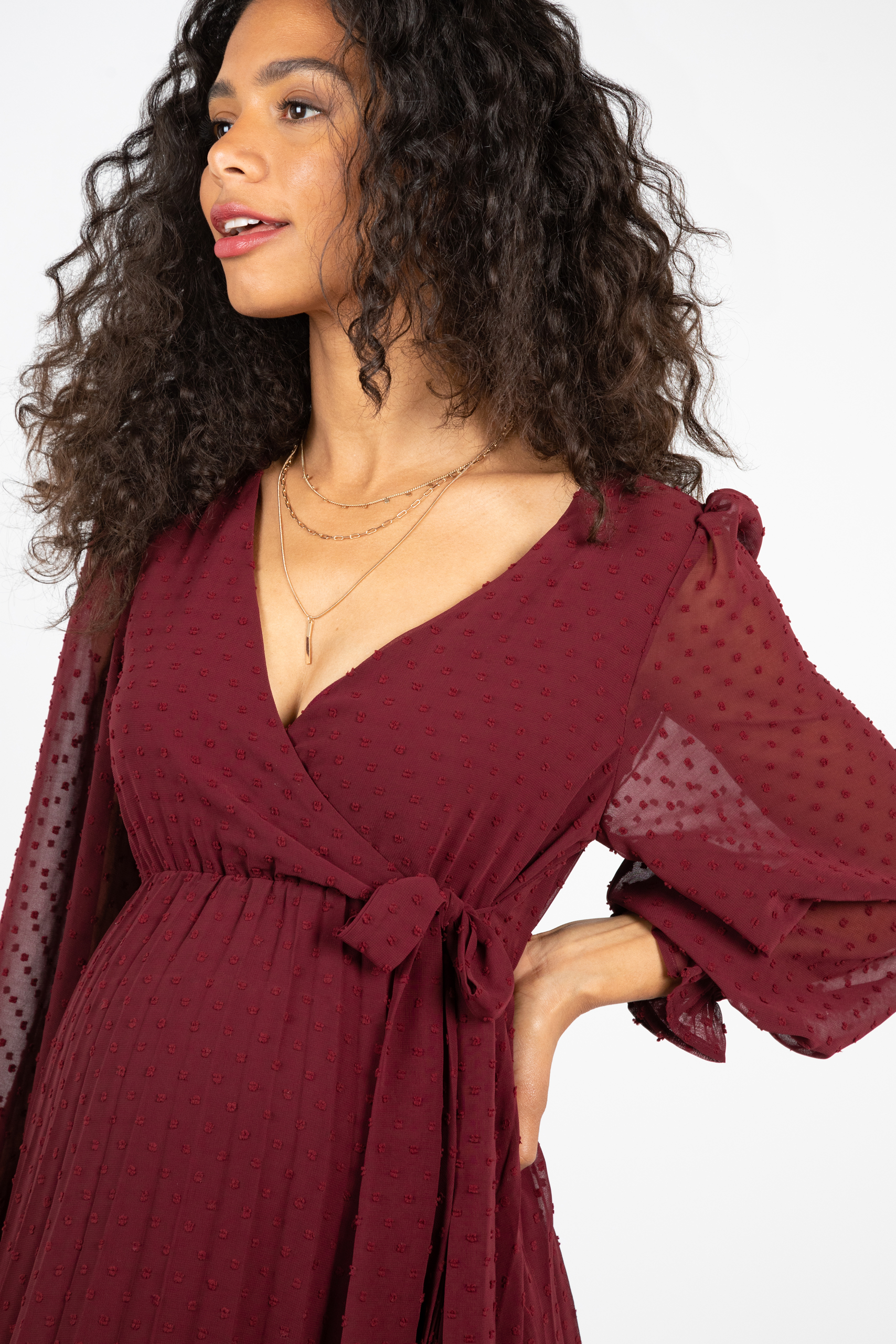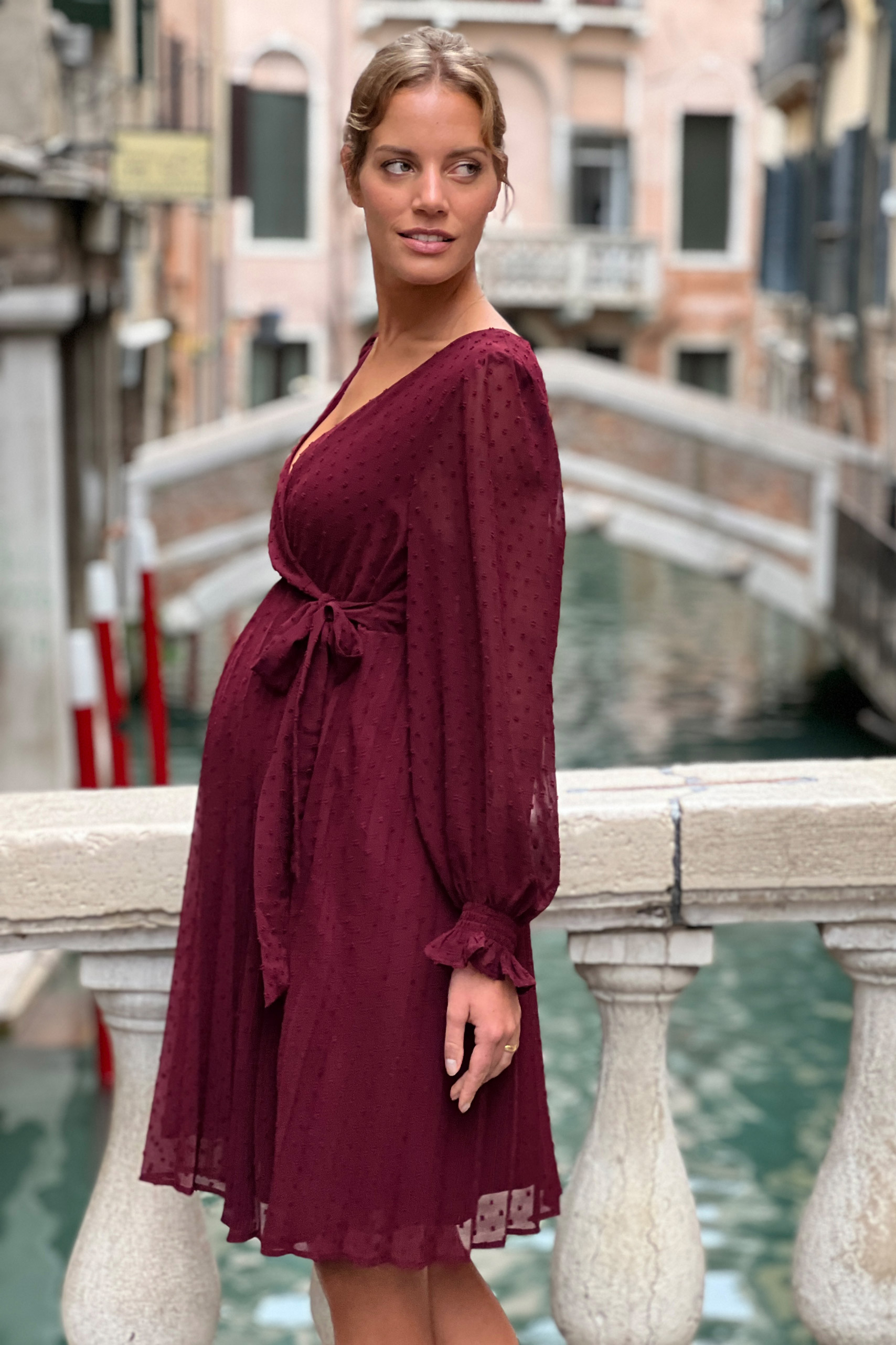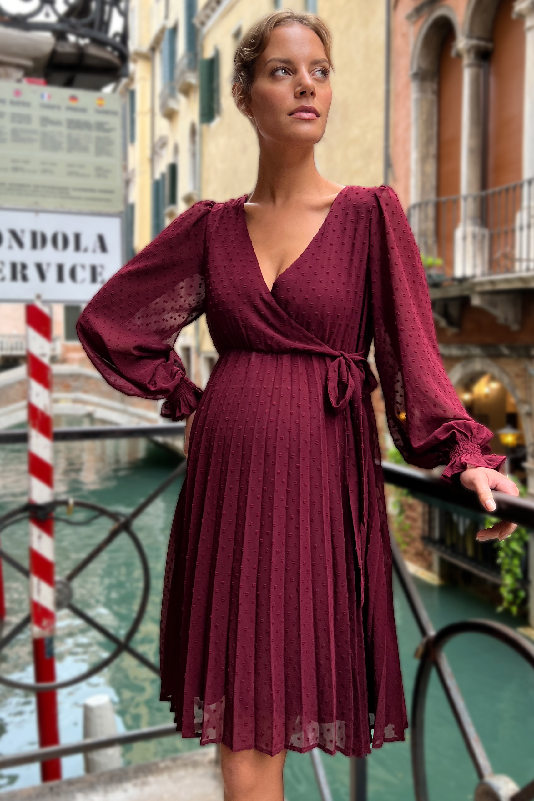 Festliches Umstandskleid in Wickeloptik und Plisseerock. Der einfarbig gepunktete Stoff kommt an den transparenten Puffärmeln besonders gut zur Geltung und unterstreicht den femininen Look. Unter dem Cache-Coeur Ausschnitt kannst du den integrierten Bindegürtel zu einer hübschen Schleife binden. Dank vorteilhafter A-Silhouette wird deine Taille betont, während der schwingende Plisseerock locker über deinen wachsenden Babybauch fällt. Nach der Schwangerschaft kannst du das elegante Kleid auch weiter zu festlichen Anlässen tragen, da sich der Schnitt wunderbar für eine Silhouette mit und ohne Babybauch eignet. Farbe: bordeaux