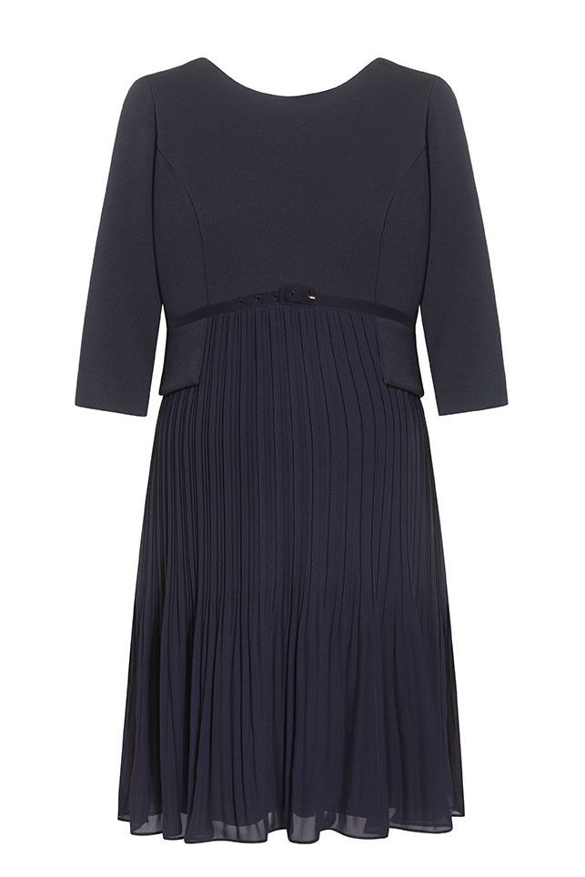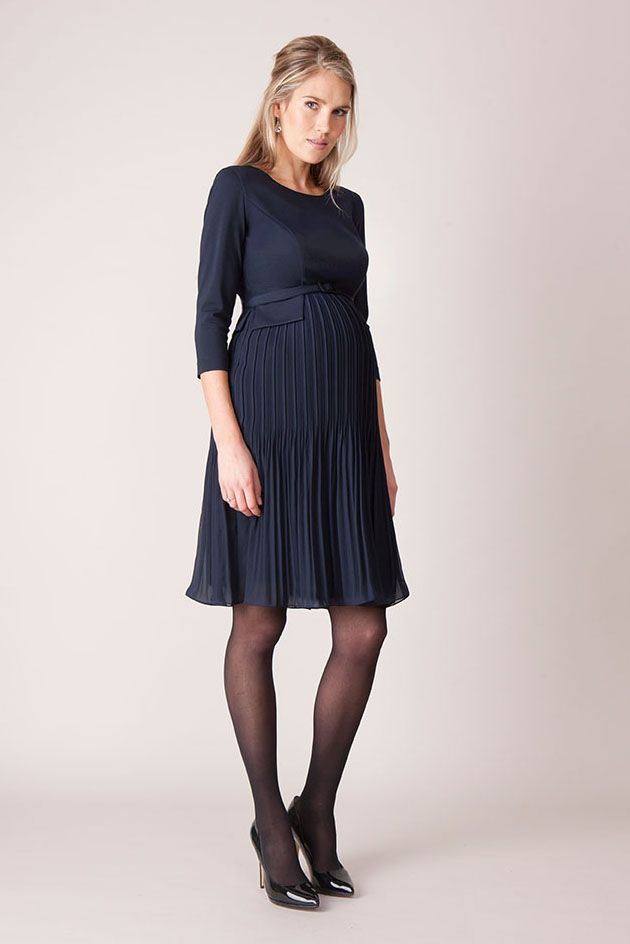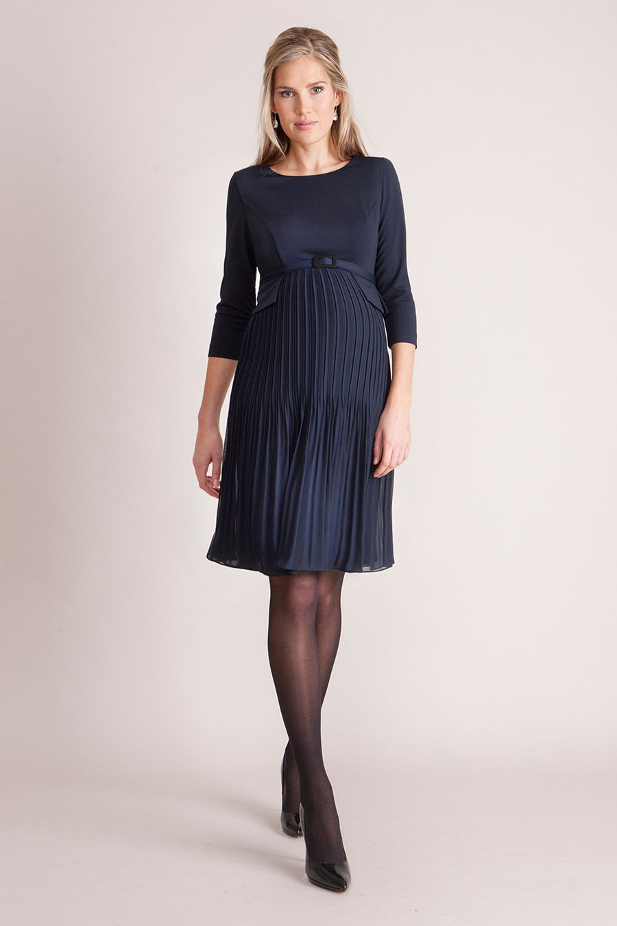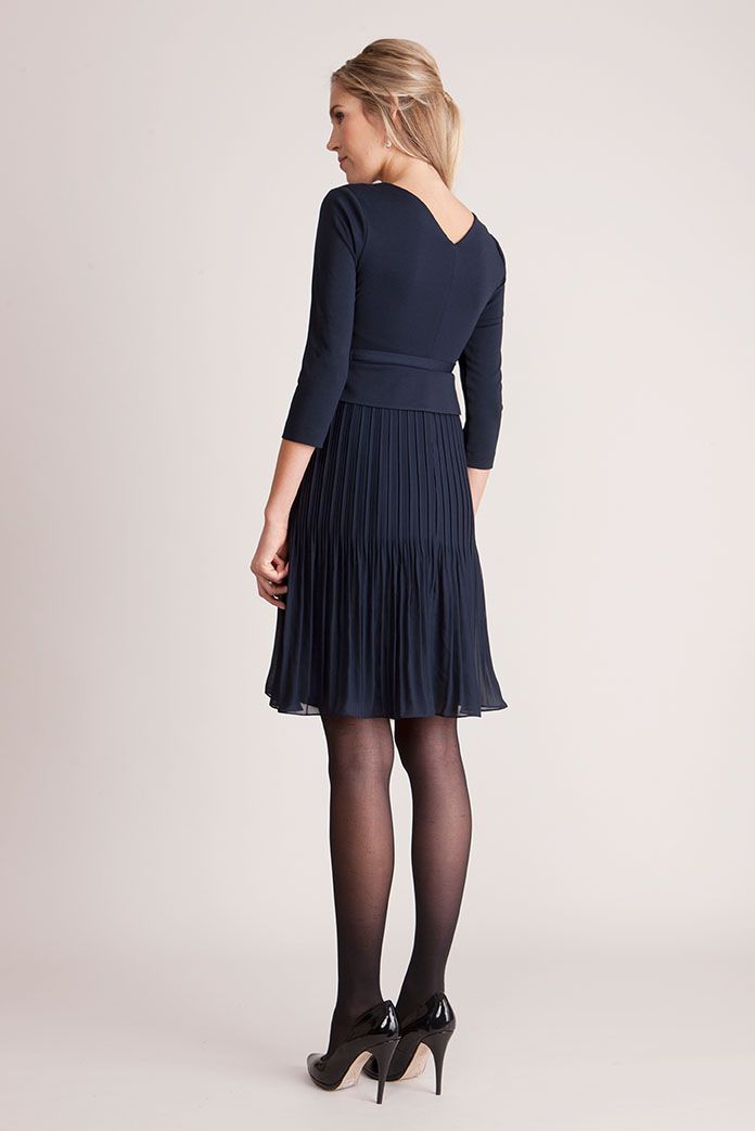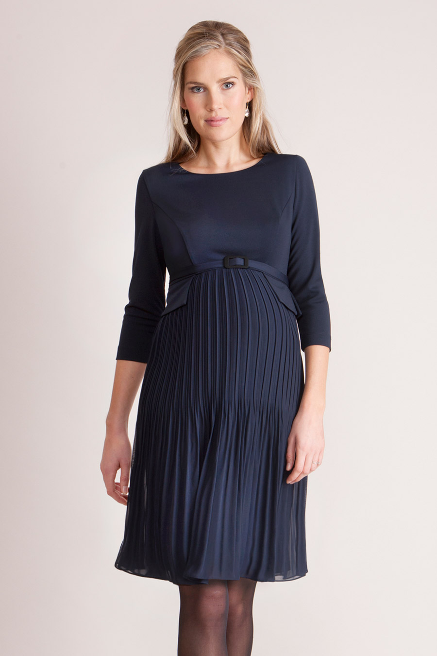 Umstandskleid mit abgenähtem Oberteil, kleinem Schößchen und feinem Plisseerock. Zusätzlich wird die Empire Linie durch einen schmalen Gürtel betont und verleiht einen eleganten Look.