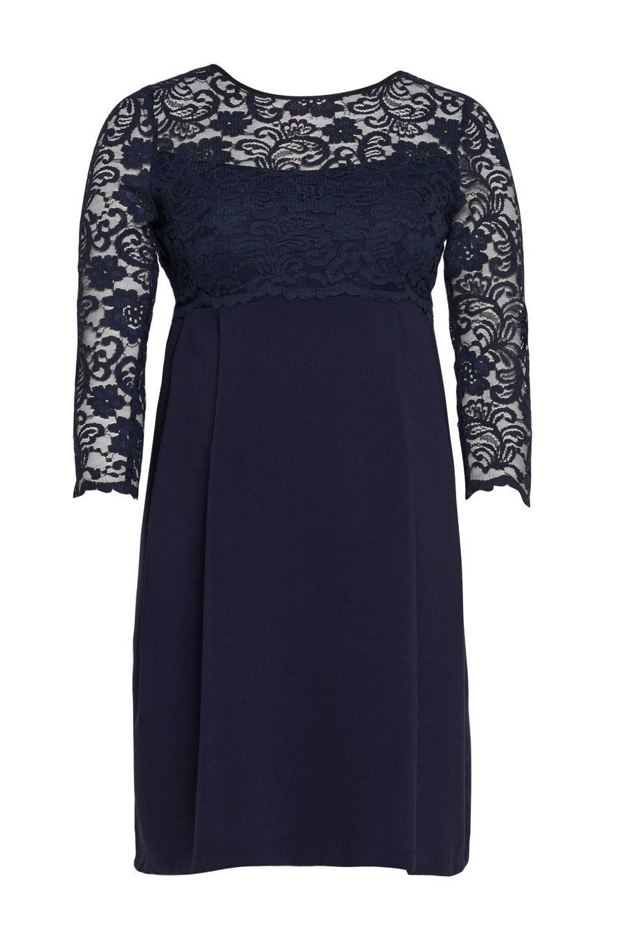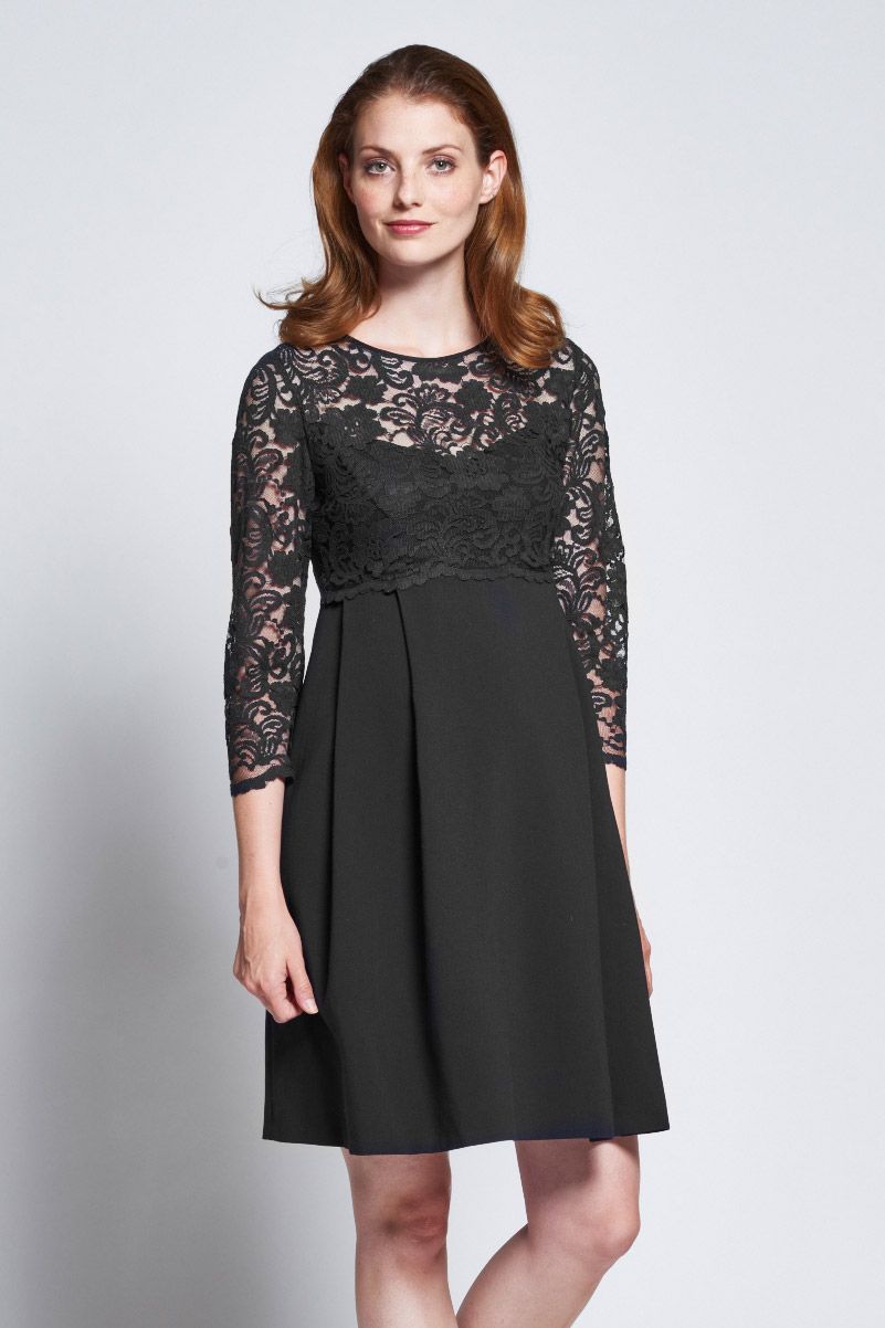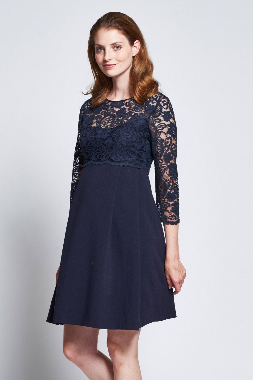 Umstandskleid mit Bustier und 3/4-Ärmeln aus Spitze sowie Plissees unterhalb der Empire-Linie. Das Kleid wird über einen Reißverschluss am Rücken geschlossen. Farbe: navy. schwarz