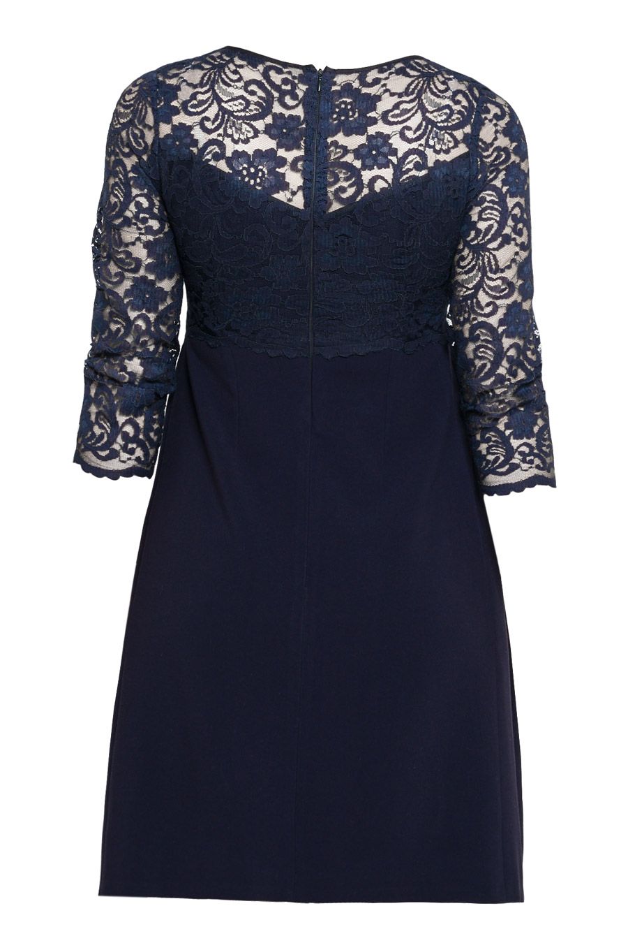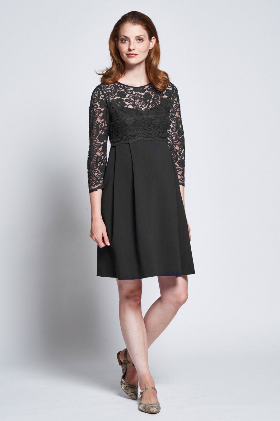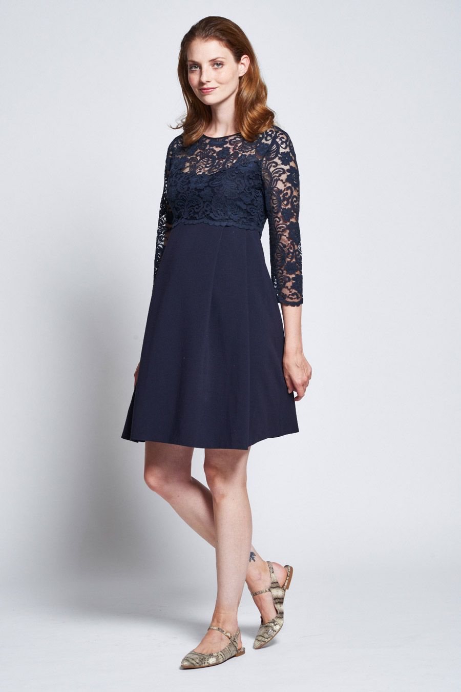 Umstandskleid mit Bustier und 3/4-Ärmeln aus Spitze sowie Plissees unterhalb der Empire-Linie. Das Kleid wird über einen Reißverschluss am Rücken geschlossen. Farbe: navy. schwarz
