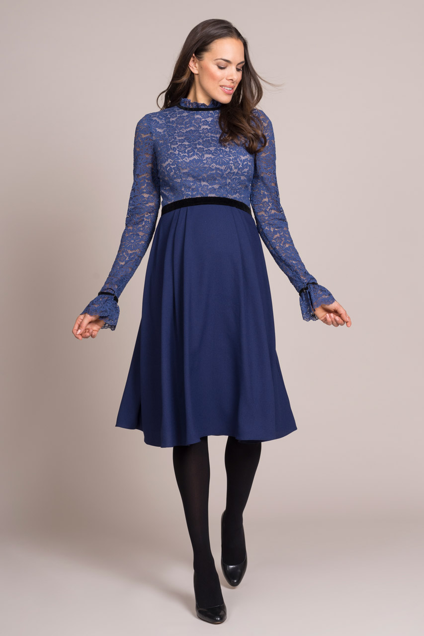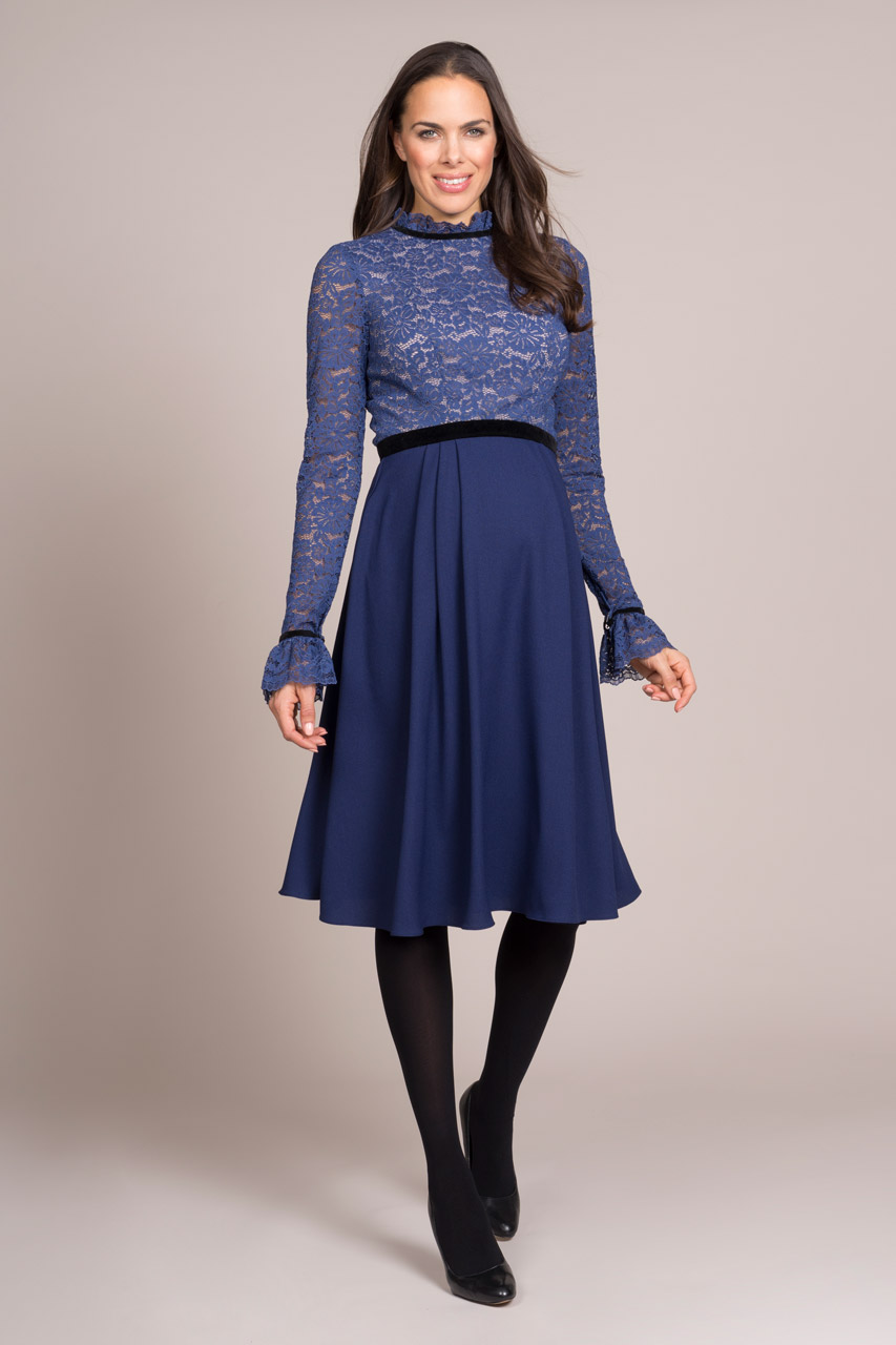 Umstandskleid in A-Line mit ausgestellten Ärmeln, Spitzenbustier und kleinem Kragen. Die Empire Line ist durch ein Samtband farblich abgesetzt und wird dadurch hervorgehoben. Das Kleid wird am Rücken mit einem Reißverschluss geschlossen. Farbe: blau/schwarz