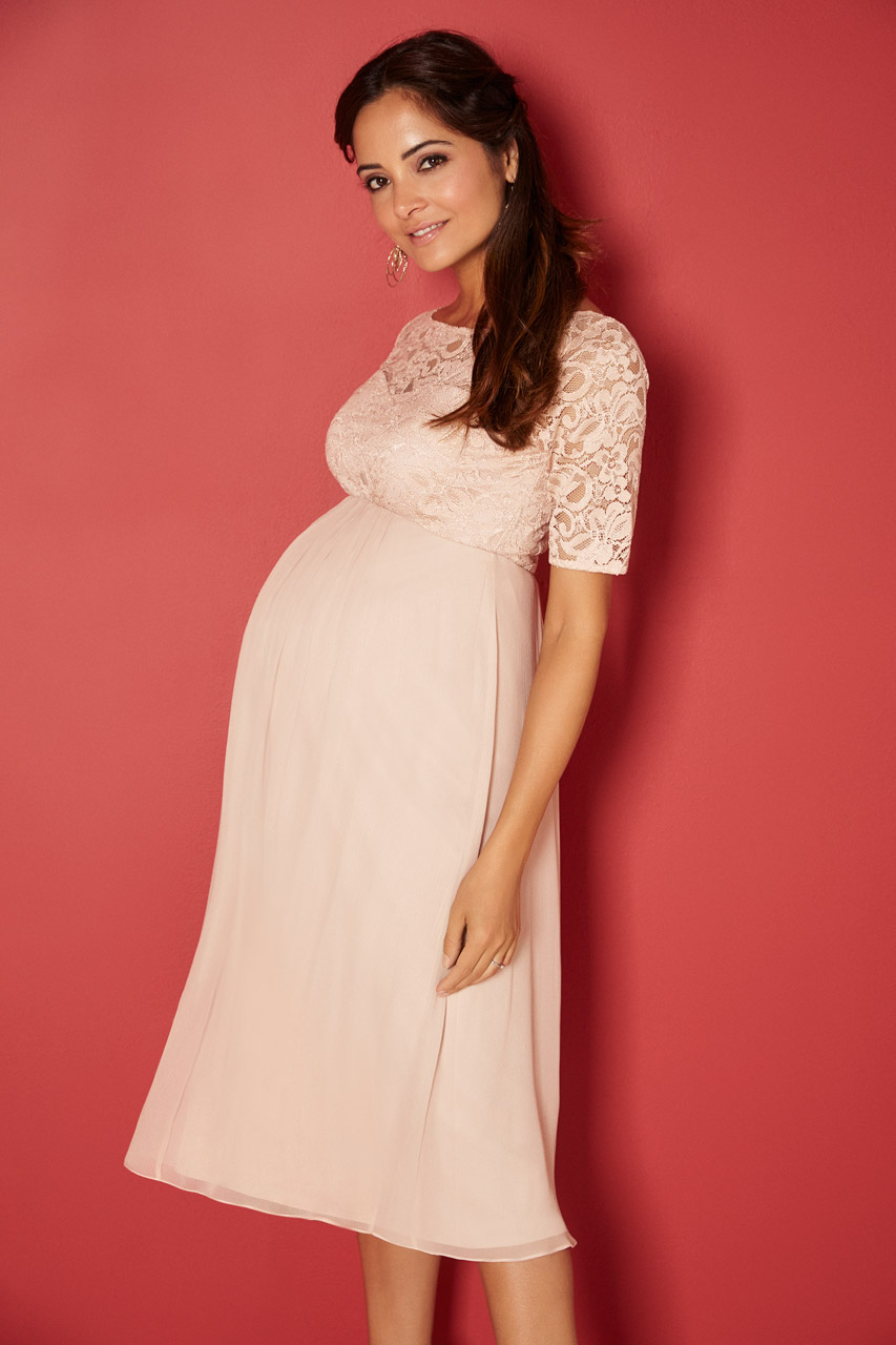 Midi Umstandskleid mit feinem Spitzenbustier und fließendem, doppellagigem Rock aus edlem Seiden-Chiffon mit halblangen Spitzenärmeln. Das elegante Design gibt deinem Bauch genügend Platz und betont schön deine Empire Linie. Der V-Ausschnitt im Rücken und der Herzausschnitt an der Brust runden das Kleid perfekt ab. Eignet sich auch wunderbar als Brautumstandskleid für diene Hochzeit mit Babybauch. Farbe: hellrosa