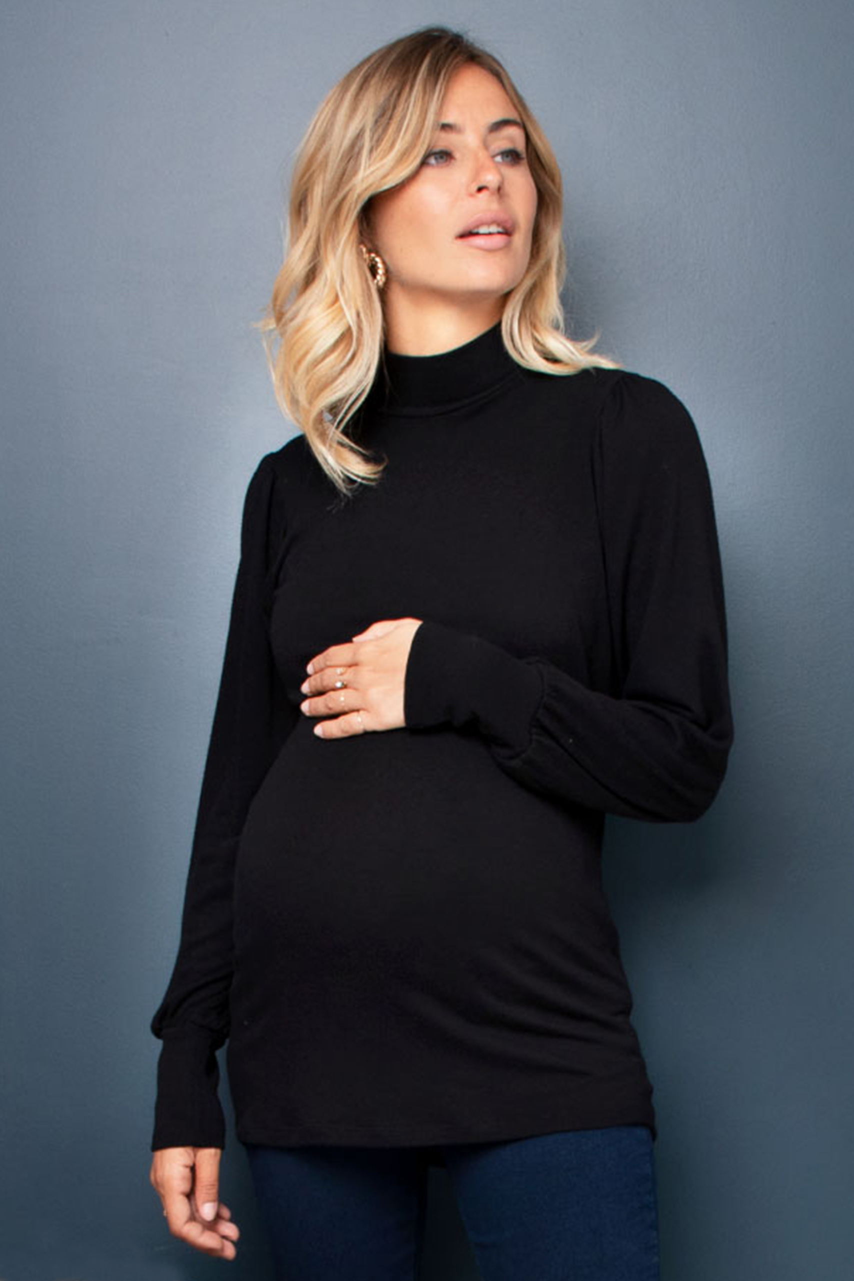 Umstandspullover mit kurzem Rollkragen und eleganten Bishop Ärmeln mit Faltendetail an den Schultern. Der körpernah geschnittene, softe Pullover legt sich in allen Phasen der Schwangerschaft wunderbar über deinen Bauch. Farbe: schwarz
