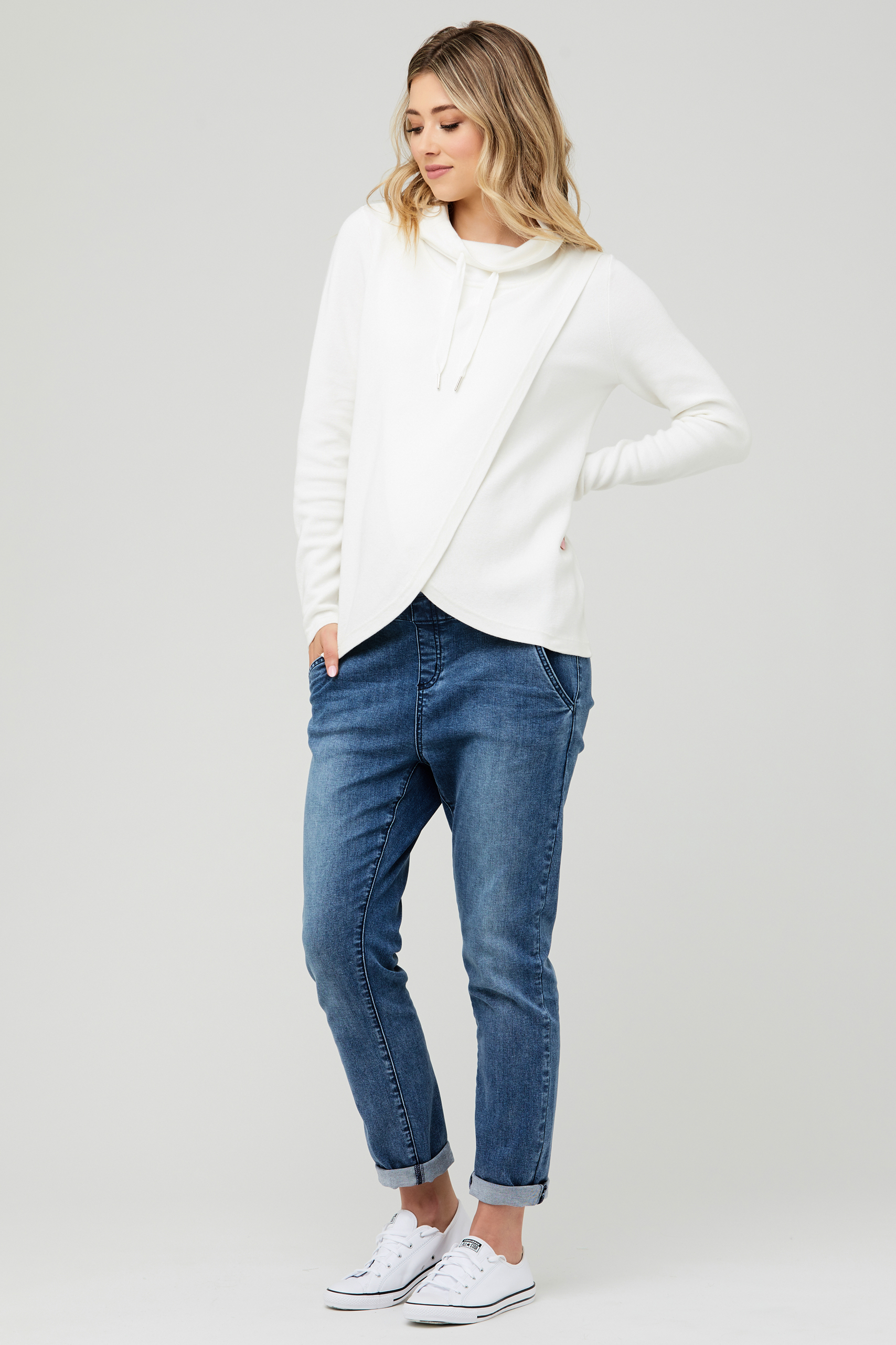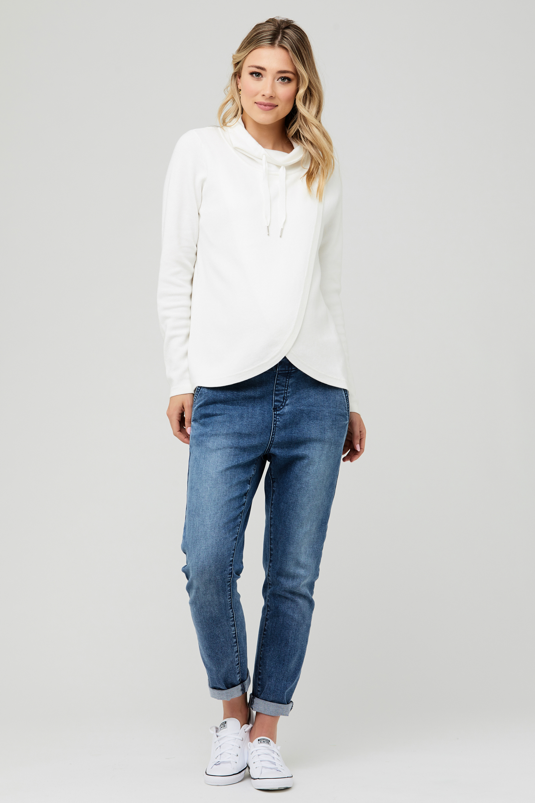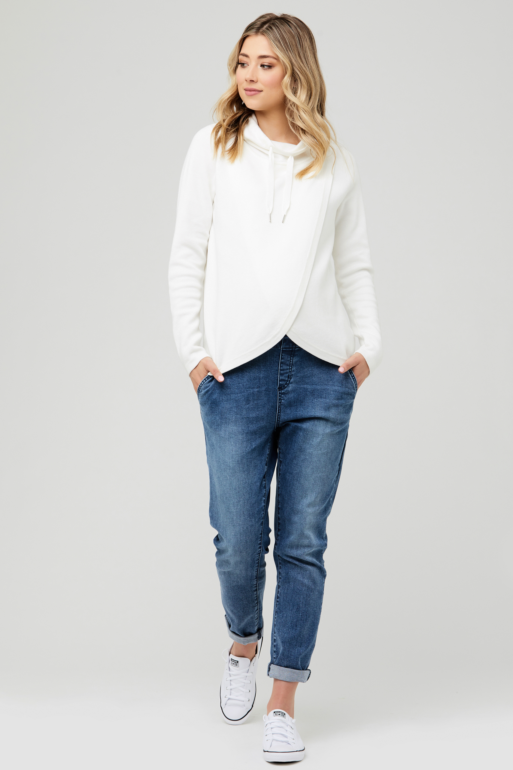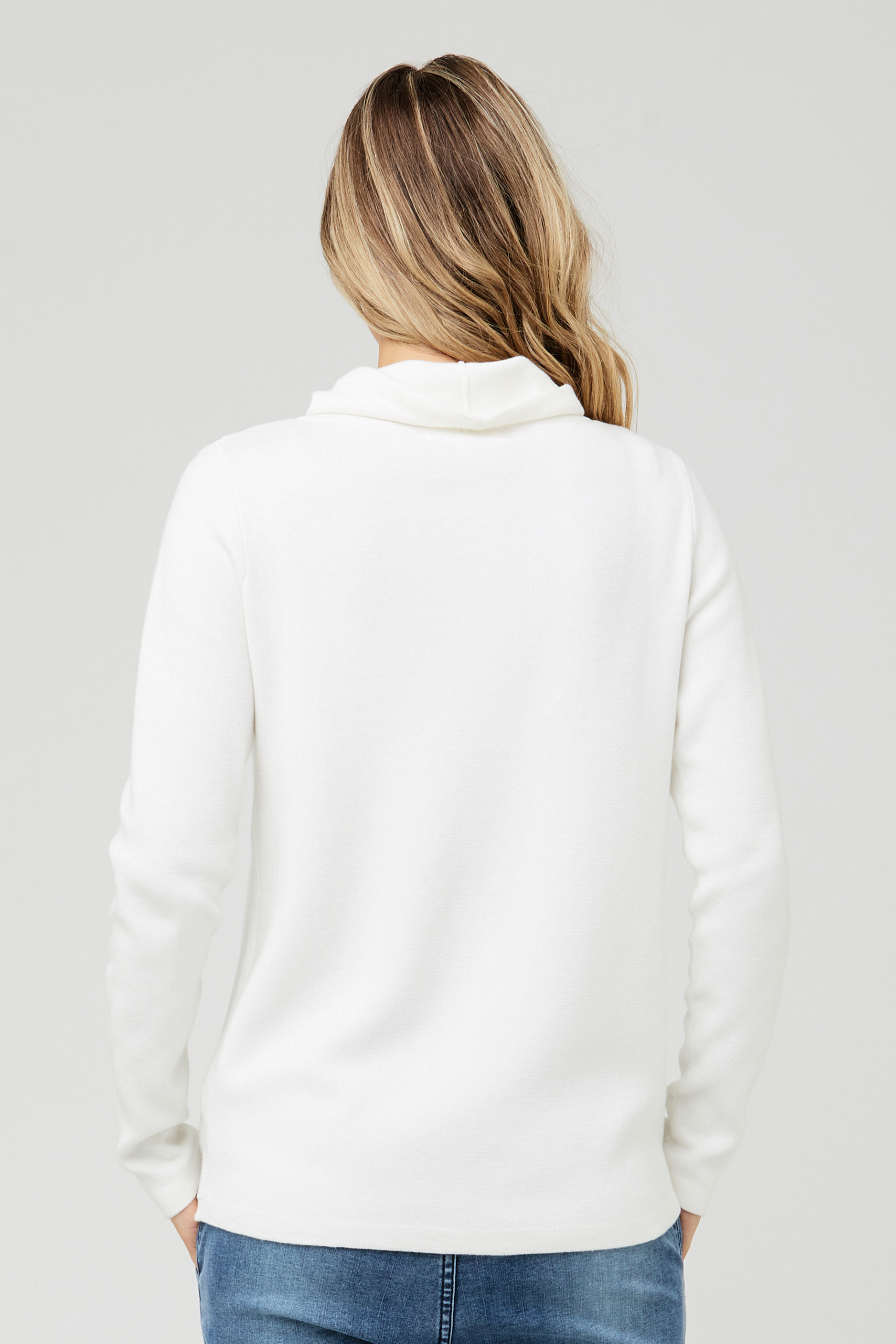 Umstands- und Still-Strickpullover im Cross-Over Design mit kurzem Schalkragen und Tunnelzug. Dein Bauch hat zu jeder Zeit genügend Spielraum. Später kannst du dein Baby diskret darin stillen, wenn du die beiden überkreuzten Stofflagen auseinanderschiebst. Länge: ca. 62,5cm bei Größe S. Farbe: off-white
