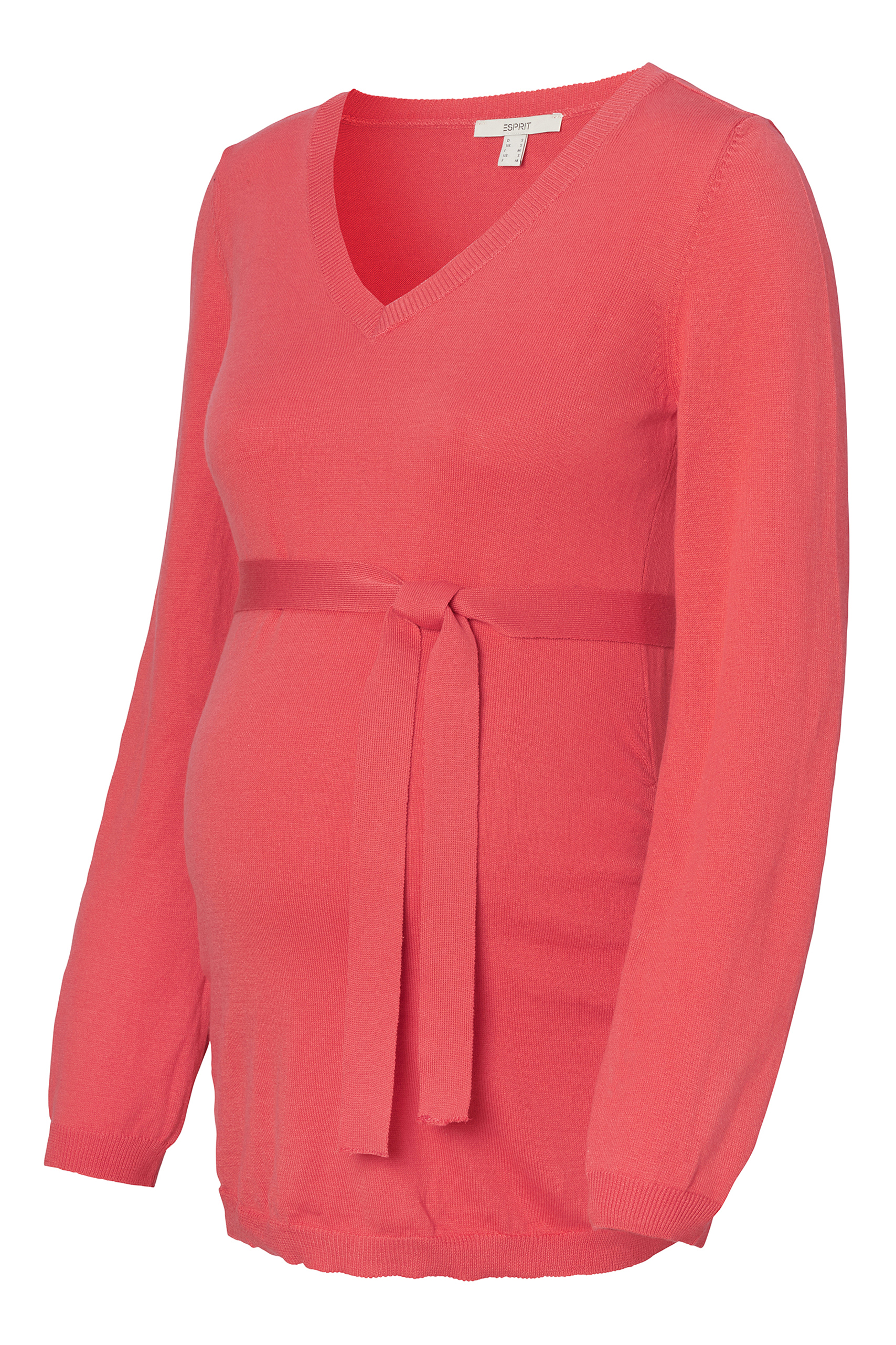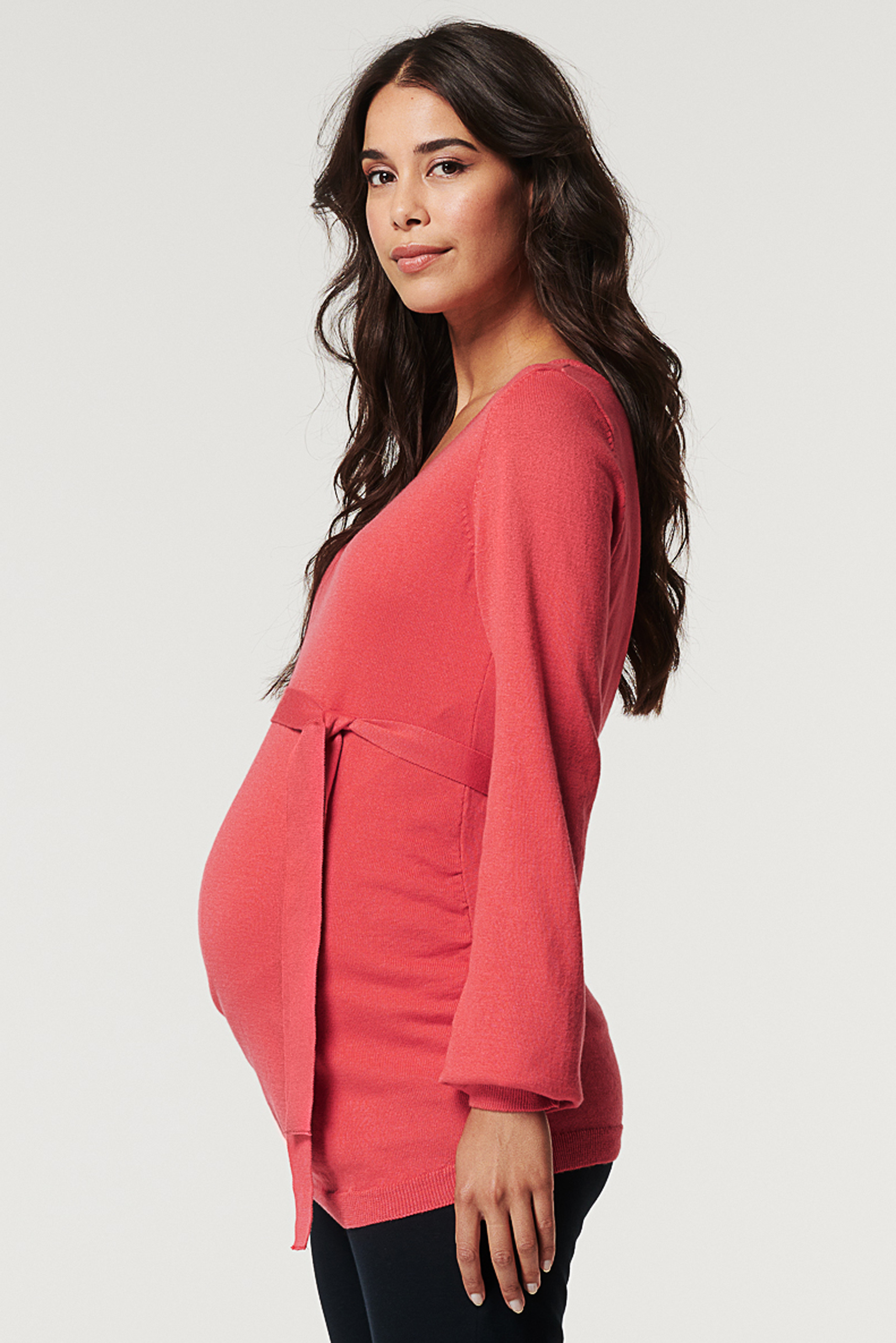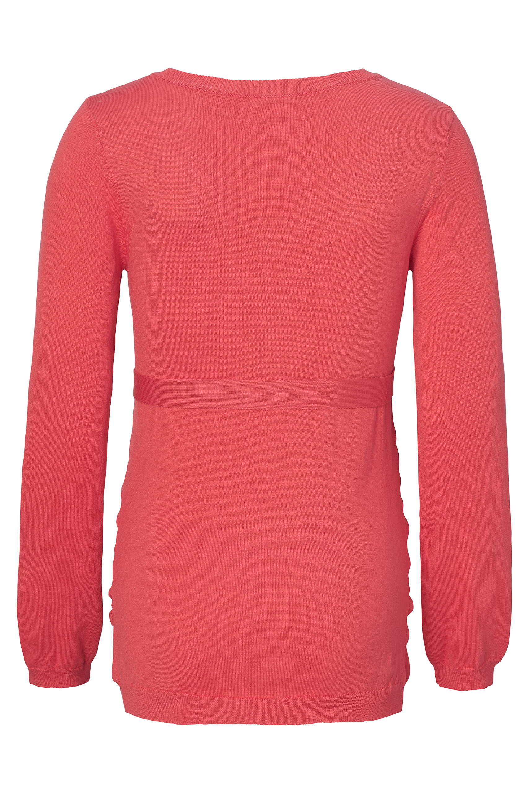 Leichter Umstandspullover mit V-Ausschnitt und Bündchen an den Ärmeln und am Saum. Dank des längeren Schnitt bedeckt der weiche Pullover mit Bio-Baumwolle deinen Babybauch vollständig, egal wie groß er ist. Der abnehmbare Bindegürtel betont ihn dabei besonders schön. Farbe: koralle