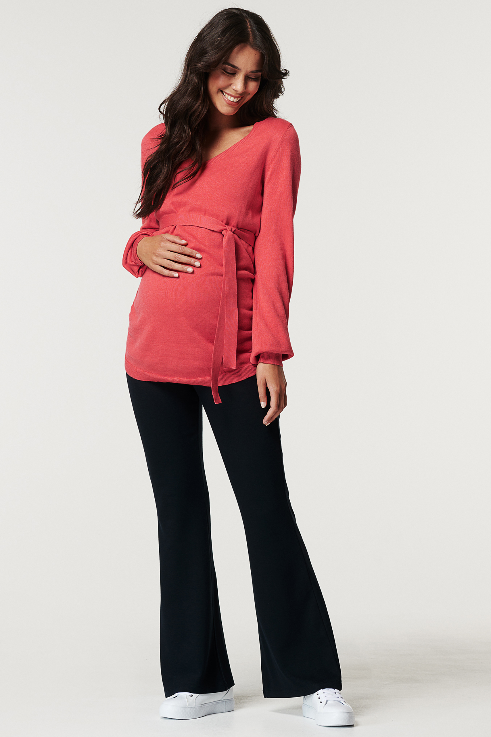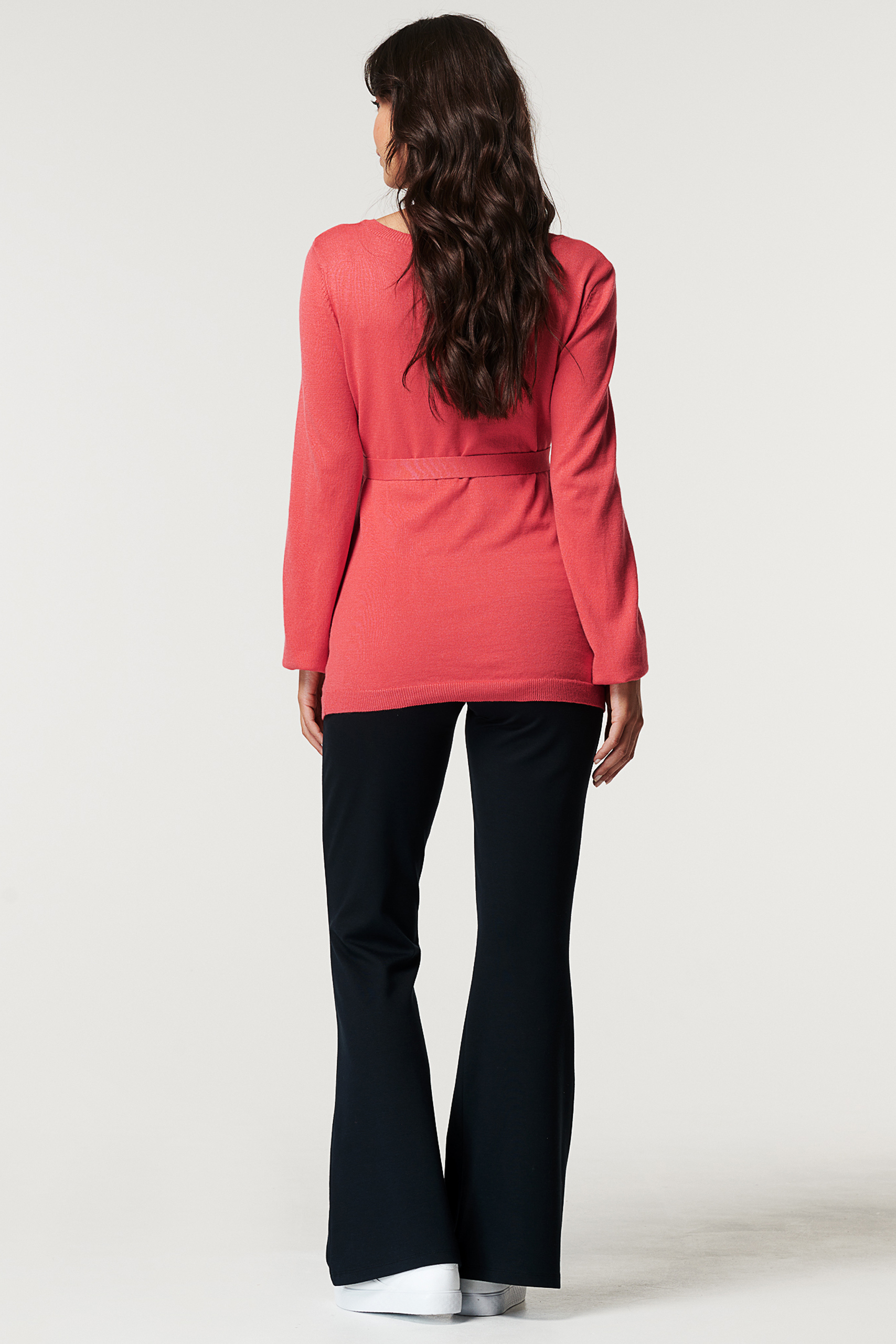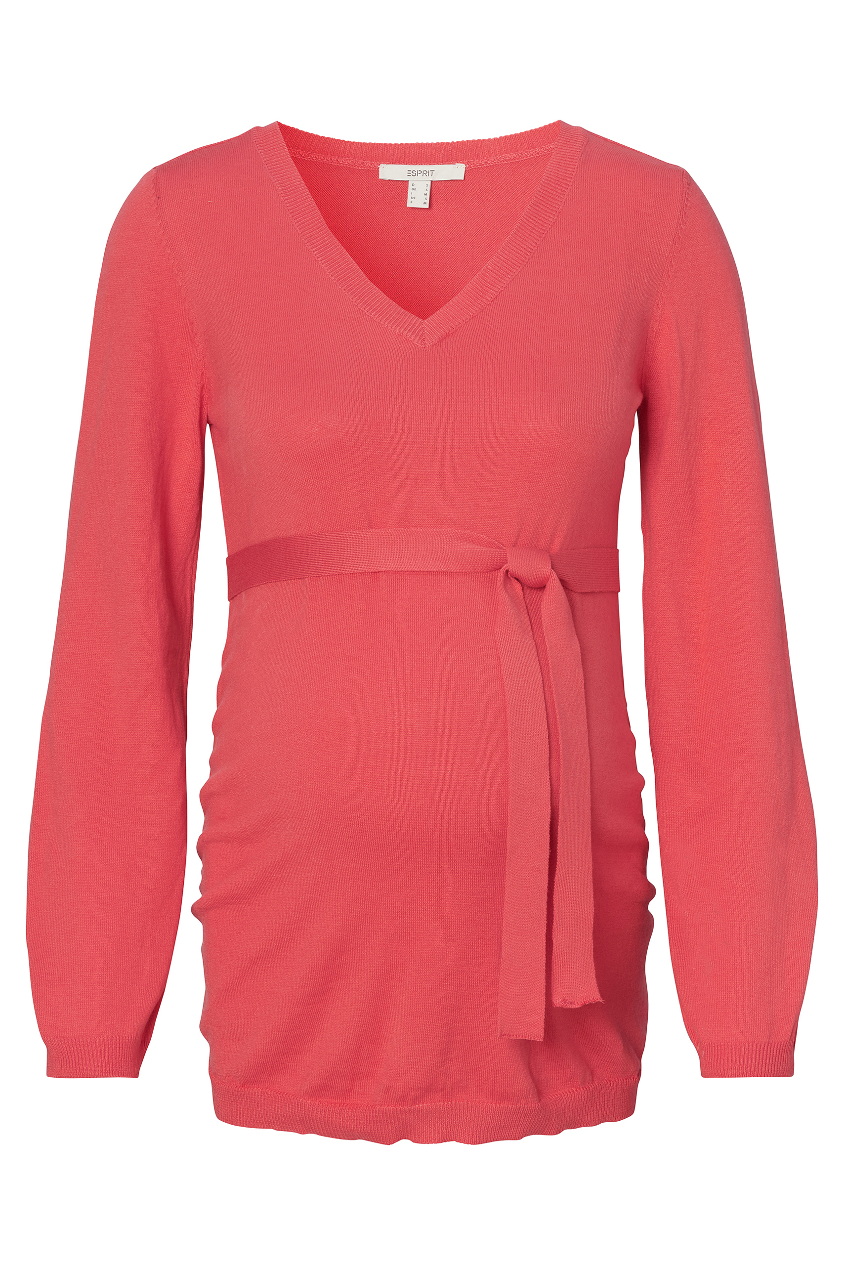 Leichter Umstandspullover mit V-Ausschnitt und Bündchen an den Ärmeln und am Saum. Dank des längeren Schnitt bedeckt der weiche Pullover mit Bio-Baumwolle deinen Babybauch vollständig, egal wie groß er ist. Der abnehmbare Bindegürtel betont ihn dabei besonders schön. Farbe: koralle