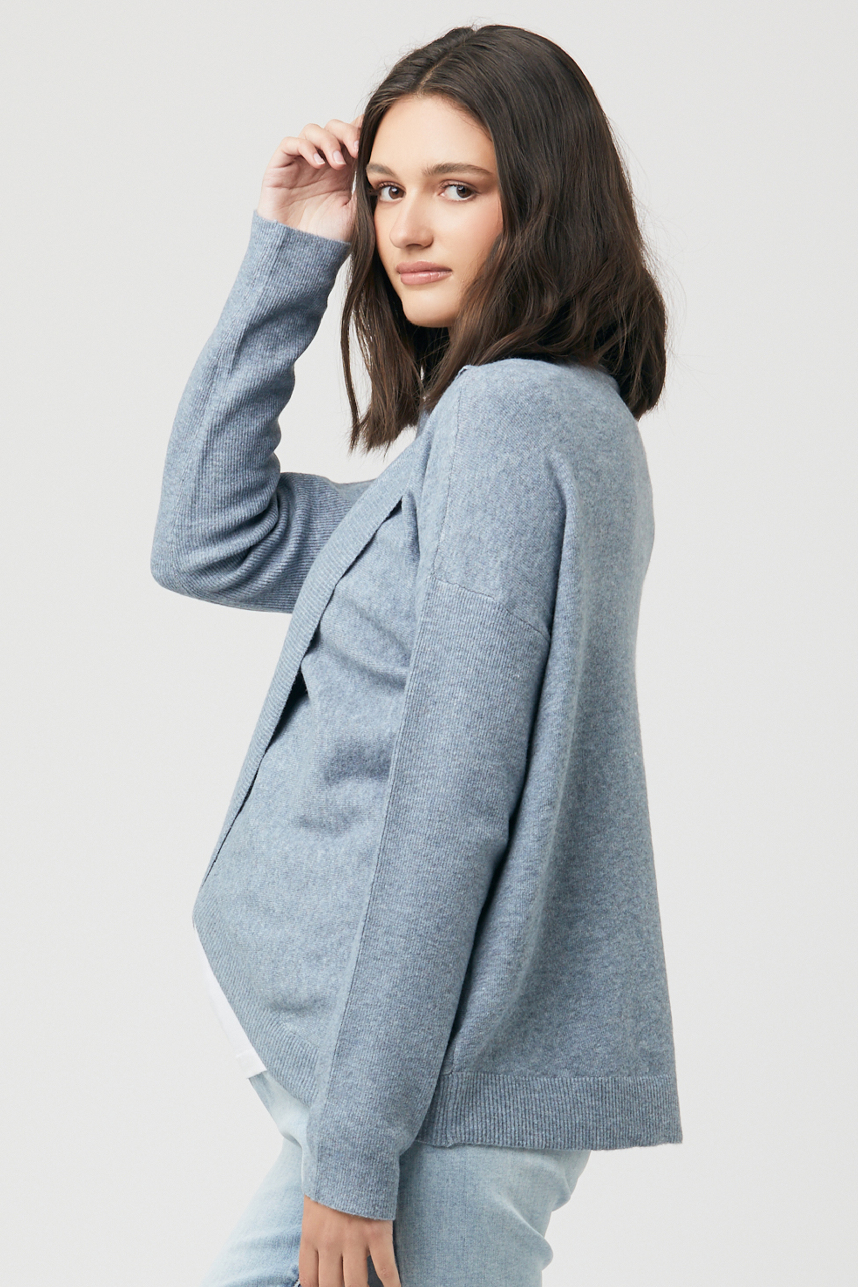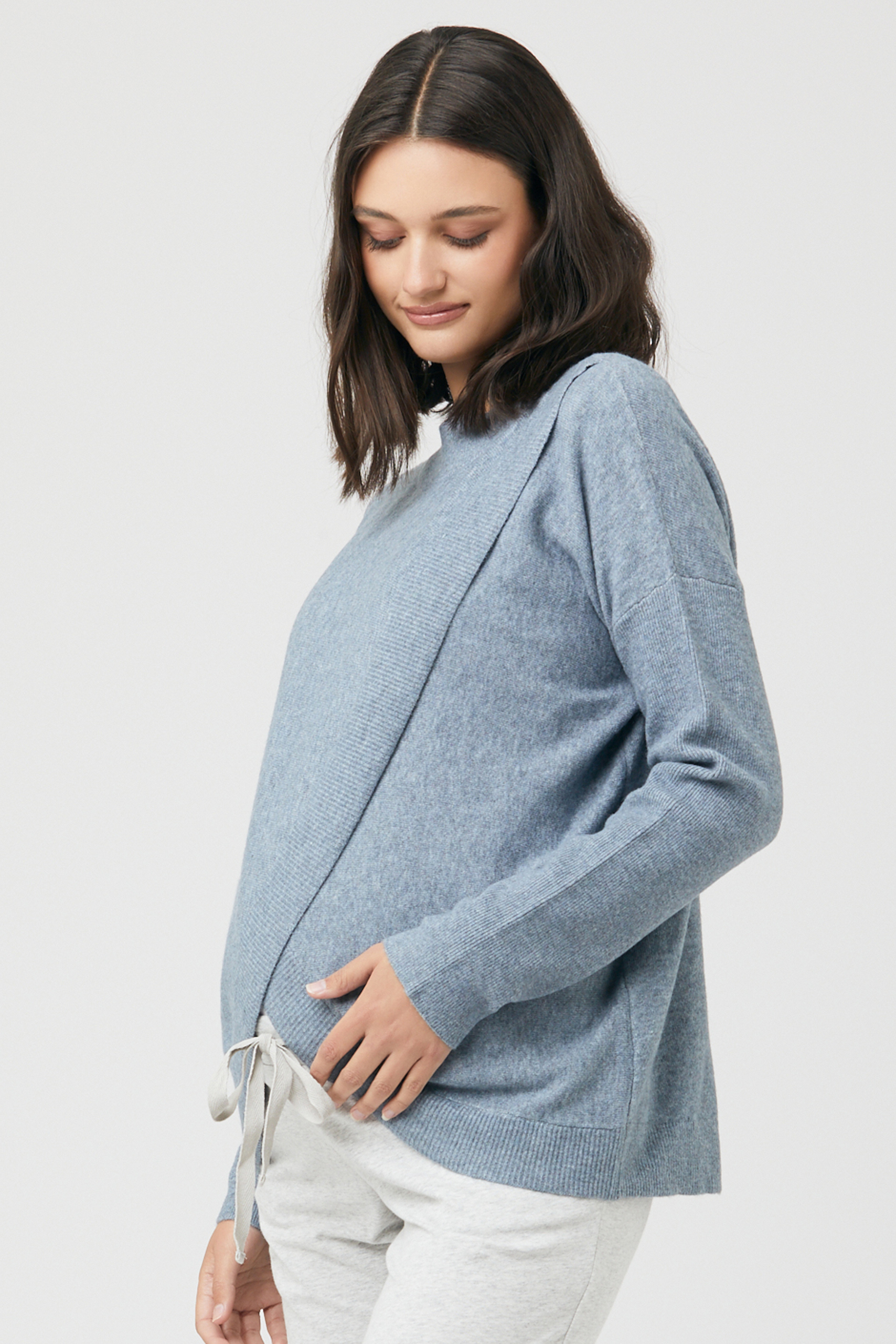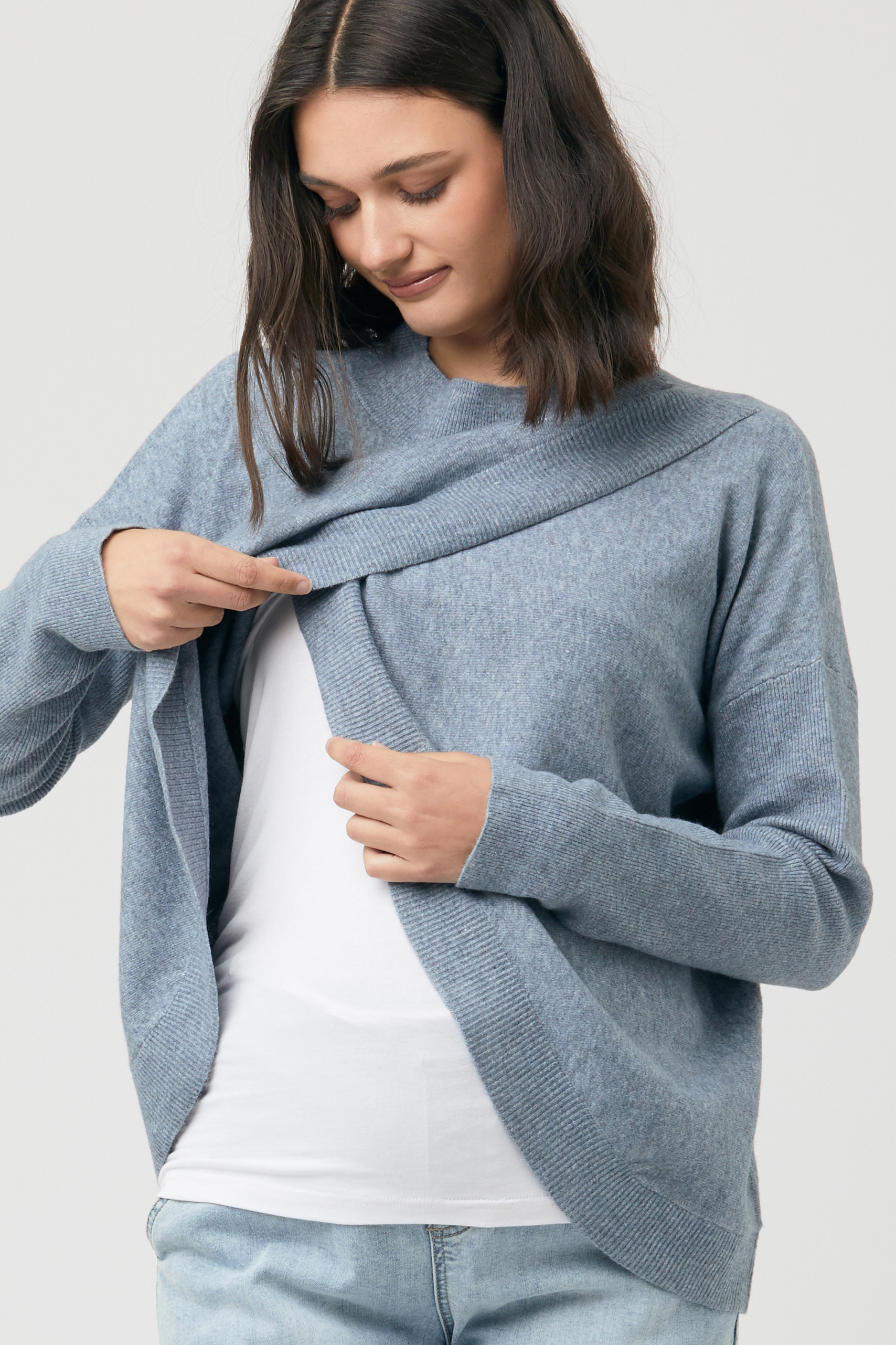 Cross-Over Umstands- und Still-Pullover aus angenehmen, softem Strick. Das elegante Cross-Over Design ist ein trendiger Hingucker für deinen Look. Nach der Geburt kannst du die einzelnen Stofflagen hochschieben und dein Baby so ganz einfach und diskret stillen. Farbe: blaugrau
