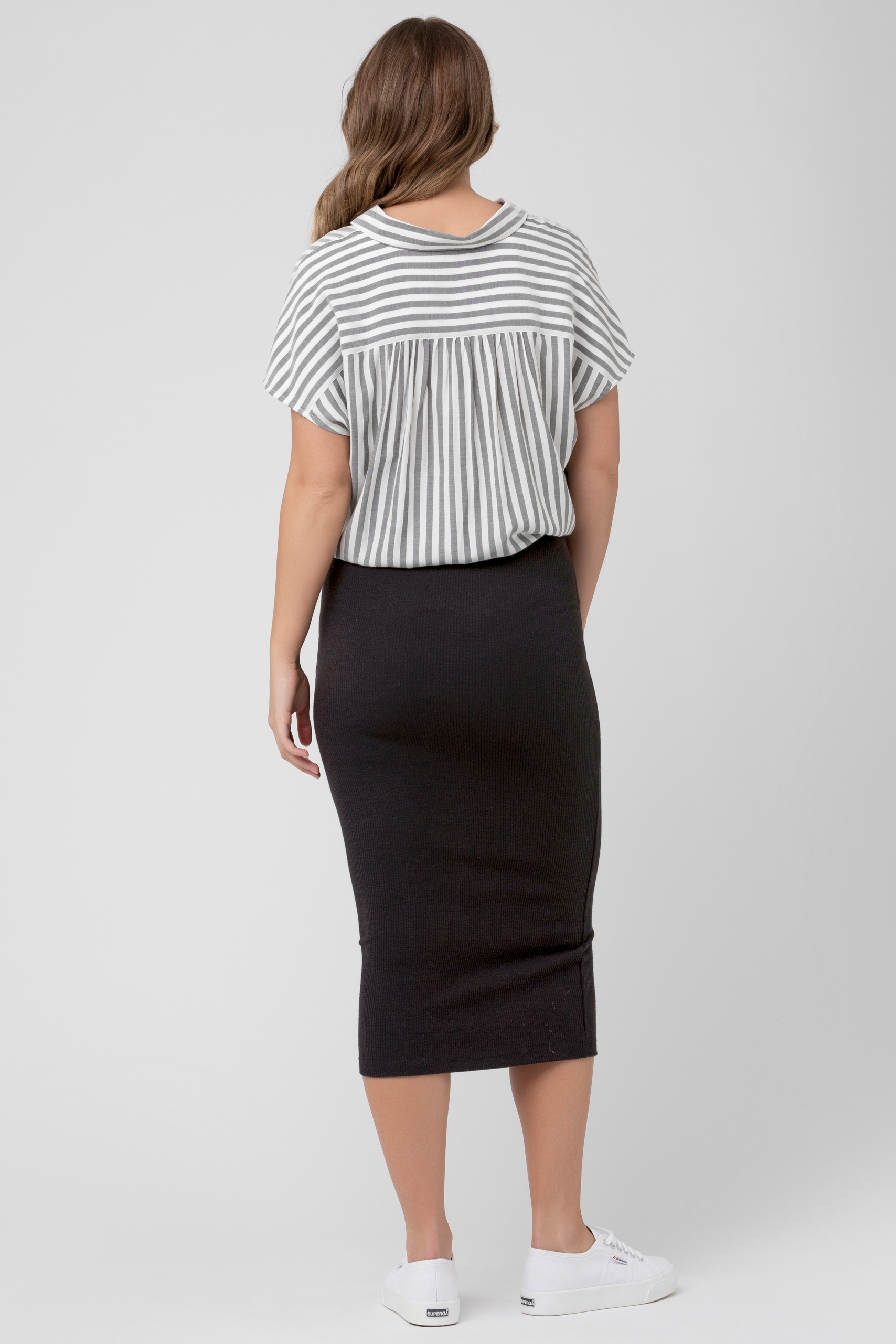 Midi Ripp Umstandsrock in figurbetonter Passform. Du kannst selbst entscheiden, ob du den Bund über deinem Babybauch oder unterhalb tragen möchtest. Dank des elastischen Materials, kannst du den Rock auch weiterhin nach deiner Schwangerschaft tragen. Farbe: schwarz
