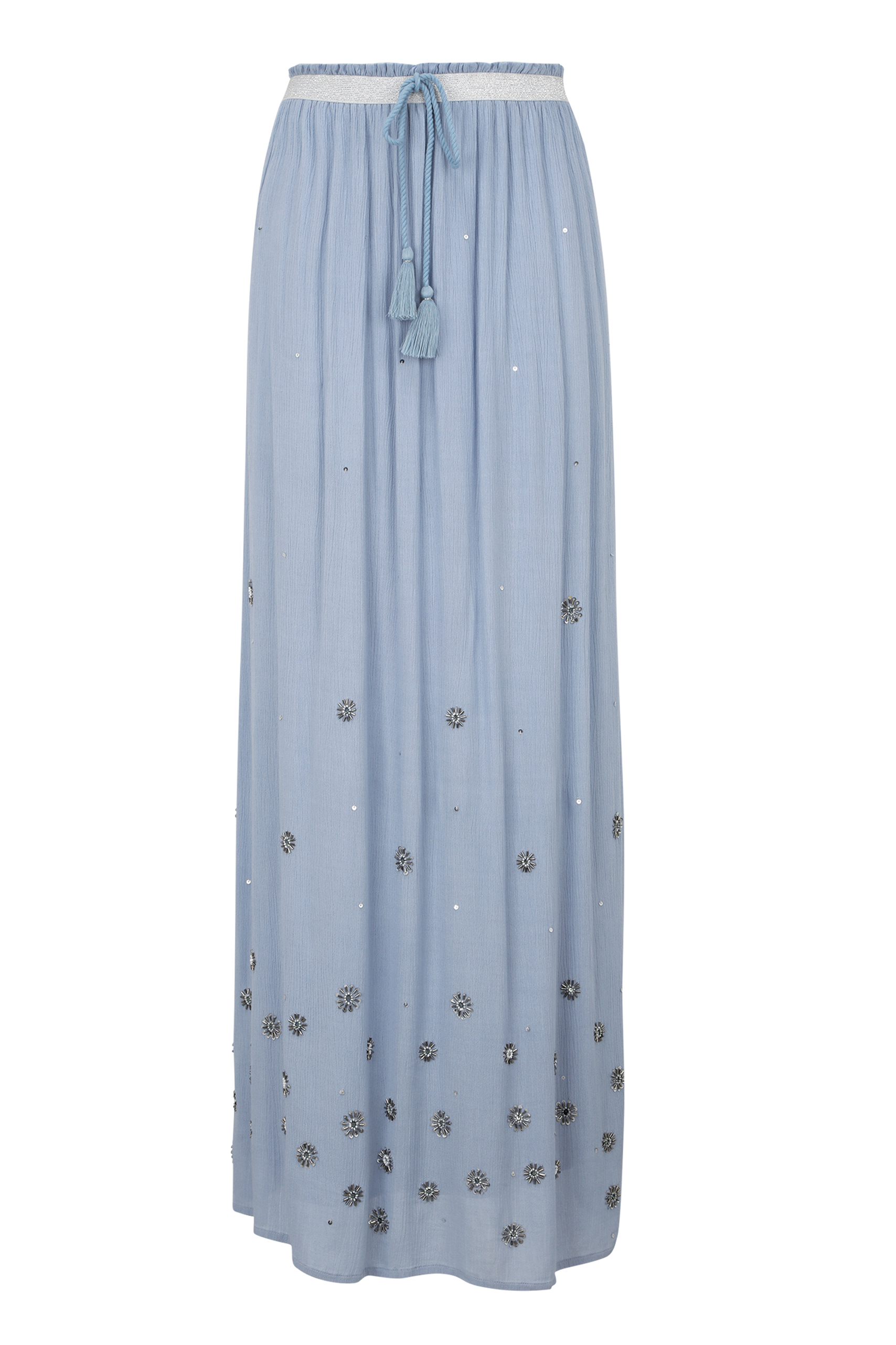 Maxi Umstandsrock aus herrlich weichem Material mit passendem Unterrock, zarten Applikationen und glänzendem Bund mit Tunnelzug und Quasten. Der Rock wurde unter fairen Arbeitsbedingungen hergestellt. Er lässt sich bequem oberhalb des Bauches tragen und flexibel an deine Figur anpassen. Perfekt für die gesamte Schwangerschaft und danach! Farbe: hellblau