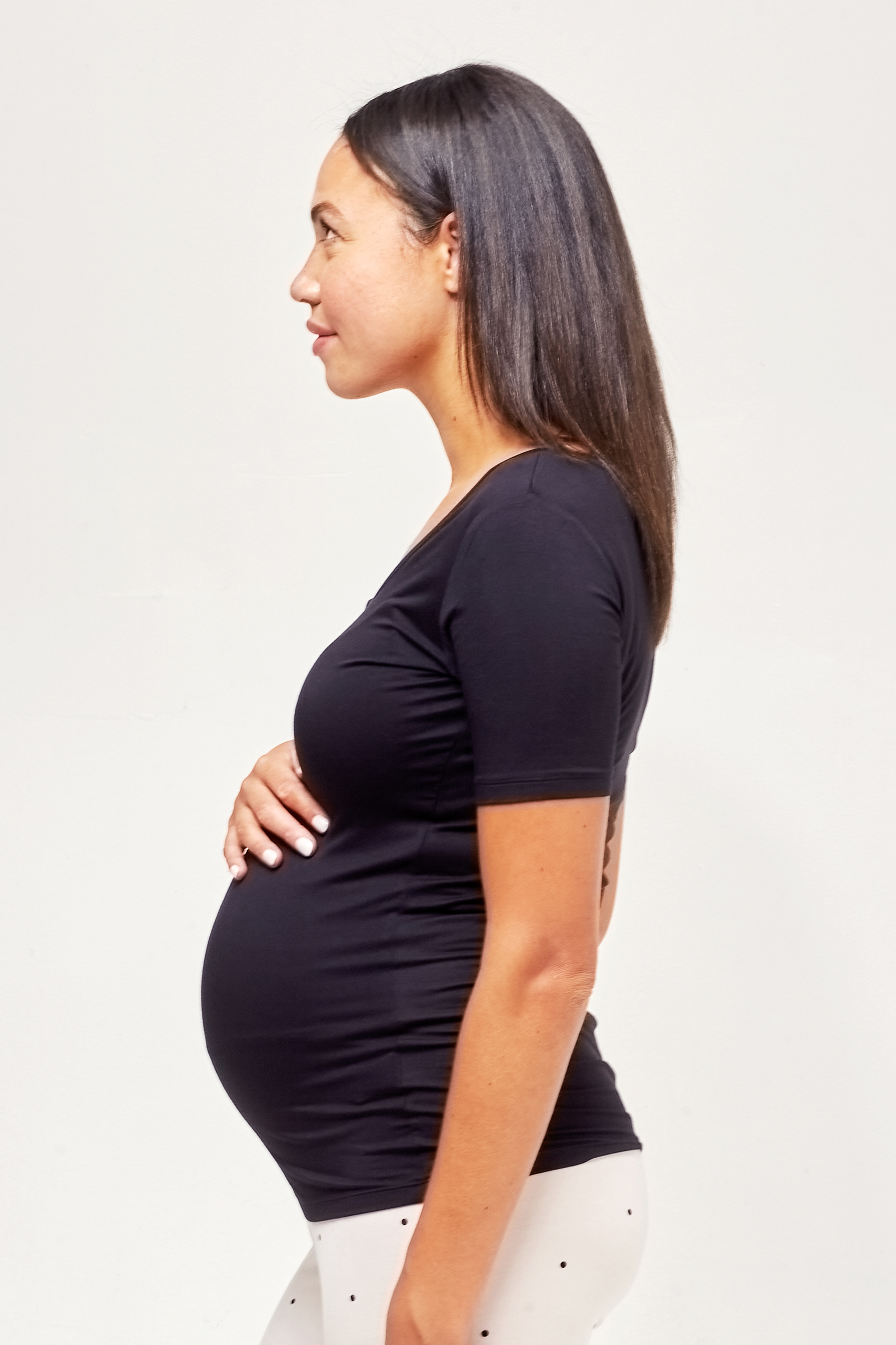 Henley Umstands- und Stillshirt aus weicher Bambus-Viskose mit Druckknopfleiste und eingearbeitetem Bustier, das deiner Brust extra Halt gibt. Nach der Geburt erhältst du über die Knopfleiste einen einfachen Stillzugang. Farbe: schwarz