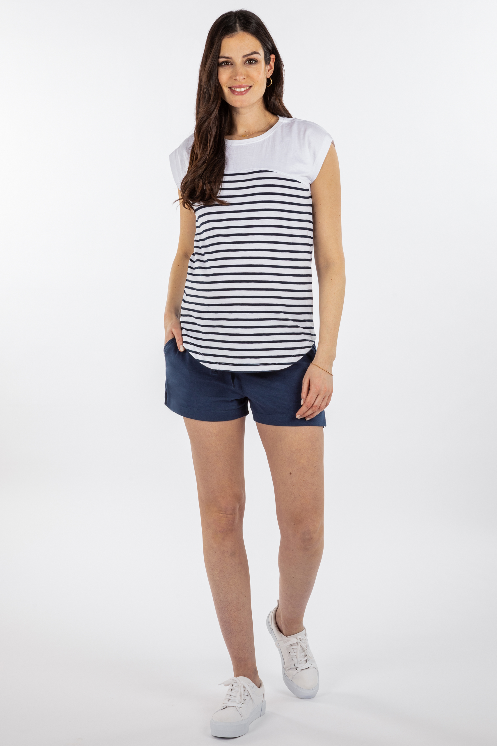 Gestreiftes Umstands- und Stillshirt aus Flammgarn-Jersey (100% Bio-Baumwolle) mit Rundhalsausschnitt und kurzen Raglanärmeln. Der lockere Schnitt lässt deinem Babybauch genügend Platz zum Wachsen. Über kleine Druckknöpfe auf den Schultern kannst du das Shirt öffnen und herunterklappen, sodass du dein Baby später bequem darin stillen kannst. So kannst du das leichte Shirt auch ohne Babybauch noch lange weitertragen. Farbe: navy/weiß
