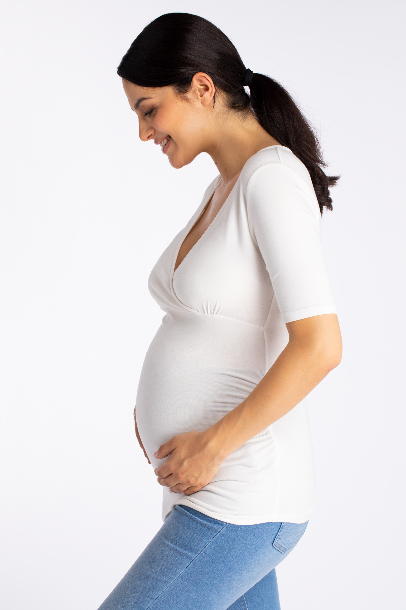 Umstands- und Stillshirt nachhaltiger Livaeco* Viskose mit Cache-Coeur Ausschnitt und 3/4 Ärmeln. Das neuartige, besonders weiche und dehnbare Gewebe trägt sich super angenehm. Raffungen an der Brust und den Seitennähten stellen sicher, dass dir das Shirt bis zur Geburt bequem passt ohne zu spannen. Nach der Geburt kannst du dein Baby ganz einfach darin stillen, indem du die doppelten Stofflagen des Oberteils auseinanderschiebst. Farbe: off-white