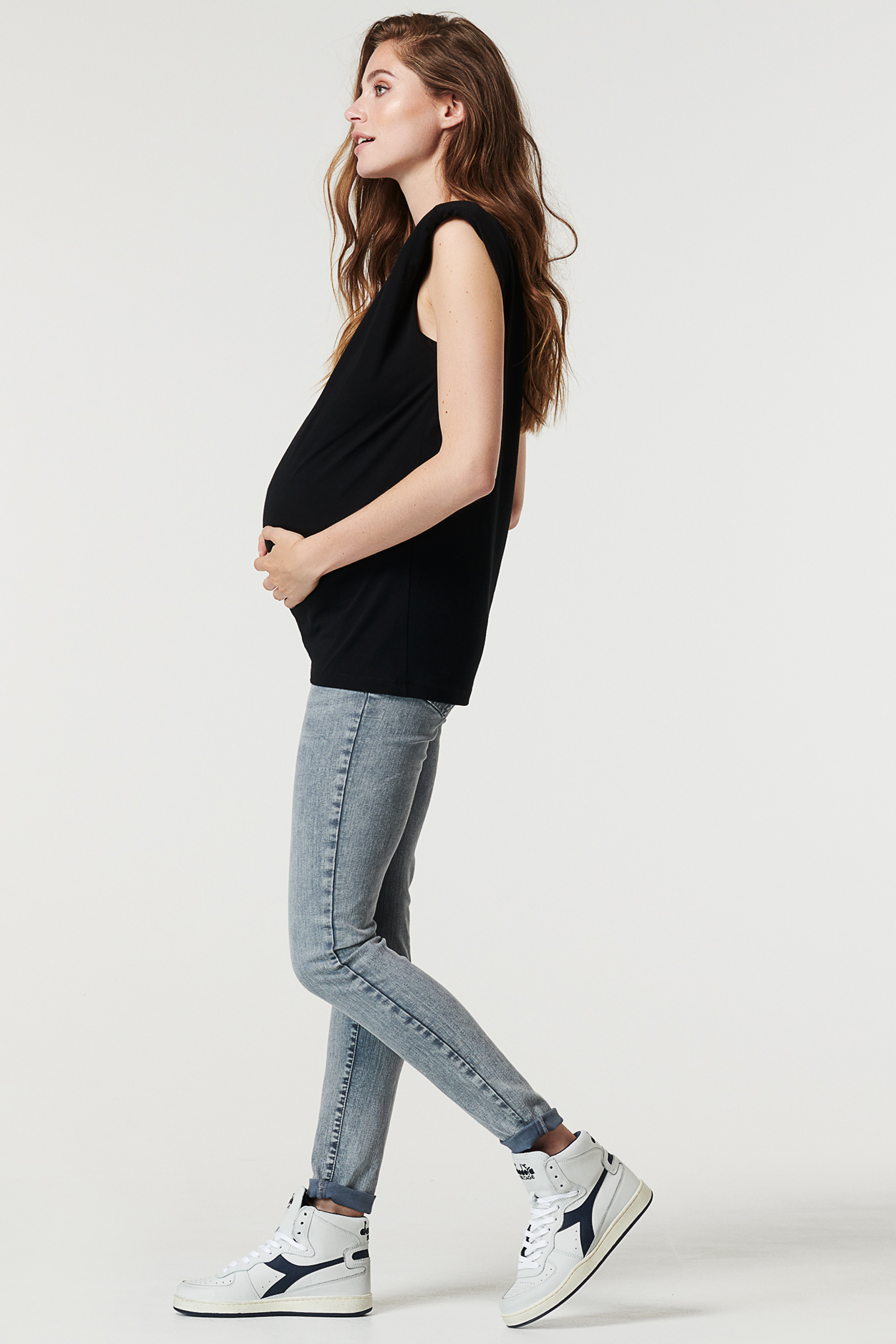 Umstandsshirt aus reiner Bio-Baumwolle mit Schulterpolstern, die dem Oberteil eine tolle Form verleihen. Das Shirt liegt eng an und betont deinen Babybauch besonders schön. Dank des weichen, stretchigen Materials hat er dennoch bis zur Geburt genügend Spielraum. Du kannst das Shirt zum Beispiel mit Jeans, Rücken oder einer lässigen Jogginghose kombinieren. Farbe: schwarz