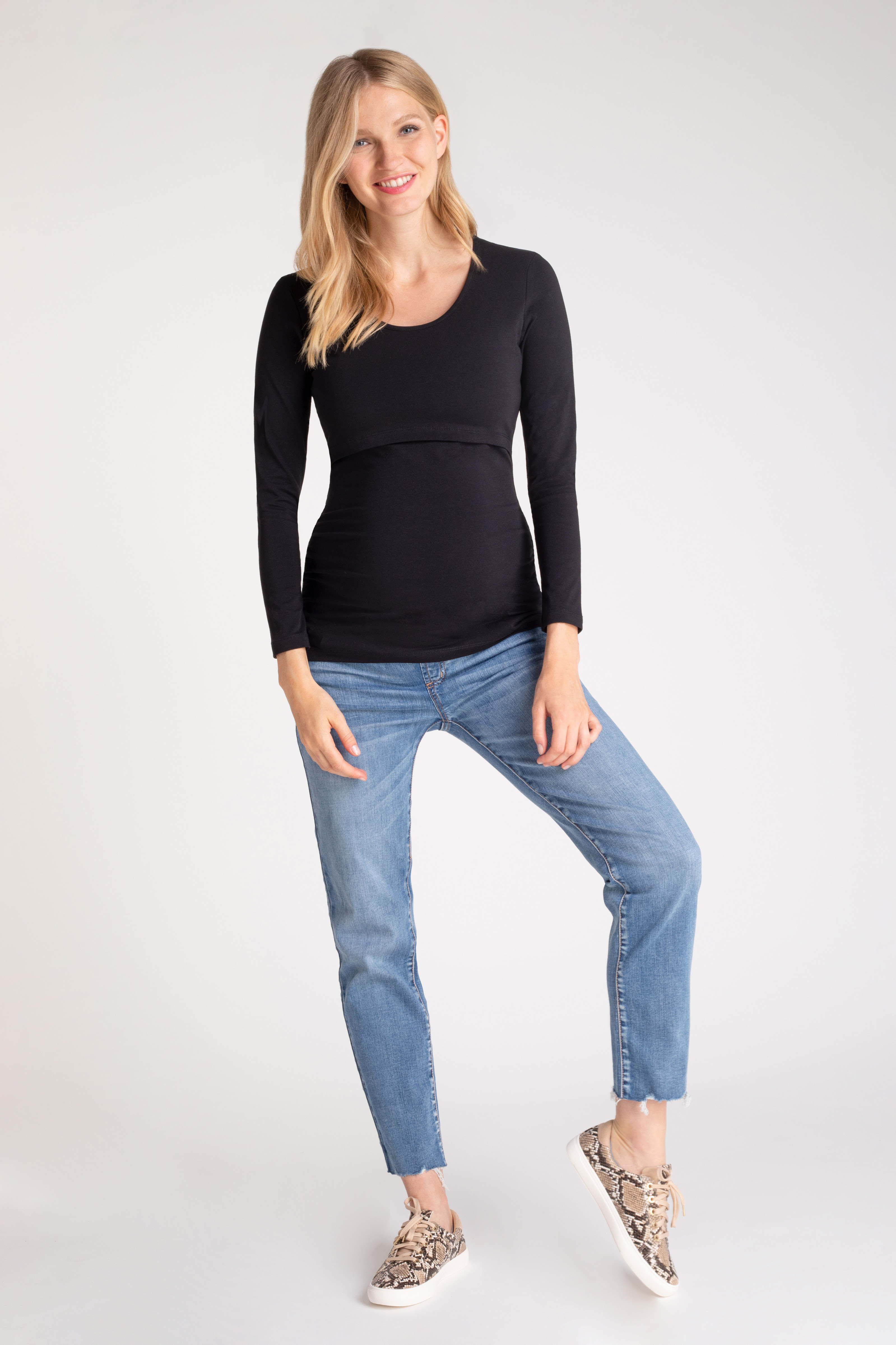 Umstands- und Stillshirt aus weicher Bio-Baumwolle mit Rundhalsausschnitt und langen Ärmeln. Der spezielle Schnitt des Shirts sorgt dafür, dass dein Bauch in allen Phasen der Schwangerschaft ausreichend Spielraum hat. Nach der Geburt kannst du problemlos darin stillen, indem du die beiden Stofflagen auseinander schiebst. Farbe: schwarz