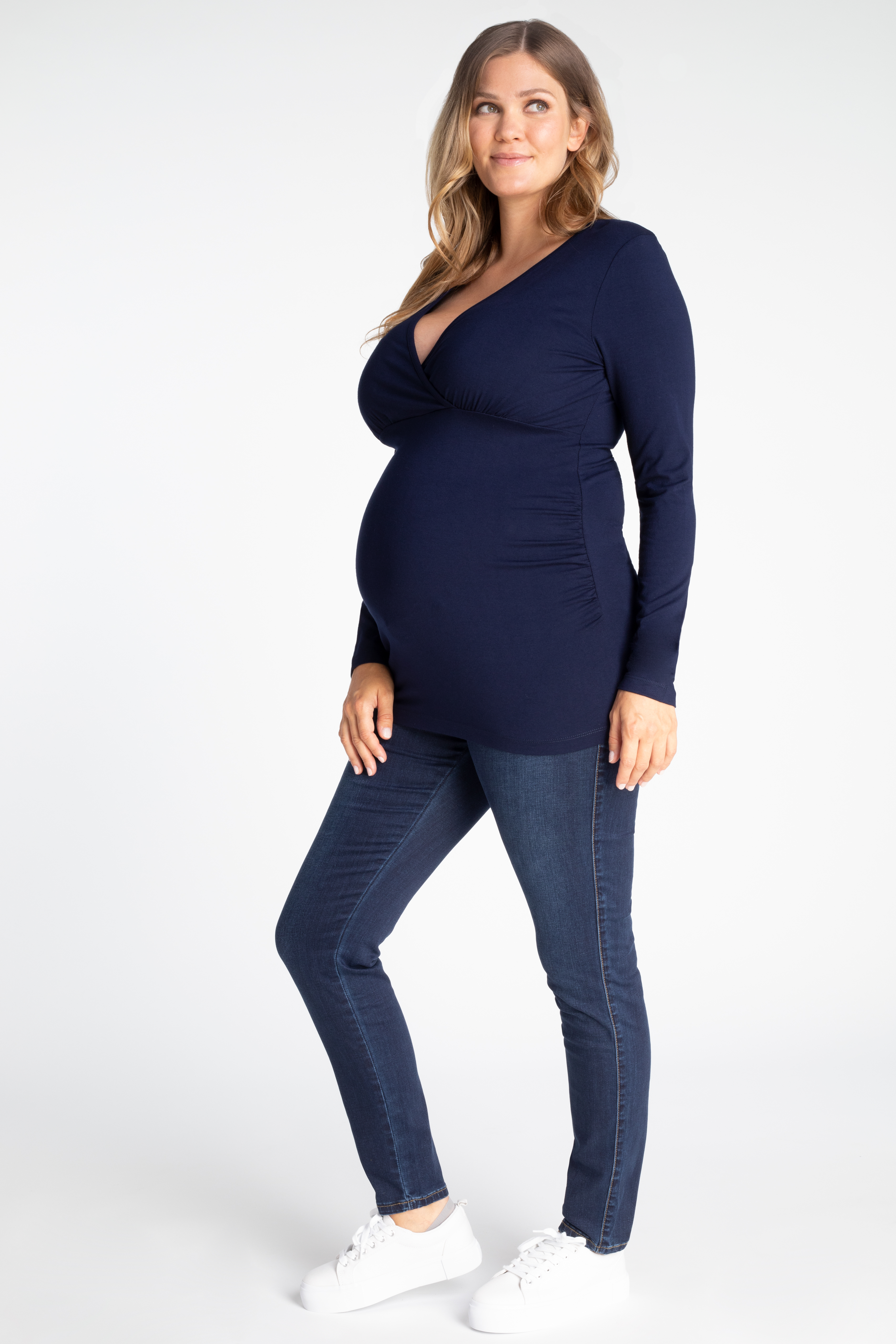 Weiches Cache-Coeur Umstands- und Stillshirt aus anschmiegsamer Viskose. Der spezielle Schnitt des Shirts sorgt dafür, dass dein Bauch in allen Phasen der Schwangerschaft ausreichend Spielraum hat. Nach der Geburt kannst du dank des flexiblen Ausschnitts bequem darin stillen. Farbe: navy