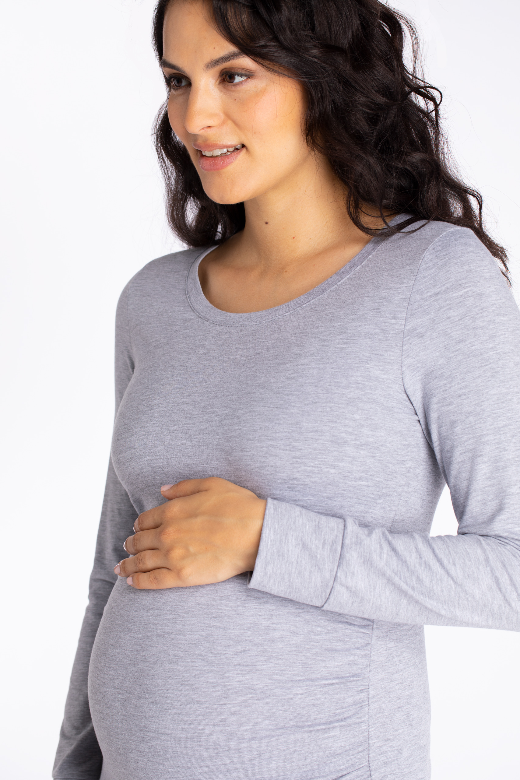Umstandsshirt aus Bio-Baumwolle mit Rundhalsausschnitt und abgerundetem Saum. Raffungen an den elastischen Seitennähten geben deinem wachsenden Bauch genügend Spielraum. Du kannst es als Teil deiner Nachtwäsche tragen oder am Tag als neutrales Basic für deine casual Looks nutzen. Farbe: grau