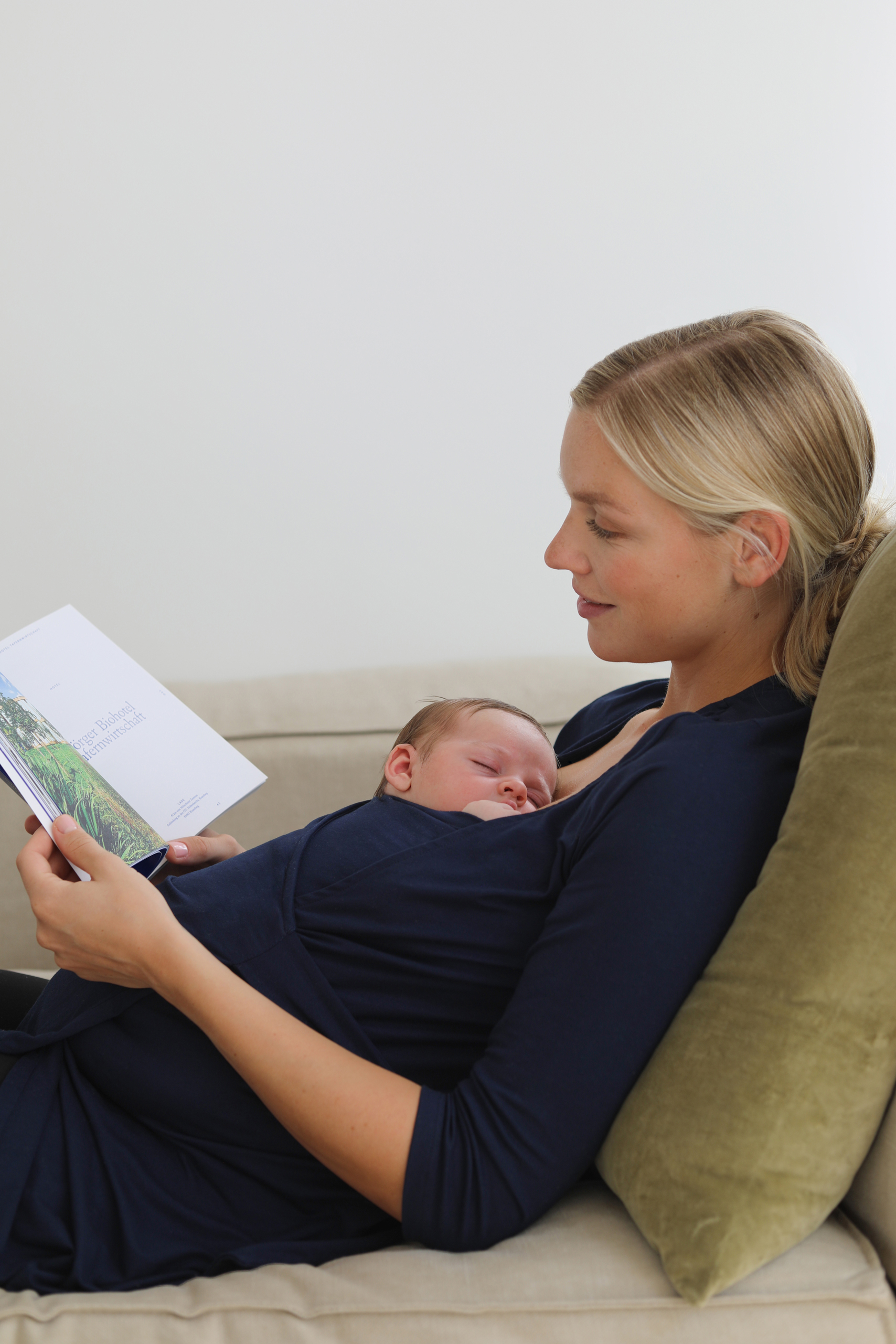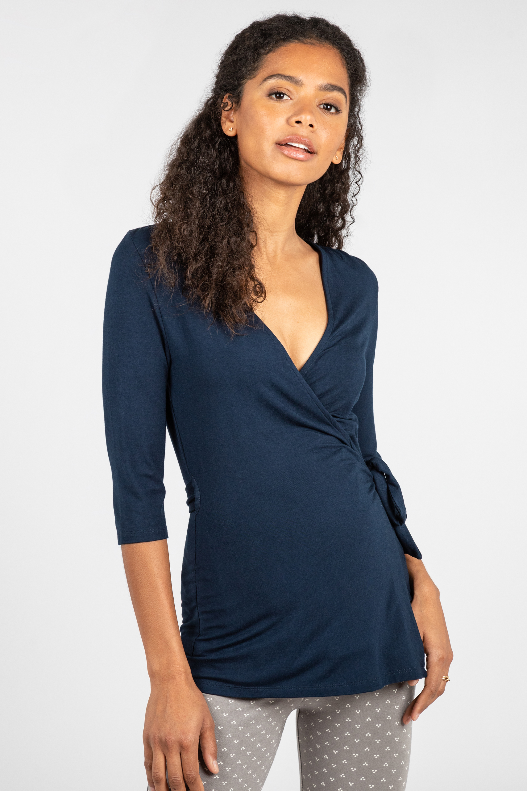 Eco Viskose Skin to Skin Baby Bonding Shirt mit 3/4 Ärmeln und V-Ausschnitt aus nachhaltiger Livaeco* Viskose. Das Shirt ermöglicht dir direkten Haut-zu-Haut Kontakt mit deinem Baby, während du es trägst. Dein Baby (bis 7kg) liegt dabei auf deiner Brust unter einer integrierten Stofflage und schmiegt sich direkt an deine Haut, sodass ihr im Sitzen entspannt die Nähe genießen könnt. Der enge Körperkontakt, bei dem das Baby Wärme, Geruch und den Herzschlag der Mama spürt, hilft beim Bonding und festigt die emotionale Bindung. Durch das praktische Wickeldesign kannst du es in der Schwangerschaft bereits als Umstands- und danach als Stillshirt tragen. Der weiche Stoff liegt besonders sanft auf der Haut, dadurch ist ein maximales Wohlfühlen für dich und dein Neugeborenes garantiert. Farbe: navy