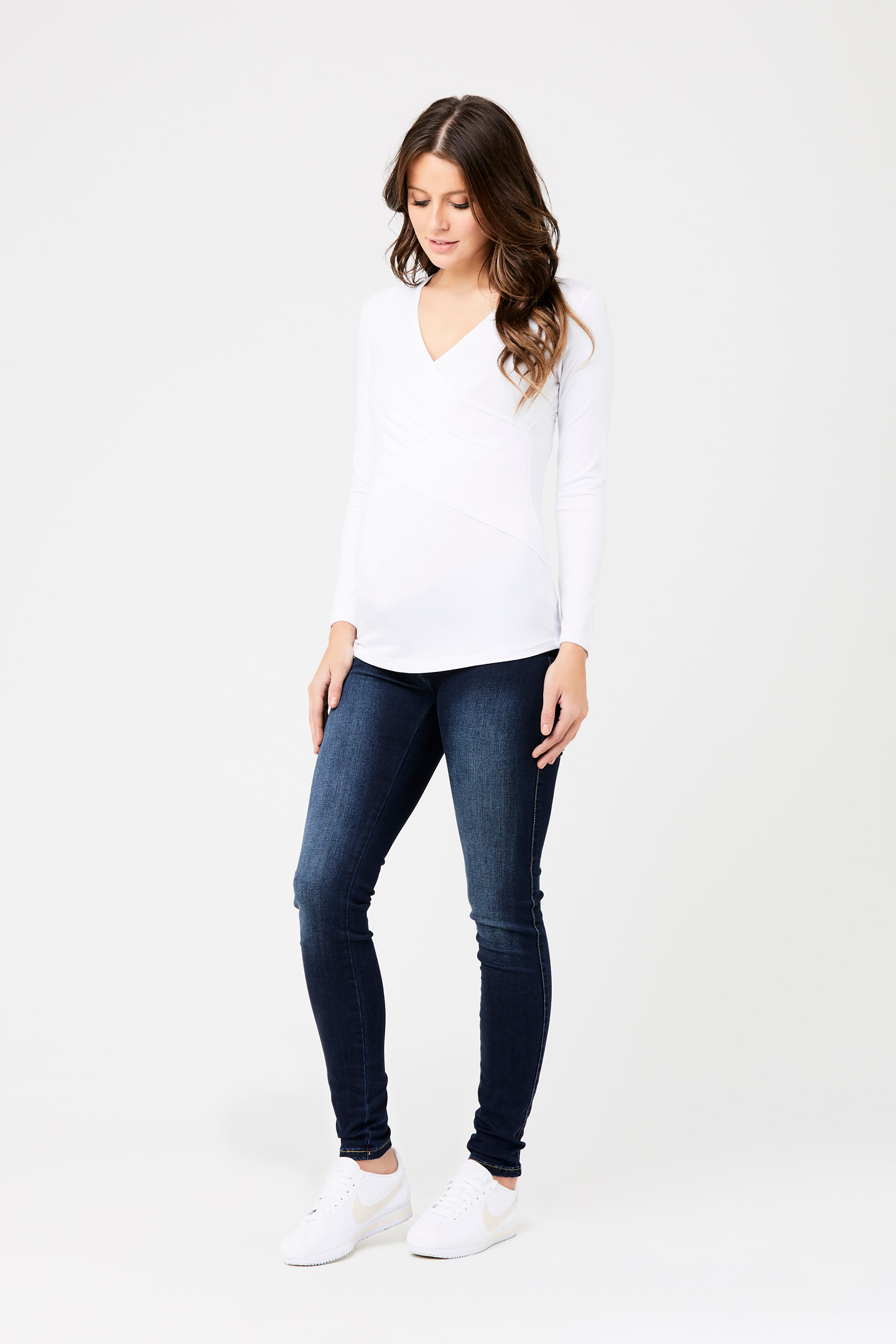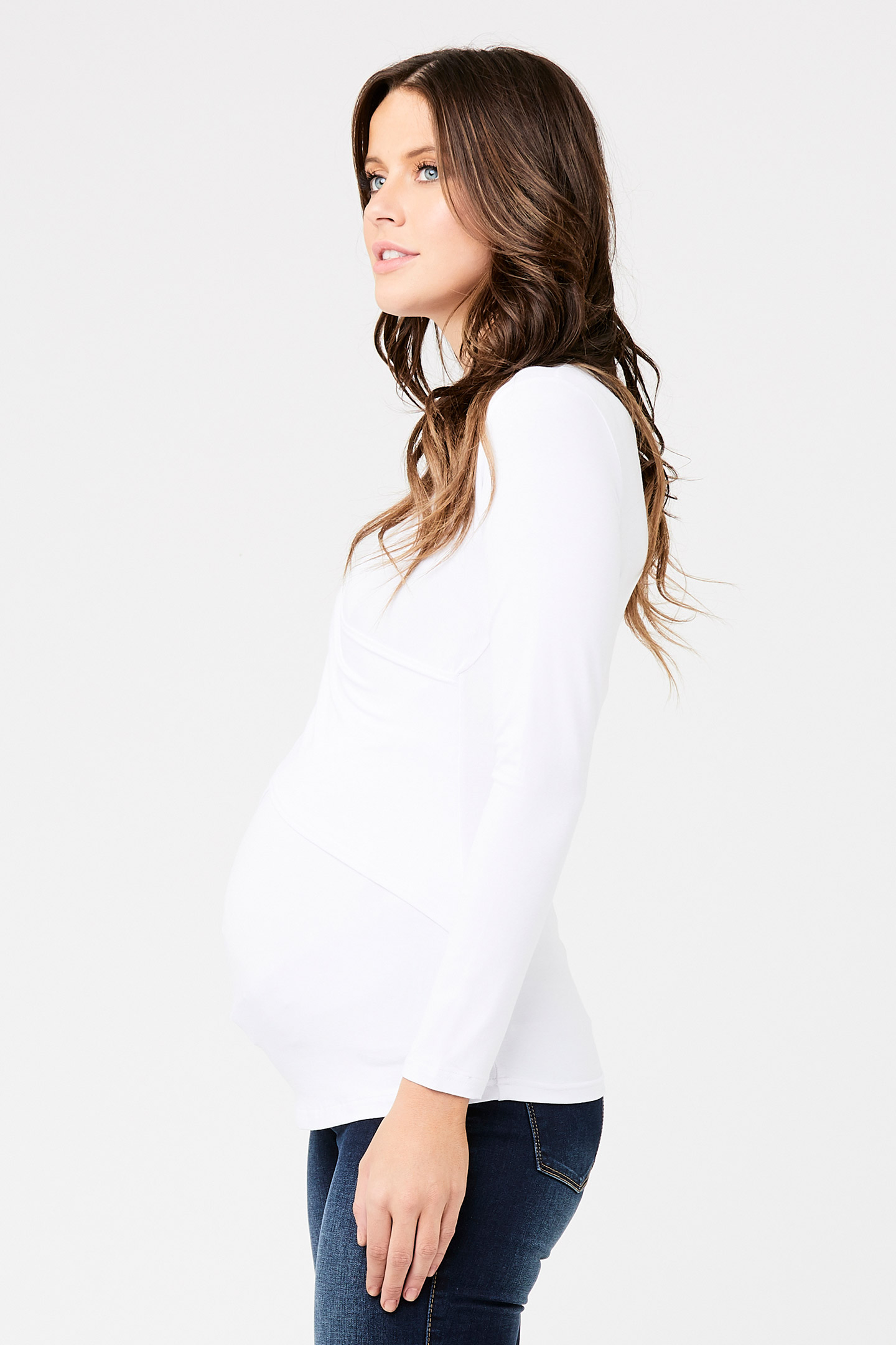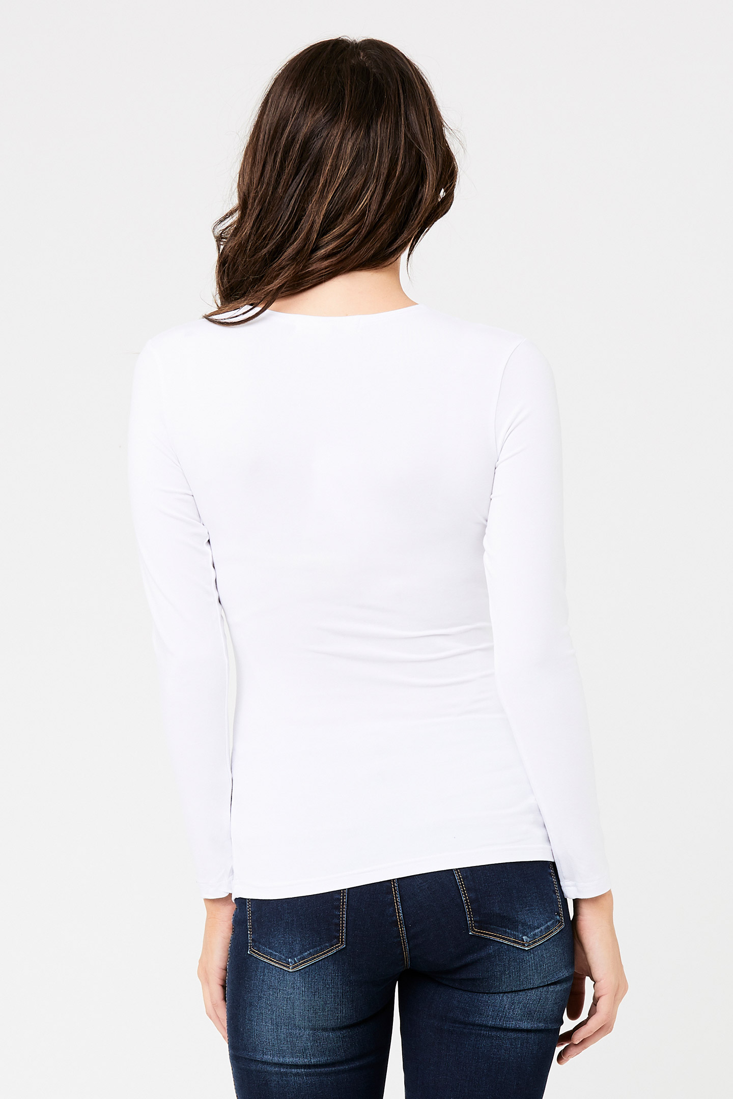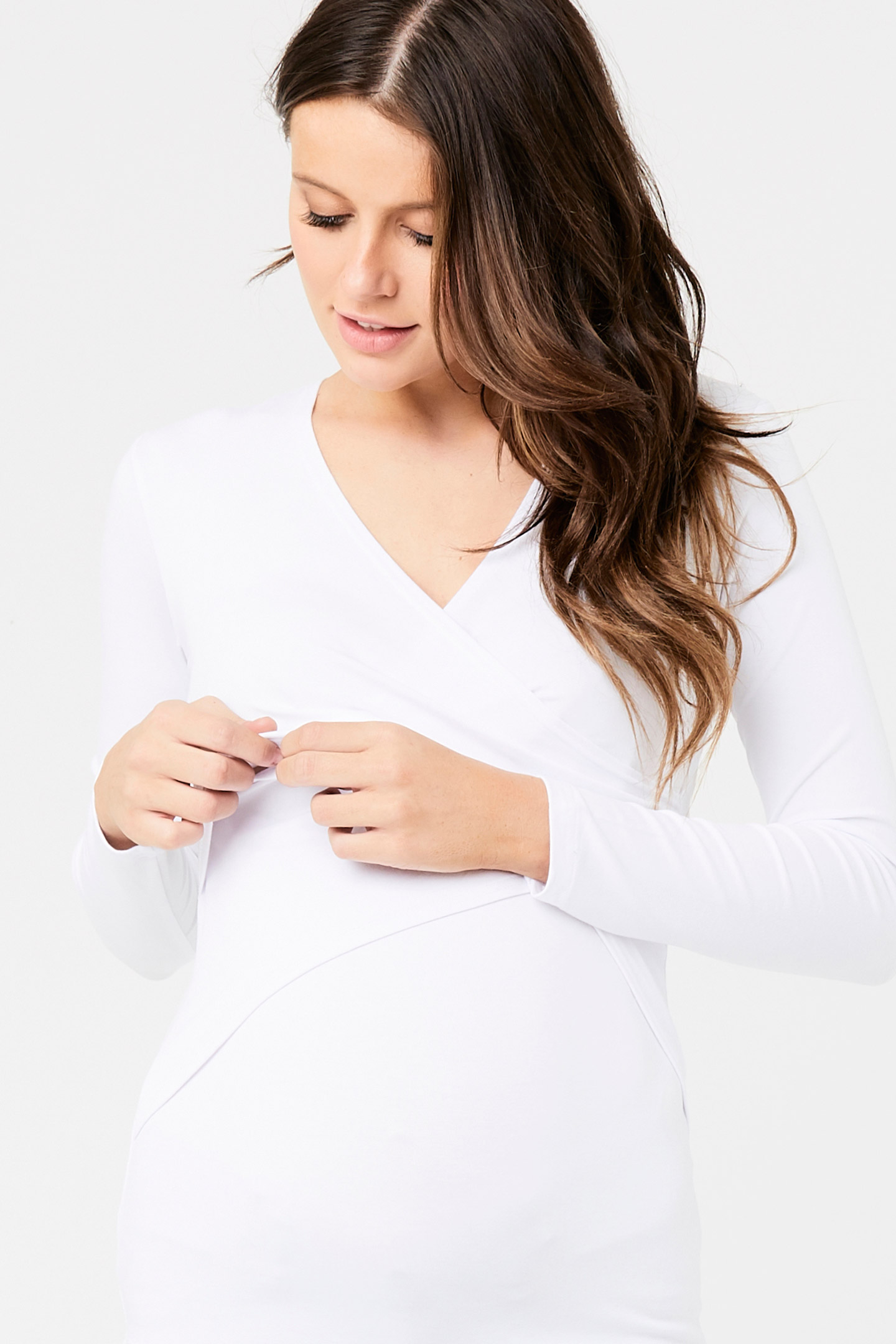 Umstands- und Stillshirt in figurbetonter Cross-Over-Optik mit V-Ausschnitt und langen Ärmeln. Das spezielle Design bietet dir nach der Schwangerschaft einen diskreten Stillzugang, indem du die Stoffe an der Naht einfach auseinander schiebst. Farbe: weiß