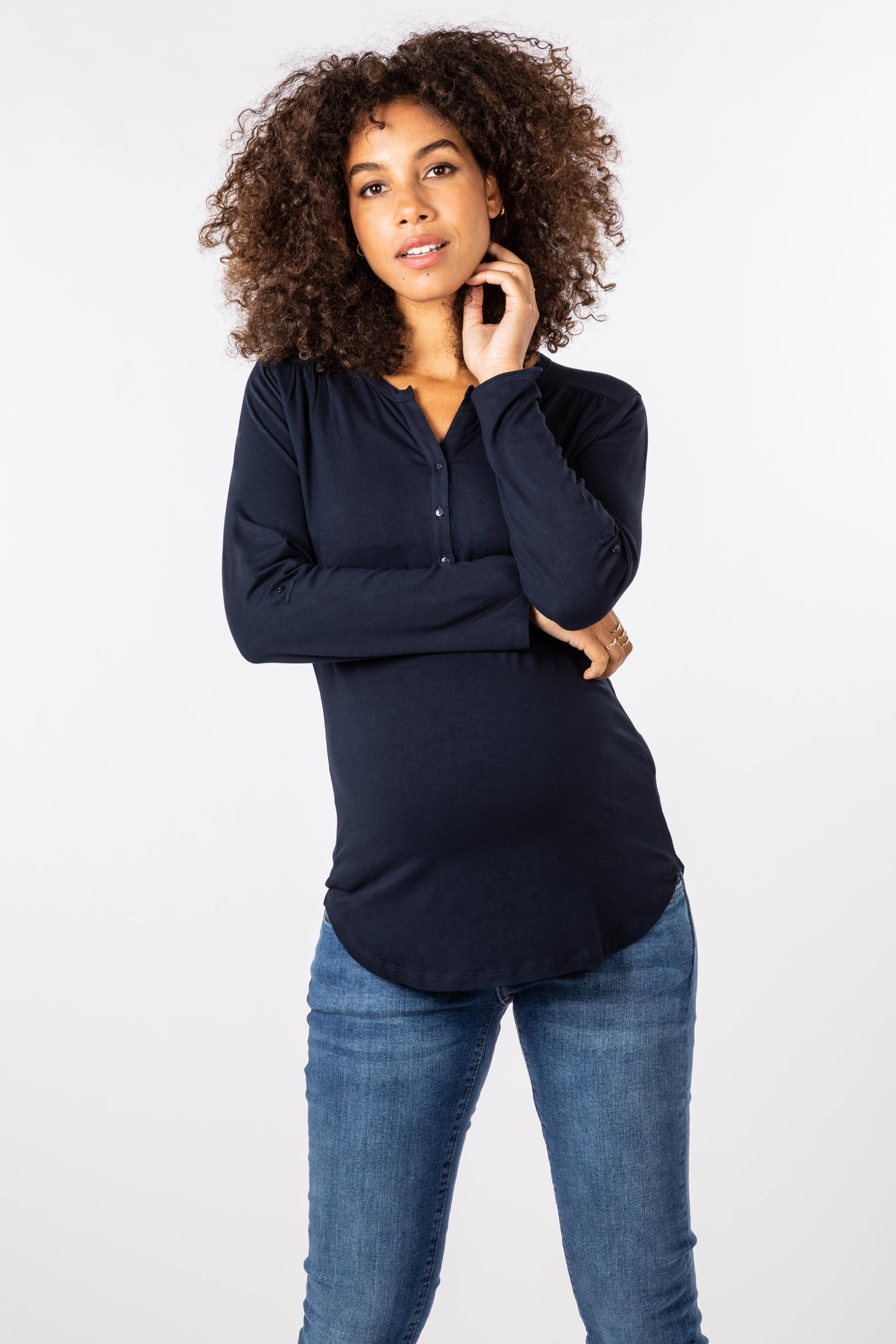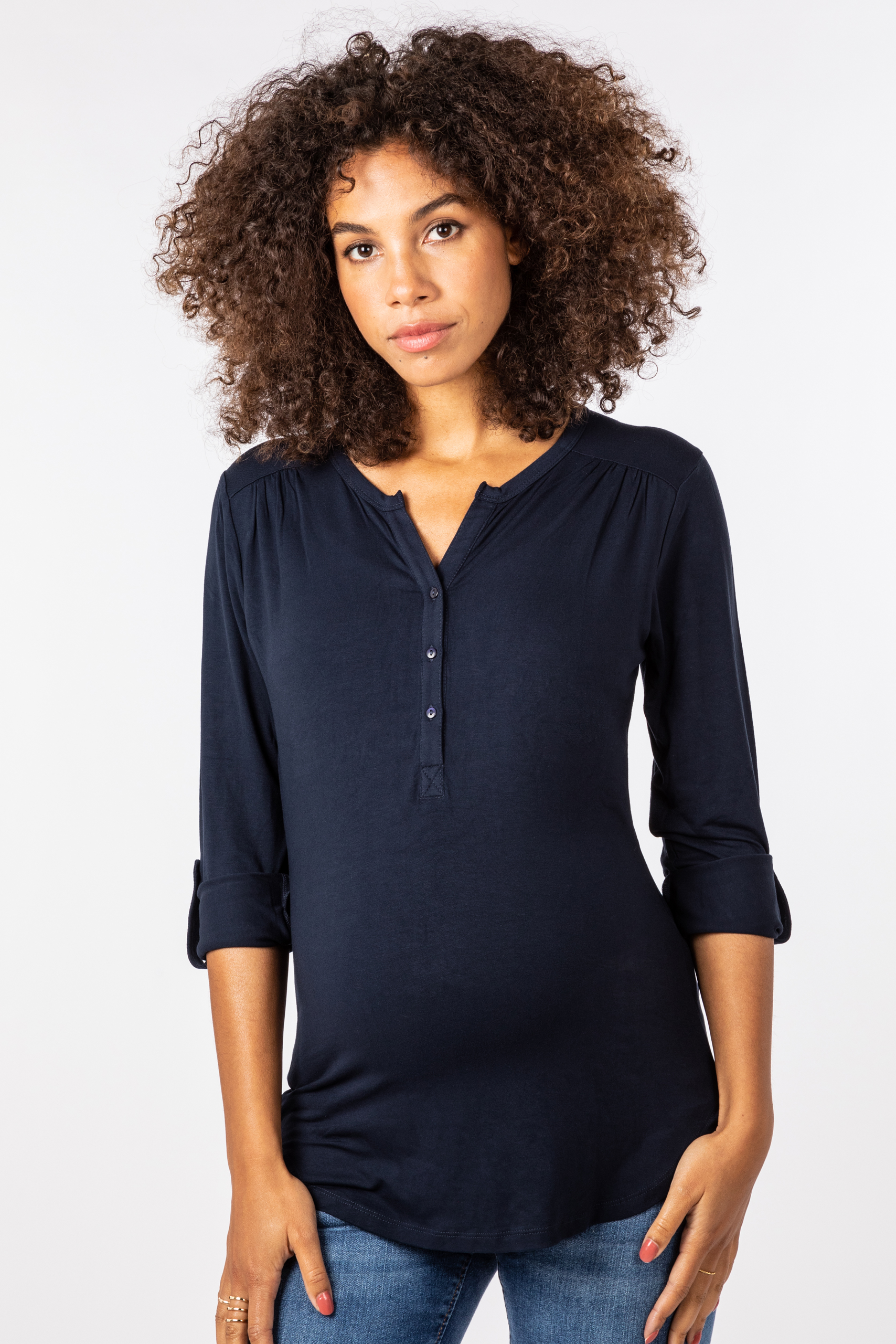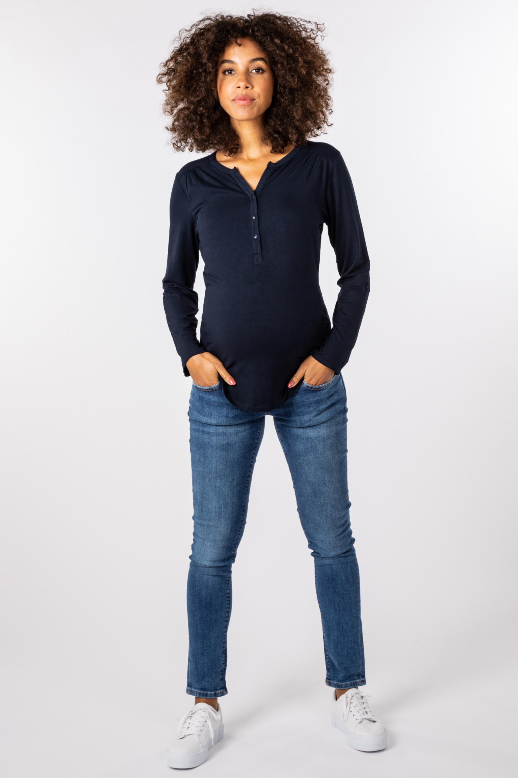 Henley Umstands- und Stillshirt mit Blockärmeln zum Hochkrempeln, V-Ausschnitt mit Knopfleiste und integriertem Bustier. Dieses sorgt für zusätzlichen Halt der Brust und ermöglicht durch die weitere Lage Stoff, Sichtschutz und einen diskreten Still-Zugang. Der weiche, elastische Stoff und smarte Schnitt machen das Shirt zu einem idealen Begleiter in der Schwangerschaft, Stillzeit und auch in der Zeit danach. Farbe: Navy