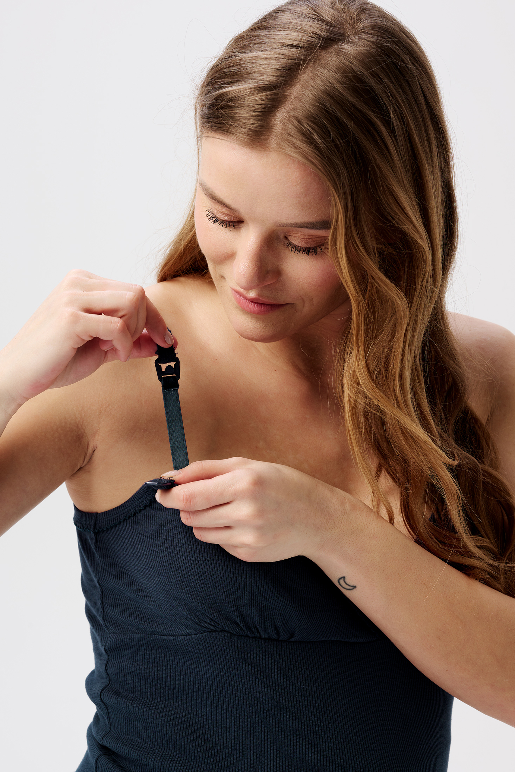 Organic Ripp Umstands- und Stilltop aus feiner Bio-Baumwolle. Perfekt für warme Tage, da es ärmellos ist und aus weichem, angenehmem Material besteht. Der elegante Cache-Coeur-Ausschnitt verleiht dem Top einen femininen Look. Die praktische Stillfunktion, ist diskret in das Design integriert. Indem du den Stoff beiseite schiebst, kannst du bequem und unkompliziert stillen, ohne das Top vollständig ausziehen zu müssen. Farbe: navy