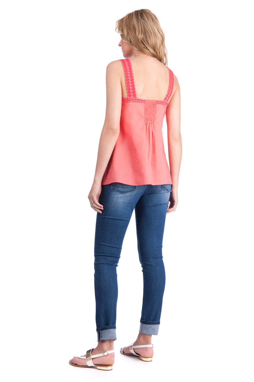 Umstandstop mit Strickereien am V-Ausschnitt und an den Armausschnitten sowie mit kleinen Raffungsdetails. Am Rücken hat das Top einen elastischen, gesmokten Einsatz, sodass das Top sich während der Schwangerschaft ideal an deine Figur anpasst. Farbe: koralle
