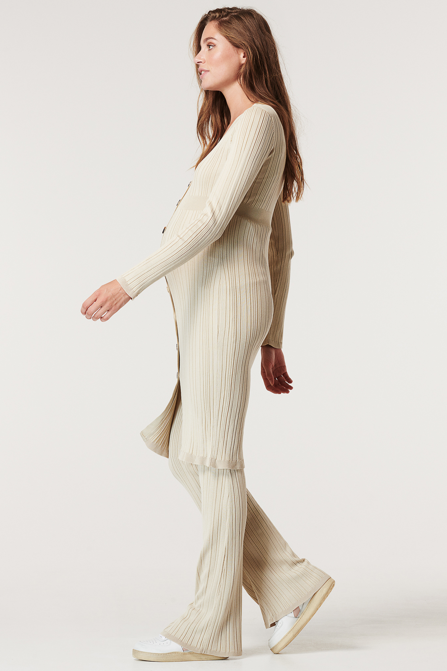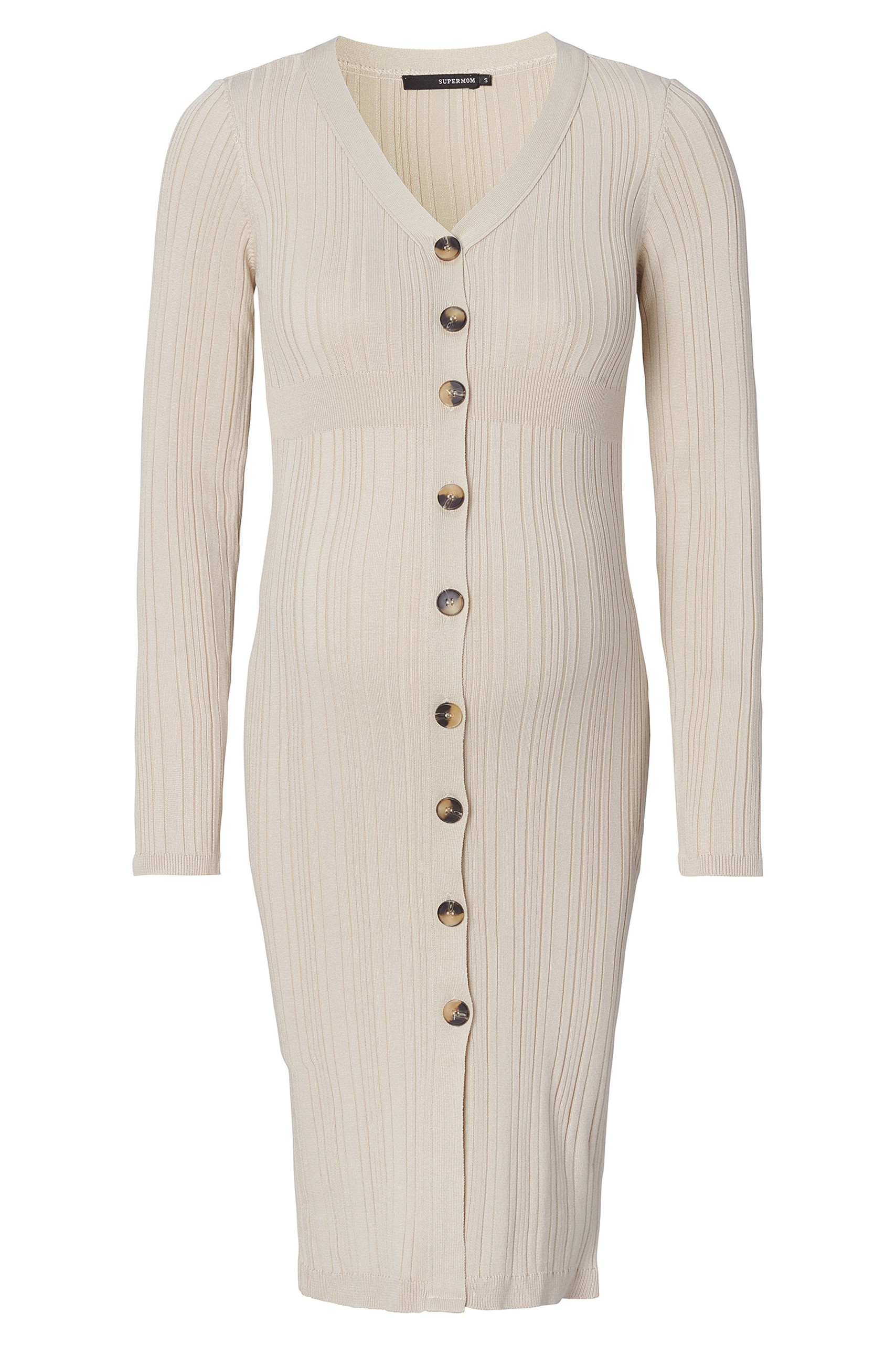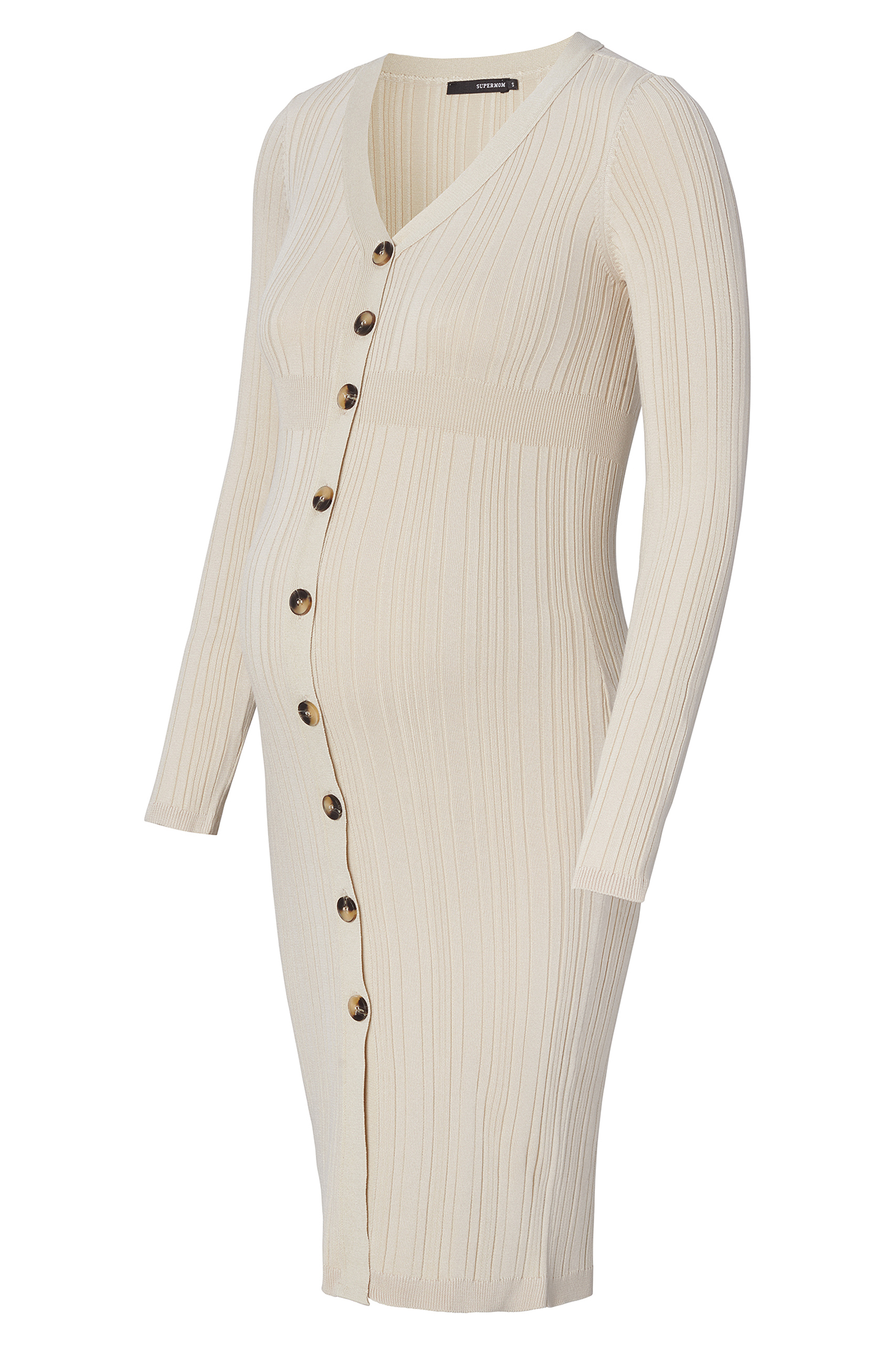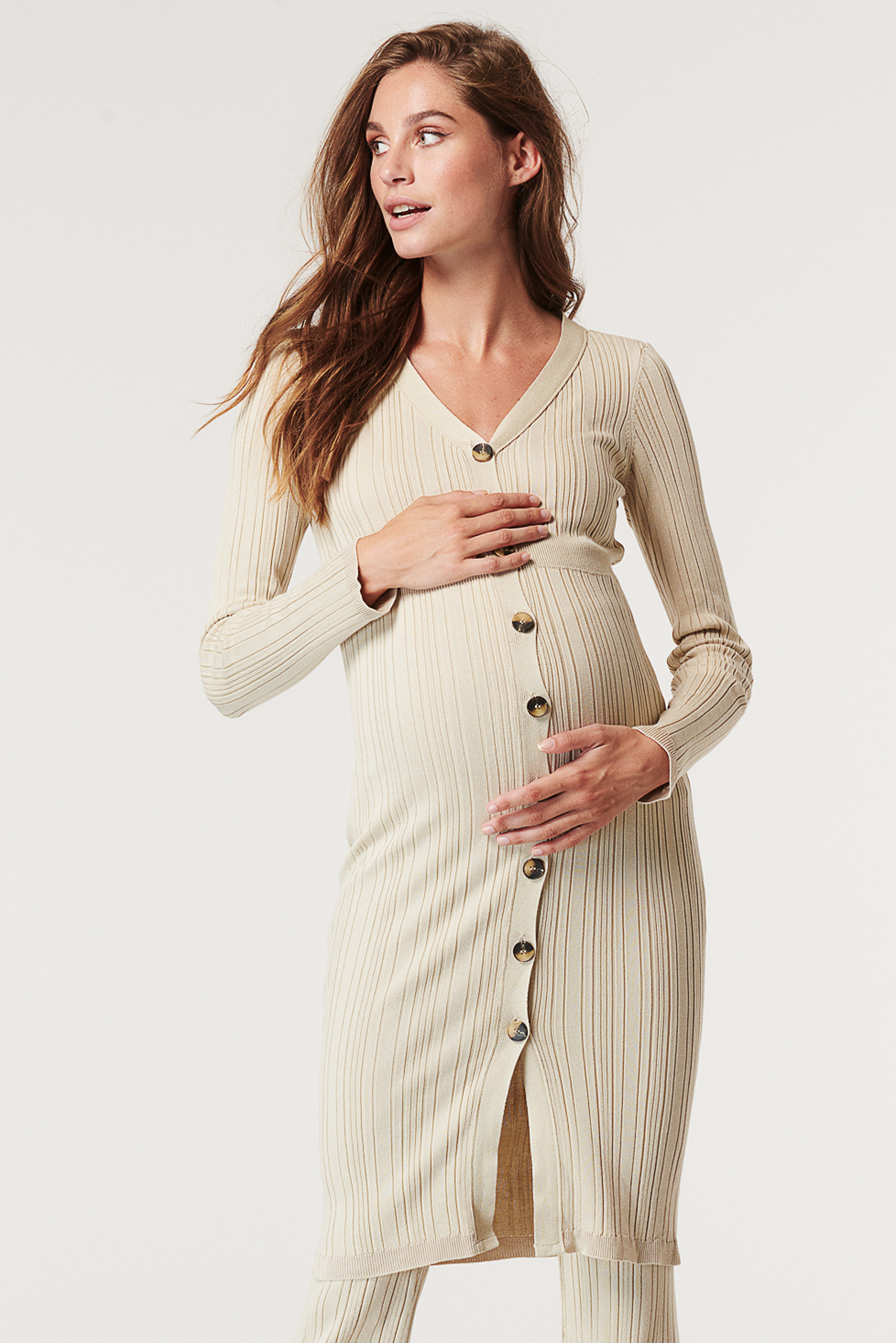 Extralang geschnittener Umstandscardigan aus weichem Rippstoff. Bei geschlossener Knopfleiste liegt der Cardigan schön eng an und betont deinen Babybauch ganz besonders toll. Gleichzeitig ist er dehnbar genug, um ihm ausreichend Platz zu lassen. Eine weitere Tragevariante wäre, die Knöpfe ab der Taille offen zu lassen, sodass die Jacke an dein Seiten deines Bauchen herunterfällt. Nach der Geburt kannst du den Cardigan auch als reguläre Strickjacke weitertragen. Farbe: sand