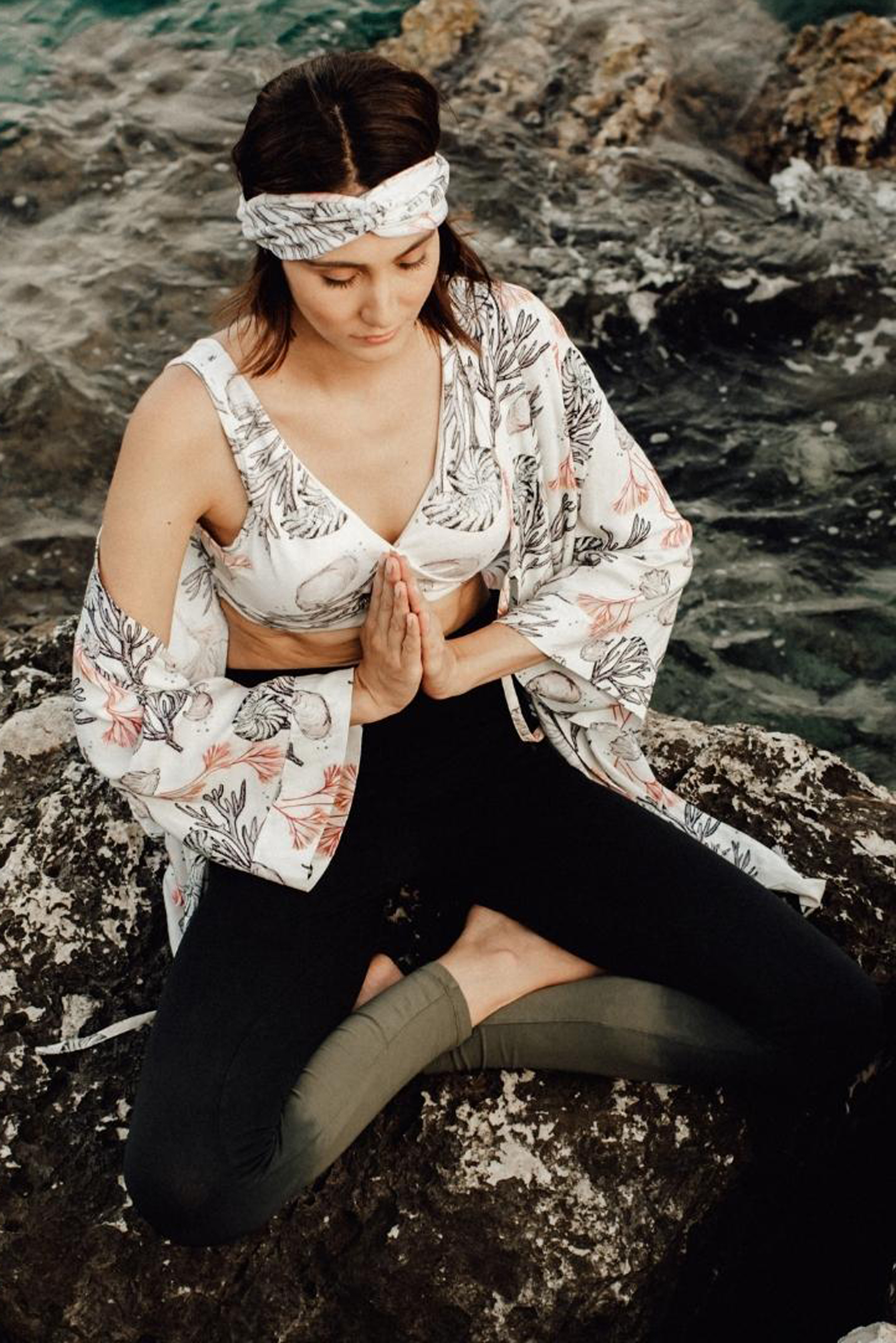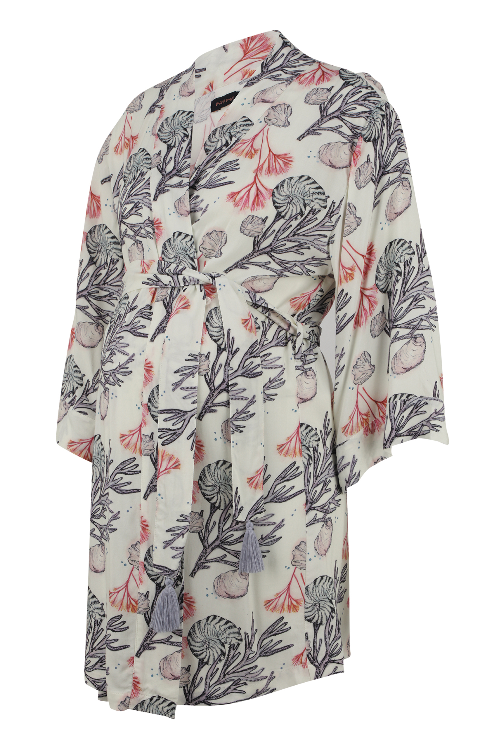 Außergewöhnlicher Umstandskimono mit tollem Korallen Print und Bindegürtel mit Quasten. Das Kimono-Oberteil wurde unter fairen Arbeitsbedingungen hergestellt und aus softer Viskose gefertigt. Farbe: off-white print